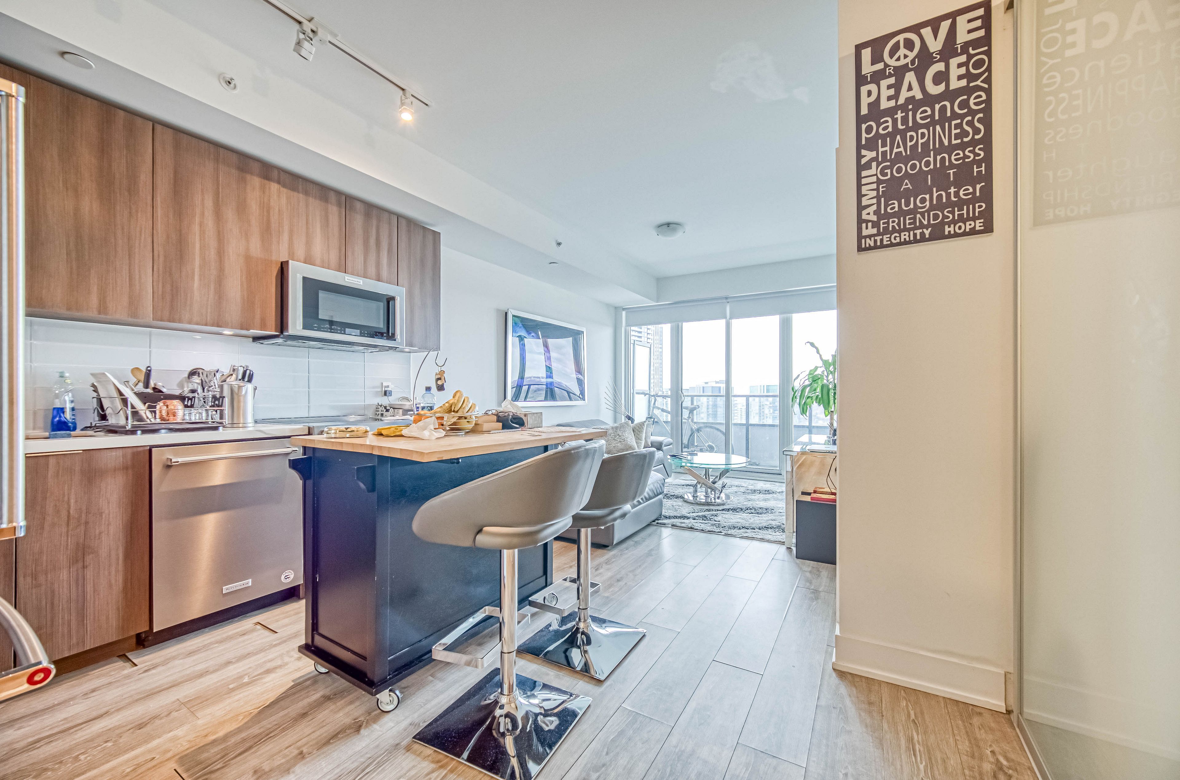 Welcome to eau du soleil sky tower! This stylish unit boasts a bright and inviting living room with floor-to-ceiling windows that fill the space with natural light, perfect for relaxing or entertaining. The open-concept kitchen is equipped with modern stainless steel appliances, ample counter space, a centre island and sleek finishes, making it both functional and elegant. A master bedroom with mirror doors closet, floor-to-ceiling windows and a large den, with sliding doors, that can easily be used as a second bedroom or office and laminate flooring throughout. The living room has a walk-out to a spacious balcony to enjoy stunning views, with electric bbqs allowed. With upgraded finishes and a functional design, this unit offers comfort and style for everyday living. Located steps away from the waterfront and marinas, enjoy the serene beauty of lake ontario. Explore scenic nature trails, perfect for walks or bike rides, and discover a variety of restaurants and cafes nearby for dining and leisure. Don't miss this incredible opportunity to embrace luxury living in a prime location! Book your viewing now!