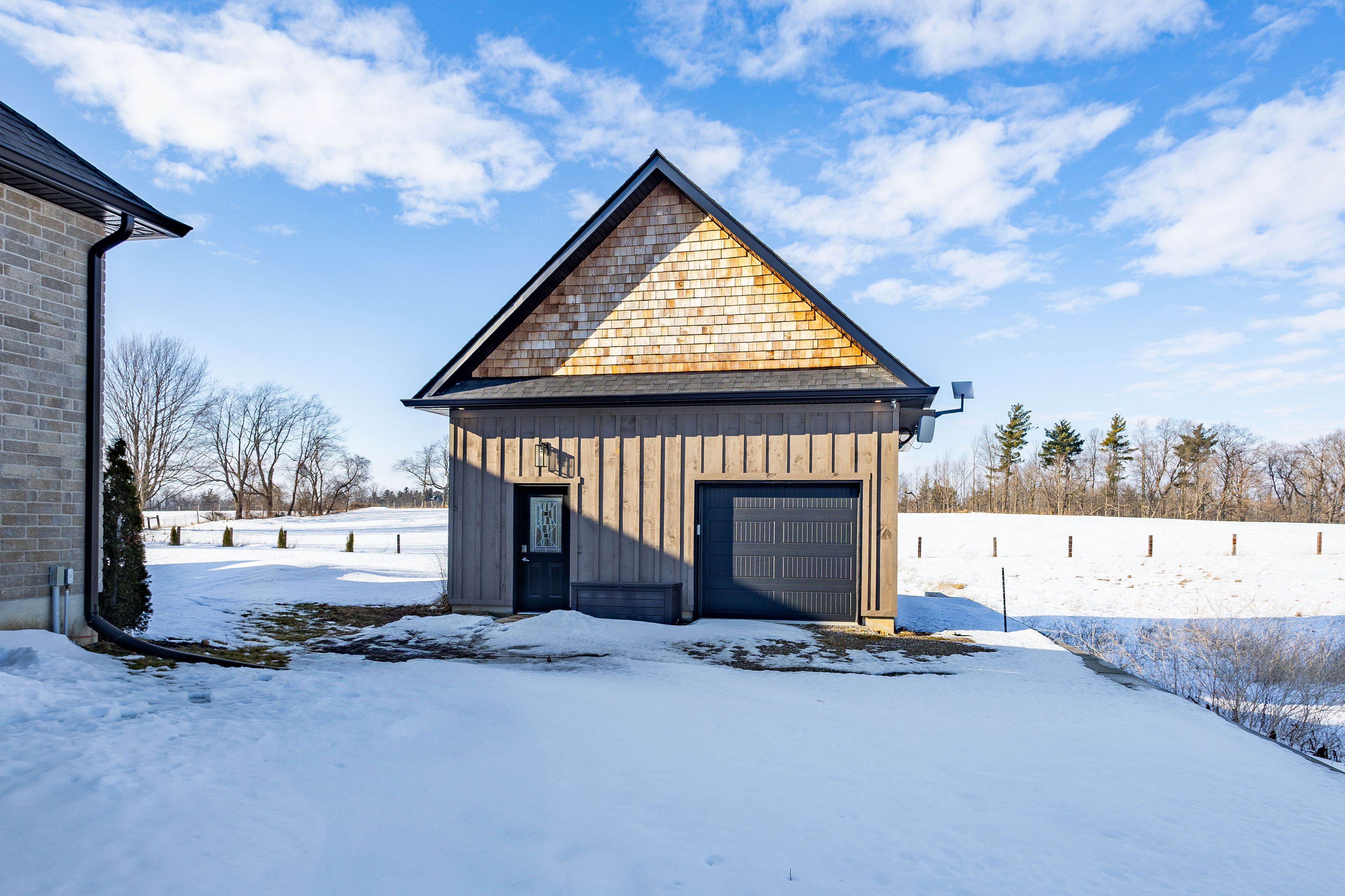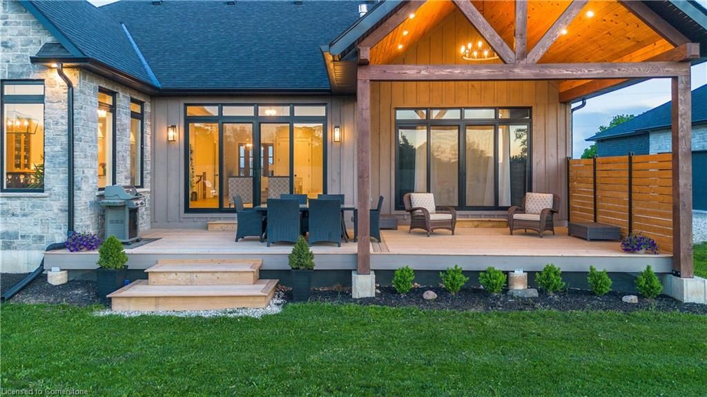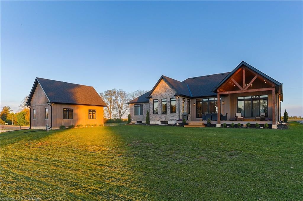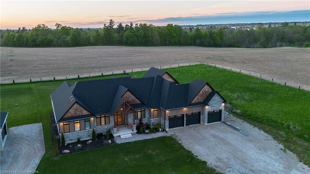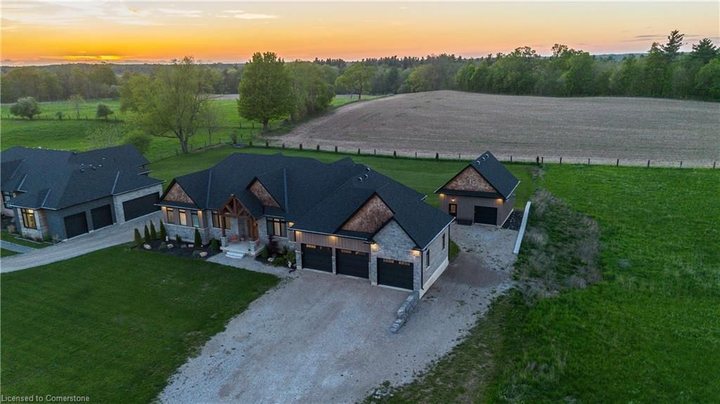This exceptional custom bungalow presents a rare opportunity to own a home that simply cannot be replicated today. Built with uncompromising quality from the studs to the final finishes, every detail reflects thoughtful design, superior craftsmanship, and long-term durability. Offering over 3,000 sq. Ft. Of beautifully curated living space, this home is set on a sprawling lot backing onto peaceful farmland, delivering unobstructed sunset views and exceptional privacy. Inside, the bright, open-concept layout is enhanced by wide-plank white oak flooring, soaring ceilings, and elegant, timeless finishes throughout. The chef-inspired kitchen blends style and function with quartz countertops, premium appliances, designer lighting, and a fully equipped butler's pantry with sink, fridge, and extensive storage. The great room is a true showpiece featuring cathedral ceilings, a striking fireplace, and custom millwork-ideal for both entertaining and everyday living. The primary suite offers a luxurious retreat with a spacious walk-in closet and spa-inspired 5-piece ensuite complete with soaker tub and high-end finishes. Three additional generously sized bedrooms each include their own private ensuite, providing comfort and privacy for family or guests. A convenient main-floor laundry room adds to everyday functionality. The lower level is already drywalled with 9 ft ceilings and includes an additional room and insulated workshop, offering a strong foundation for future customization. Outdoors, enjoy a covered rear porch overlooking the expansive backyard and serene countryside setting-perfect for relaxing or entertaining. The oversized triple-car garage and separate 500 sq. Ft. Workshop provide exceptional space for vehicles, hobbies, or storage. A rare blend of quality, design, and setting, this home delivers outstanding value at its new price point.
