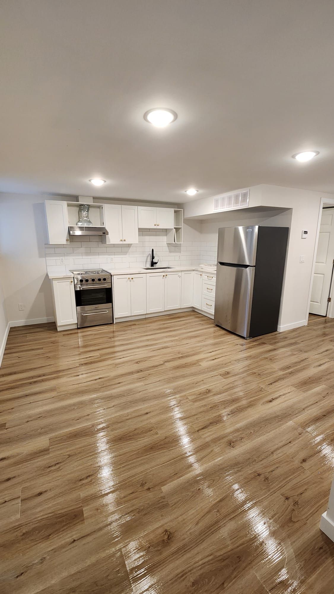 • Open concept living area with modern kitchen and stainless steel appliances.