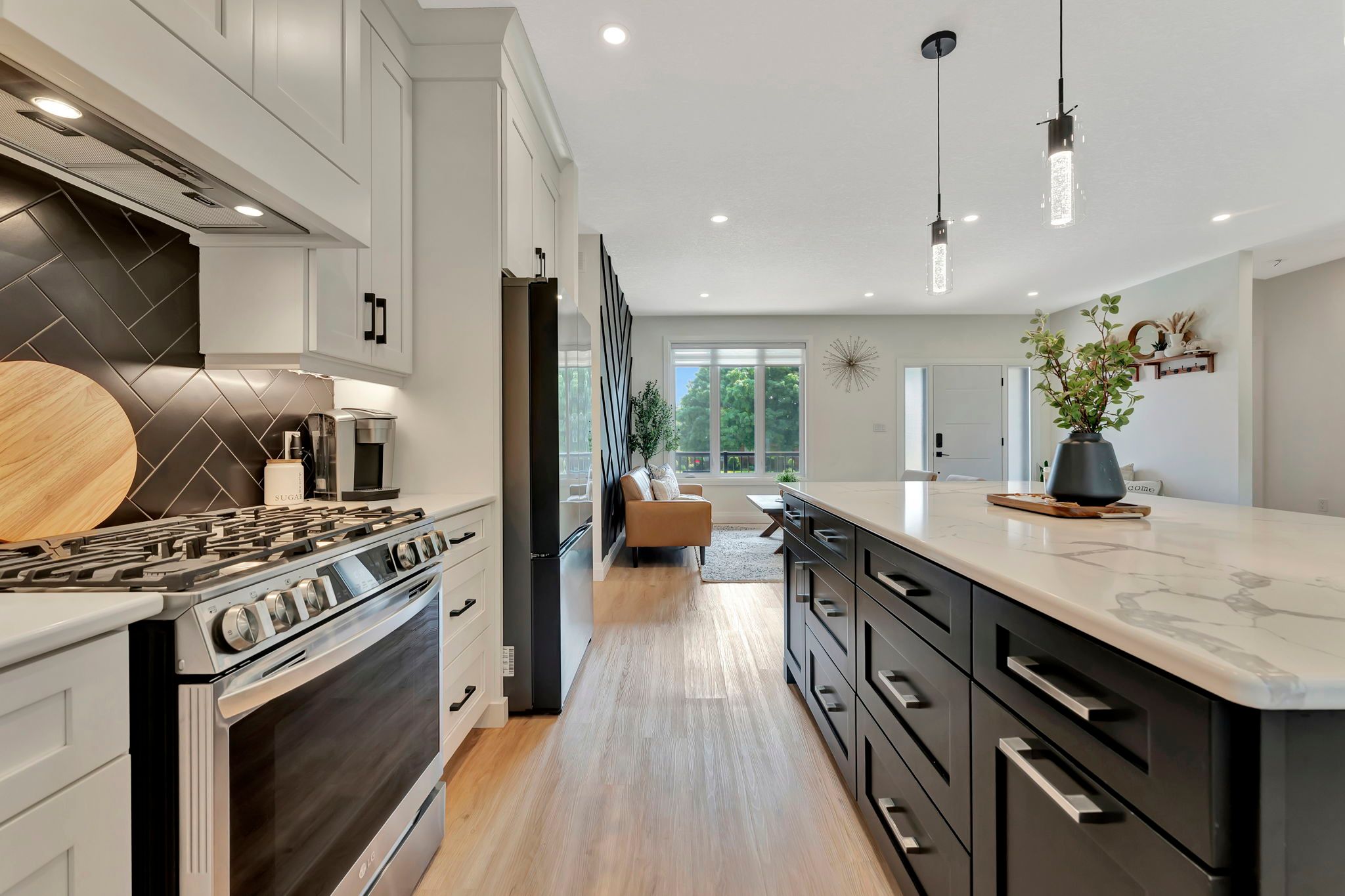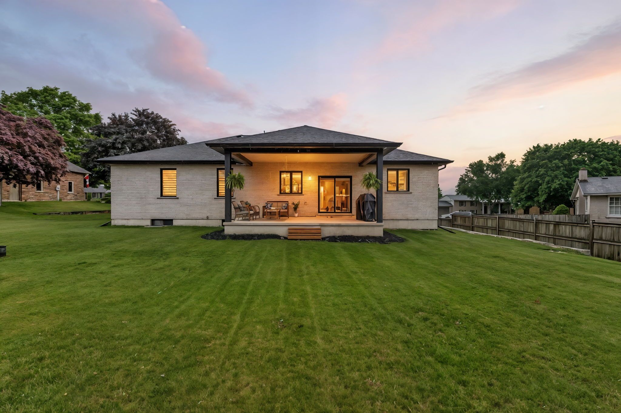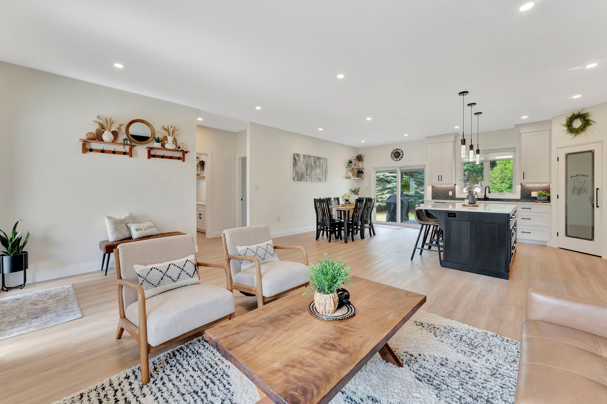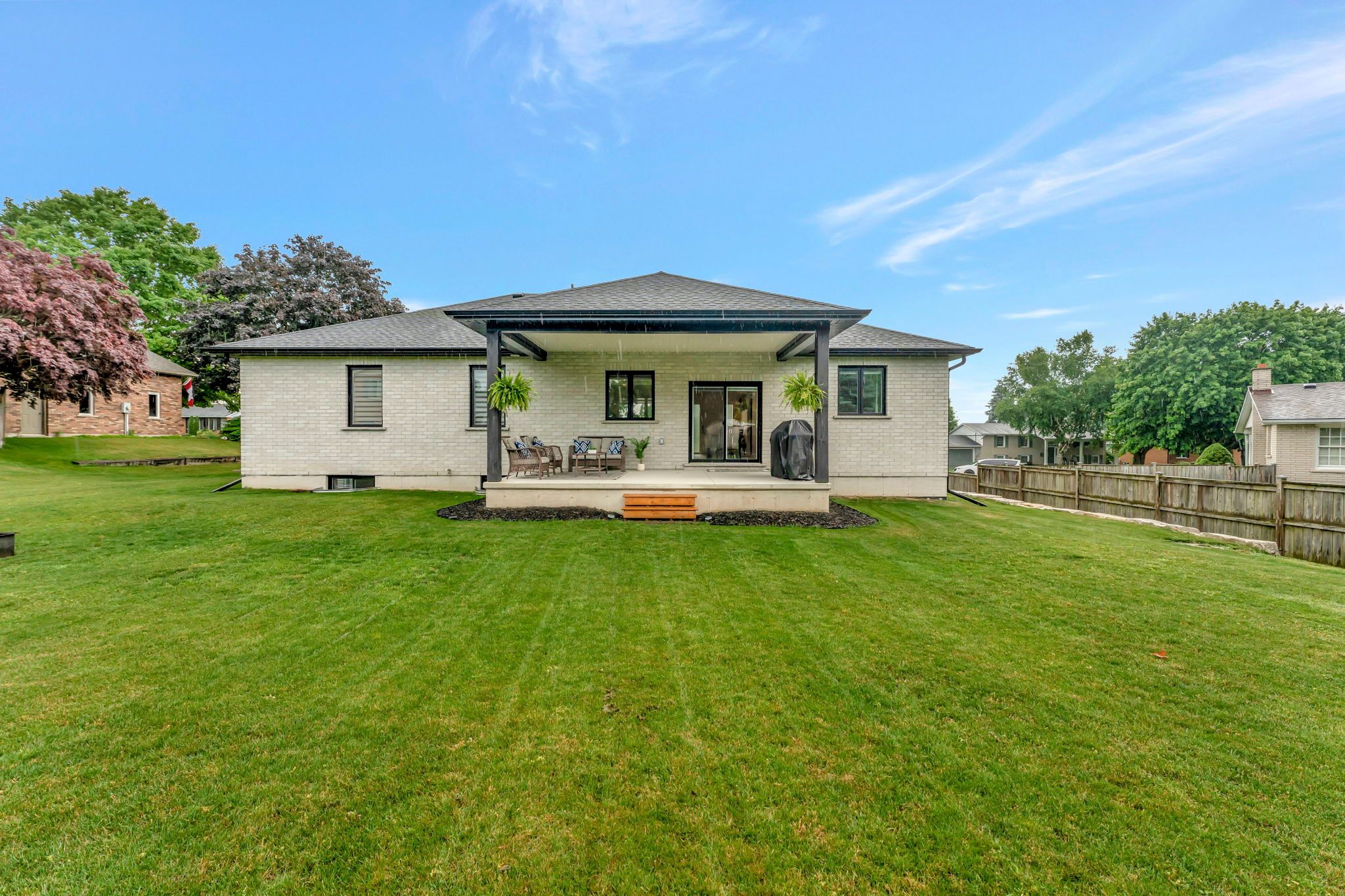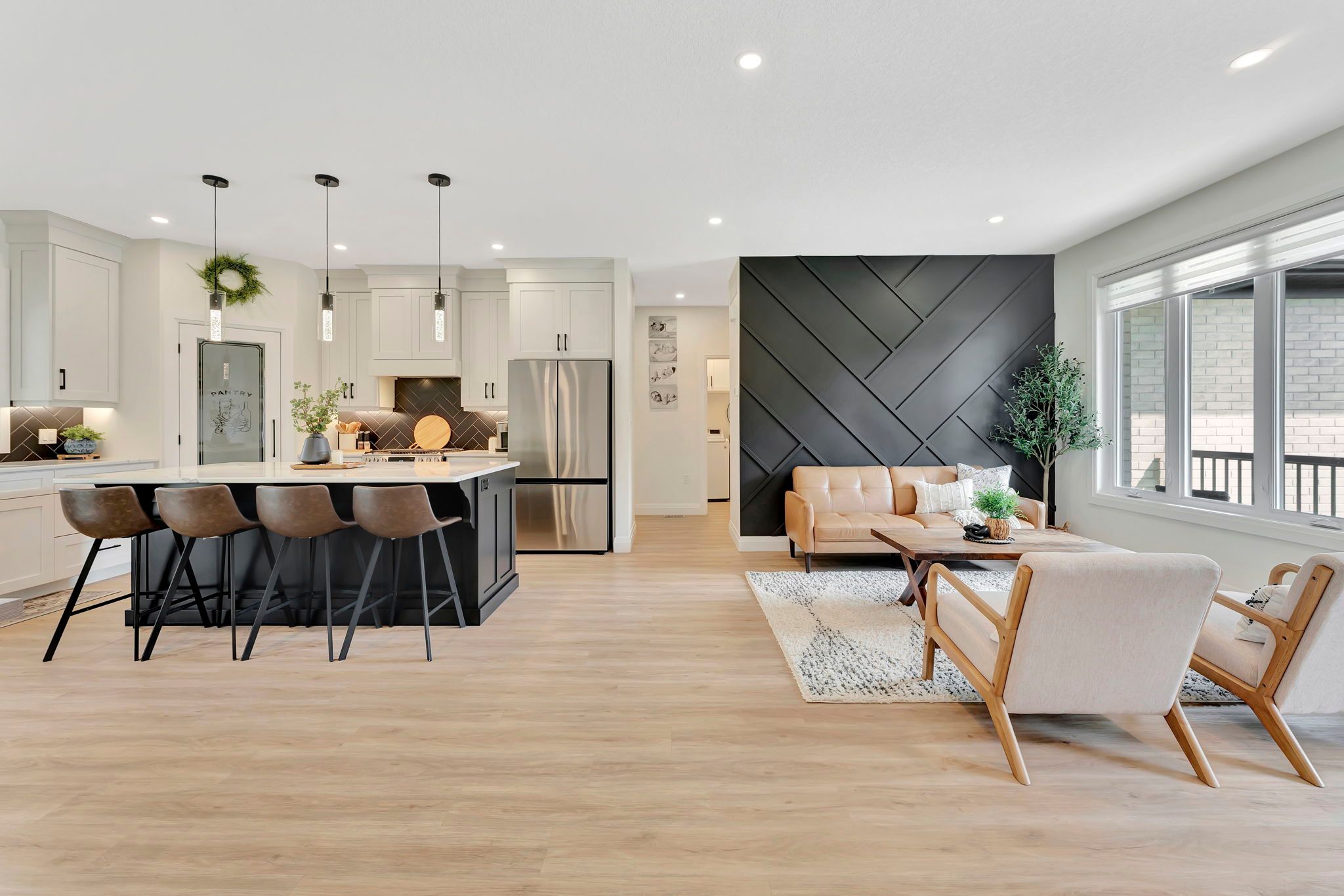 Wrapped in a striking blend of brick and hardy board, the exterior of this luxury bungalow is beautifully illuminated by soft exterior pot lighting, while a wrapped in a striking blend of brick and hardy board, while a spacious triple car garage offers both curb appeal and everyday functionality. A charming covered front entry sets the tone with timeless character, leading into a bright, welcoming foyer where natural light streams through elegant double sidelights. Inside, the home opens to a stunning, open-concept layout with rich flooring that flows seamlessly throughout the main level. The living room stands as a warm and inviting focal point, anchored by a sophisticated accent wall that adds texture and depth to the space. At the heart of the home is a chef-inspired white kitchen, highlighted by a bold black-accented island and ceiling-height cabinetry that blends style with exceptional storage. A generously sized walk-in pantry enhances both function and flow. Adjacent to the kitchen, the dining area offers an oversized sliding walk-out to a spacious covered patio-perfect for effortless entertaining and year-round indoor-outdoor living. The main level features three thoughtfully placed bedrooms, offering comfort and privacy for the whole family. The primary suite serves as a true sanctuary, complete with a luxurious 5-piece ensuite featuring dual vanities, a deep soaker tub, and a glass-enclosed shower. Two additional bedrooms are complemented by a beautifully appointed 4-piece bathroom, while a stylish main floor laundry room provides added convenience. Downstairs, the fully finished lower level expands your living space with two additional large bedrooms and a full bathroom-ideal for teens, in-laws, or guests. A spacious rec room offers endless versatility, whether you're envisioning a home theatre, gym, or playroom.