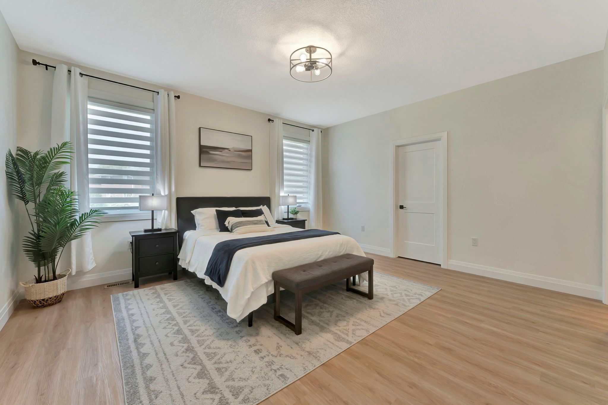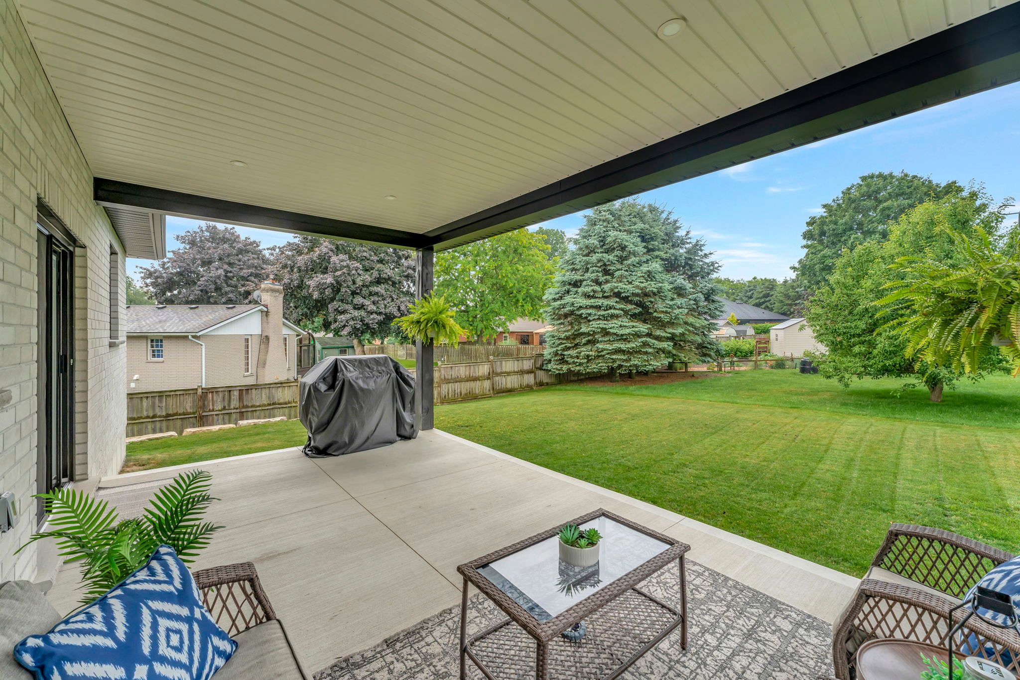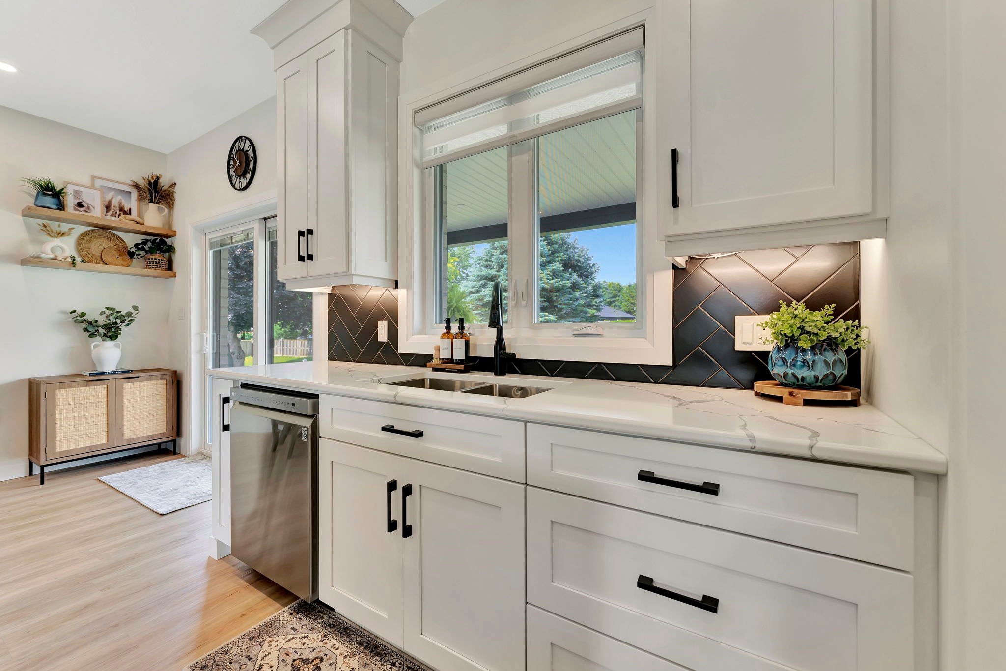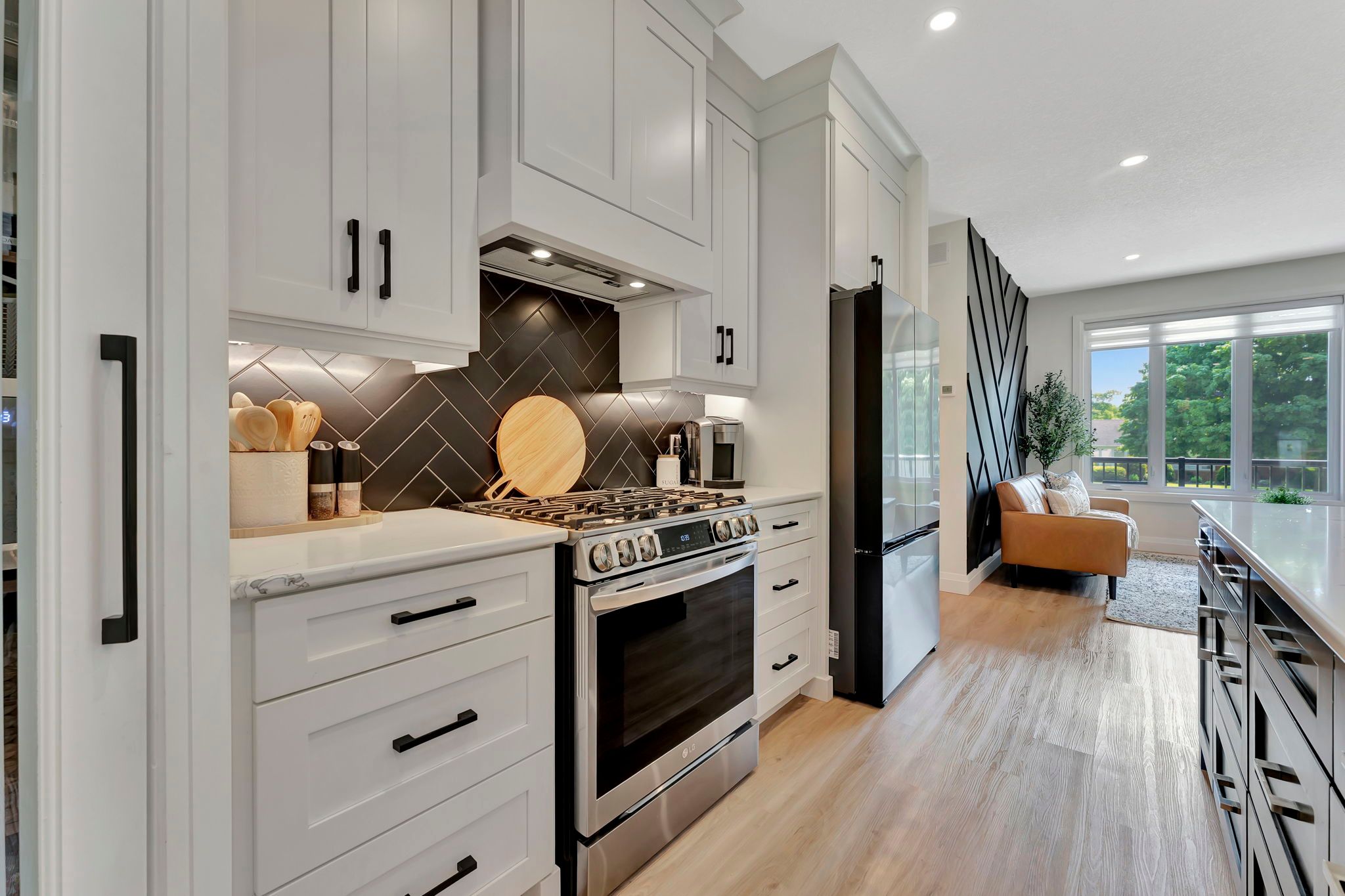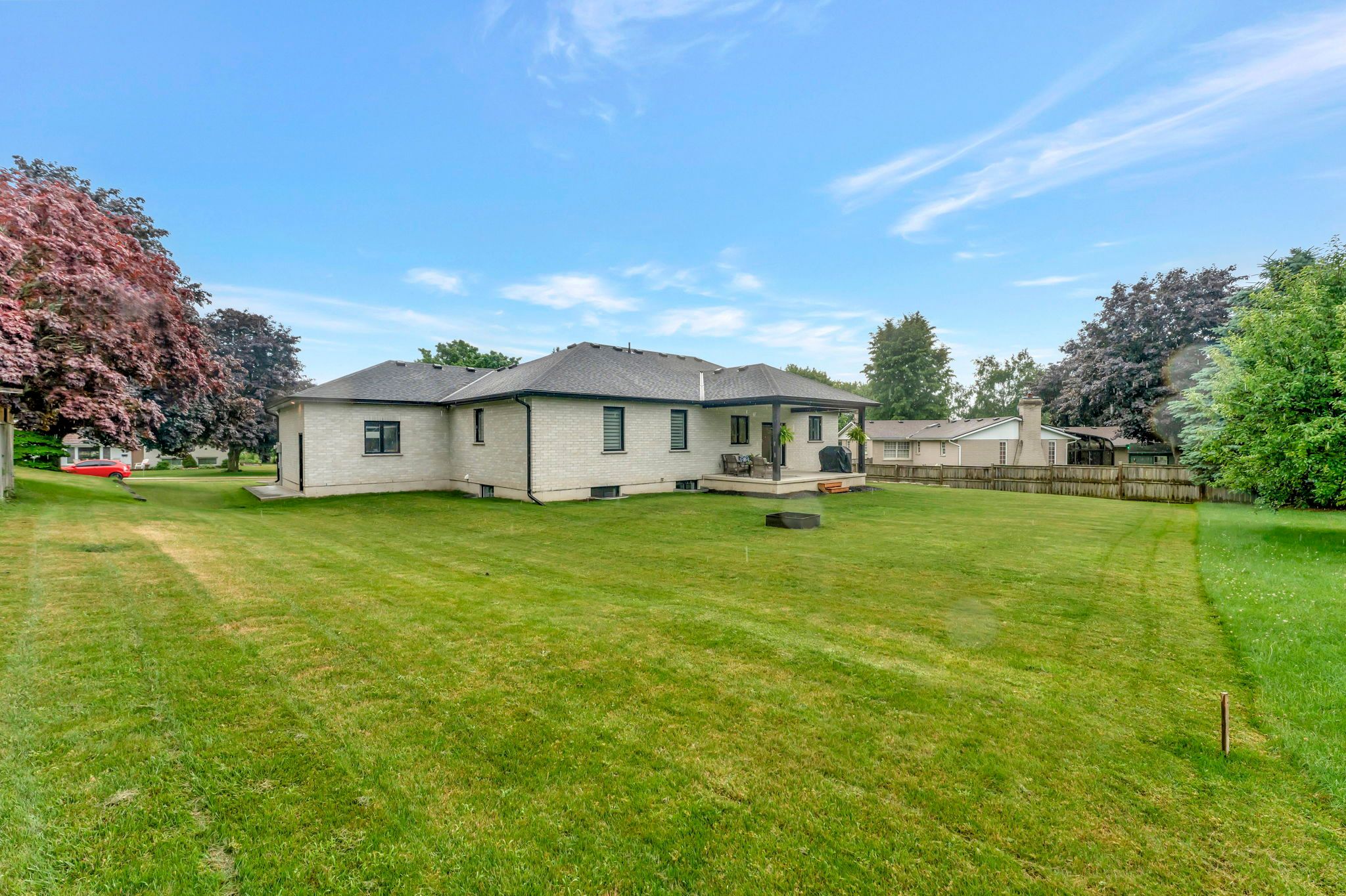Wrapped in a striking blend of brick and hardy board, the exterior of this luxury bungalow is beautifully illuminated by soft exterior pot lighting, while a wrapped in a striking blend of brick and hardy board, while a spacious triple car garage offers both curb appeal and everyday functionality. A charming covered front entry sets the tone with timeless character, leading into a bright, welcoming foyer where natural light streams through elegant double sidelights. Inside, the home opens to a stunning, open-concept layout with rich flooring that flows seamlessly throughout the main level. The living room stands as a warm and inviting focal point, anchored by a sophisticated accent wall that adds texture and depth to the space. At the heart of the home is a chef-inspired white kitchen, highlighted by a bold black-accented island and ceiling-height cabinetry that blends style with exceptional storage. A generously sized walk-in pantry enhances both function and flow. Adjacent to the kitchen, the dining area offers an oversized sliding walk-out to a spacious covered patio-perfect for effortless entertaining and year-round indoor-outdoor living. The main level features three thoughtfully placed bedrooms, offering comfort and privacy for the whole family. The primary suite serves as a true sanctuary, complete with a luxurious 5-piece ensuite featuring dual vanities, a deep soaker tub, and a glass-enclosed shower. Two additional bedrooms are complemented by a beautifully appointed 4-piece bathroom, while a stylish main floor laundry room provides added convenience. Downstairs, the fully finished lower level expands your living space with two additional large bedrooms and a full bathroom-ideal for teens, in-laws, or guests. A spacious rec room offers endless versatility, whether you're envisioning a home theatre, gym, or playroom.