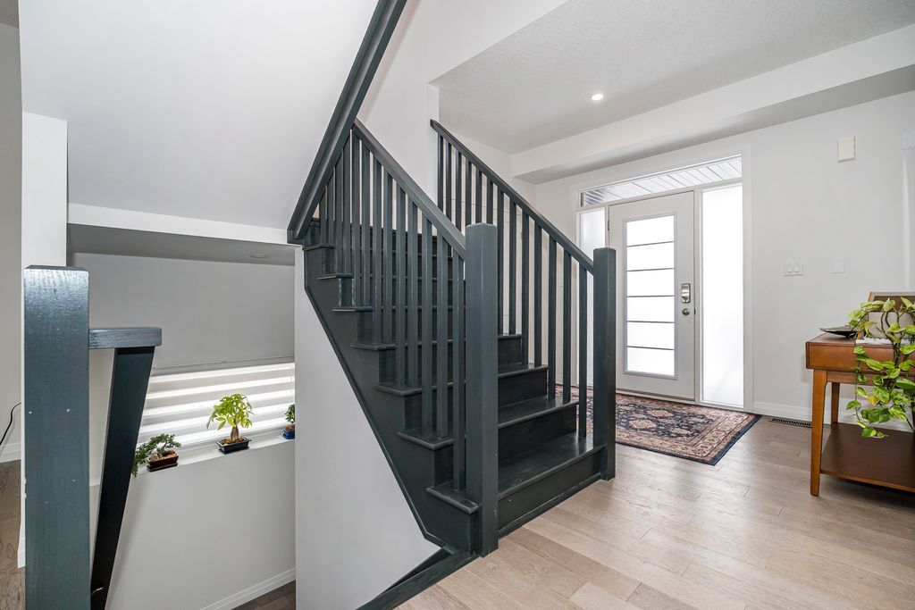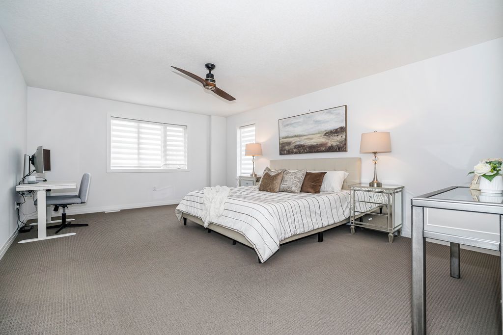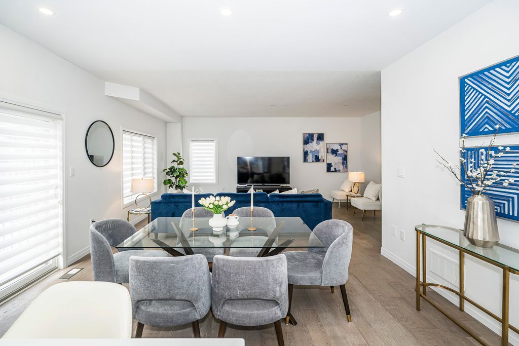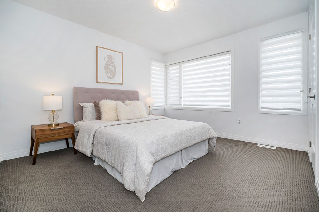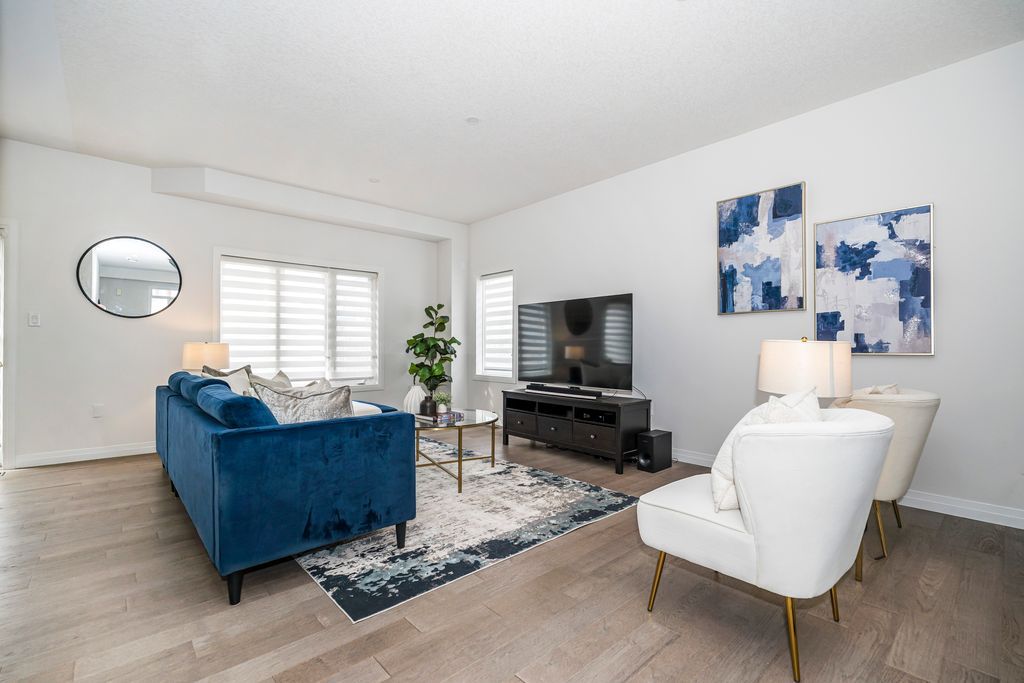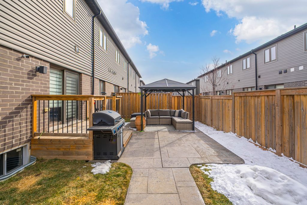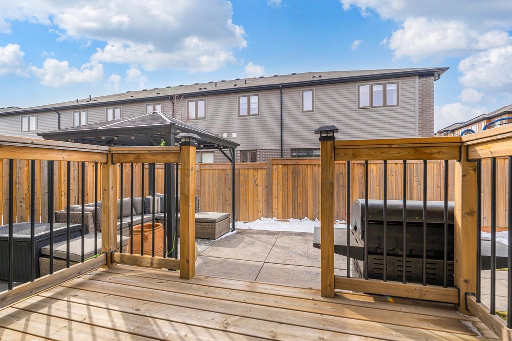 Rarely offered manhattan model offering 2,292 sq. Ft. Of luxury living. This corner townhome is surrounded by windows and flooded with natural light from every angle, offering the feel and privacy of a semi-detached home. Nestled in the vibrant community of stoney creek, this beautiful 4 bedroom home features 9-ft ceilings, pot lights, and custom blinds throughout. From the moment you enter the welcoming foyer, you'll appreciate the thoughtful layout and elevated finishes. The main floor showcases premium hickory hardwood flooring and a spacious open-concept living and dining area. The modern entertainer's kitchen is complete with stainless steel appliances, quartz countertops, extended cabinetry, an upgraded island, and a spacious walk-in pantry, seamlessly blending style and functionality. Adding to the convenience of the main level is a thoughtfully designed mudroom with ensuite laundry and direct access to the garage, along with a convenient 2 piece powder room. Upstairs, four generously sized bedrooms provide comfort for the whole family. Three bedrooms feature large walk-in closets. The primary suite is a true retreat, beautifully renovated with a spa-inspired ensuite and generous walk-in closet. Two secondary bedrooms share a convenient jack-and-jill bathroom, perfect for family living. Plush, quality berber carpet adds warmth and comfort throughout the upper level. The basement offers a fantastic opportunity to create additional living space tailored to your family's needs, whether you envision a recreation room, home gym, or teen retreat. A 3-piece bathroom rough-in is already in place, making future finishing that much easier. Step outside to your fully fenced backyard oasis - ideal for relaxing or entertaining in privacy. Experience the perfect balance of space, natural light, and modern comfort in one of stoney creek's most desirable communities, close to all major amenities including schools, parks, trails, dining, shops and quick access to highways.