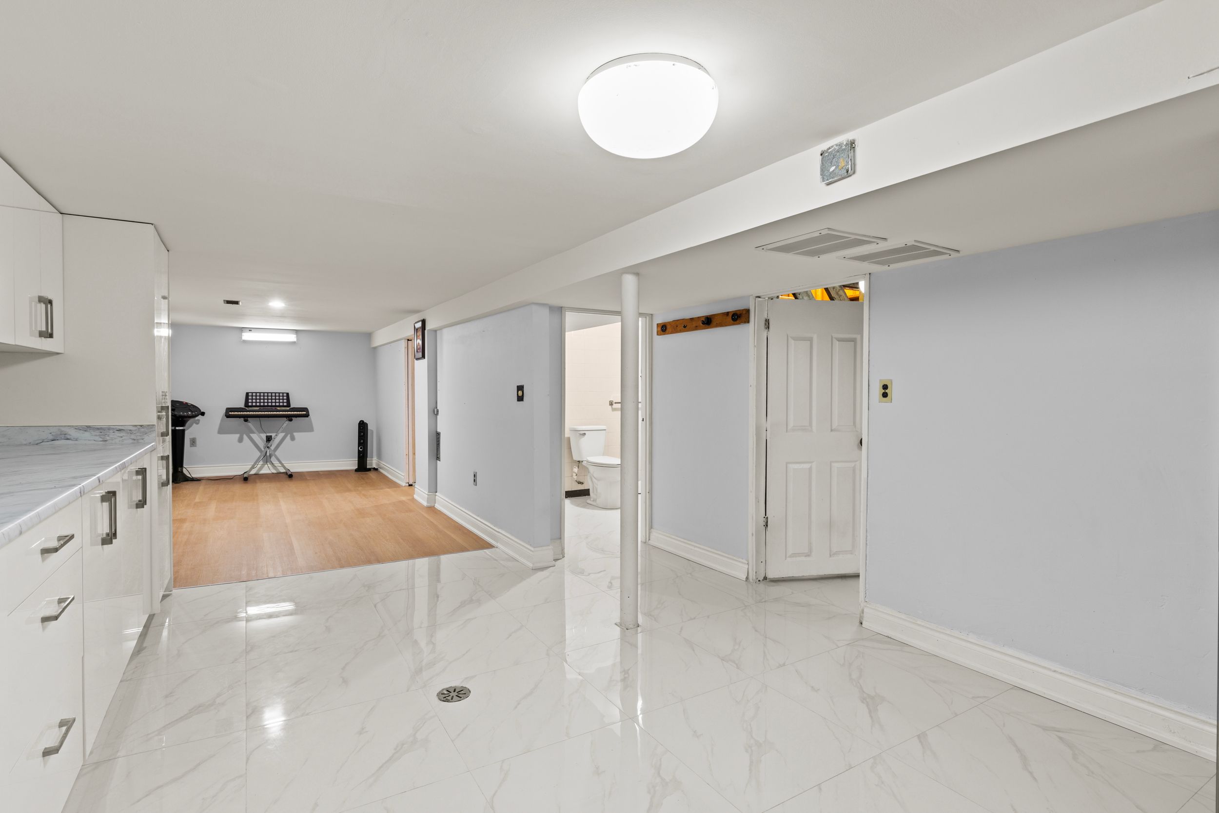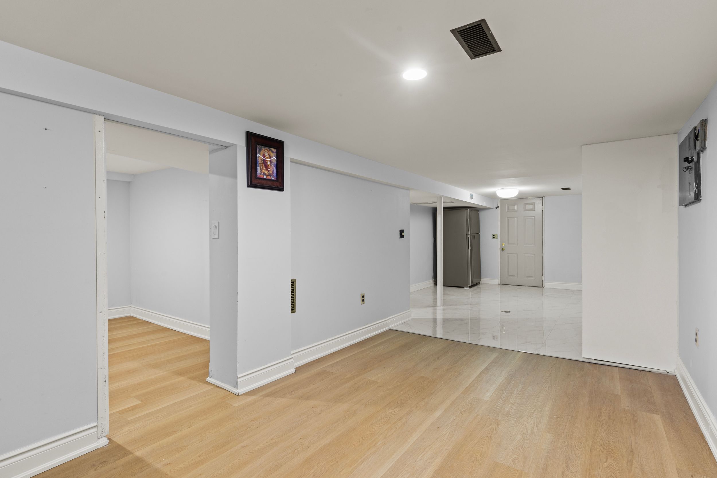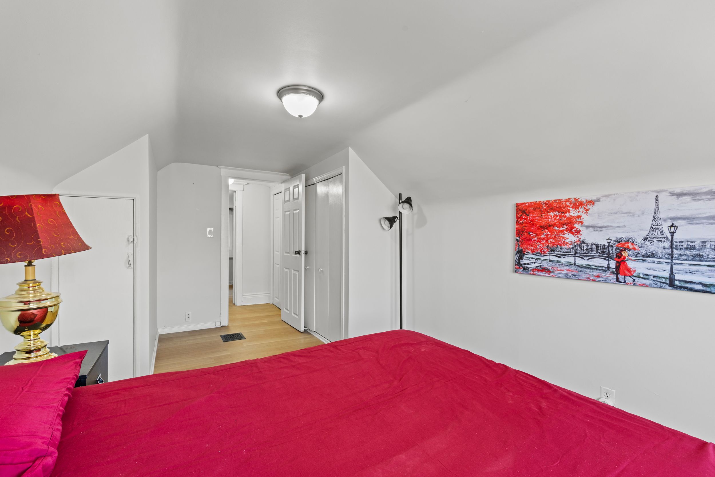 • Bright living room features classic parquet floors and cozy main-floor bedroom.