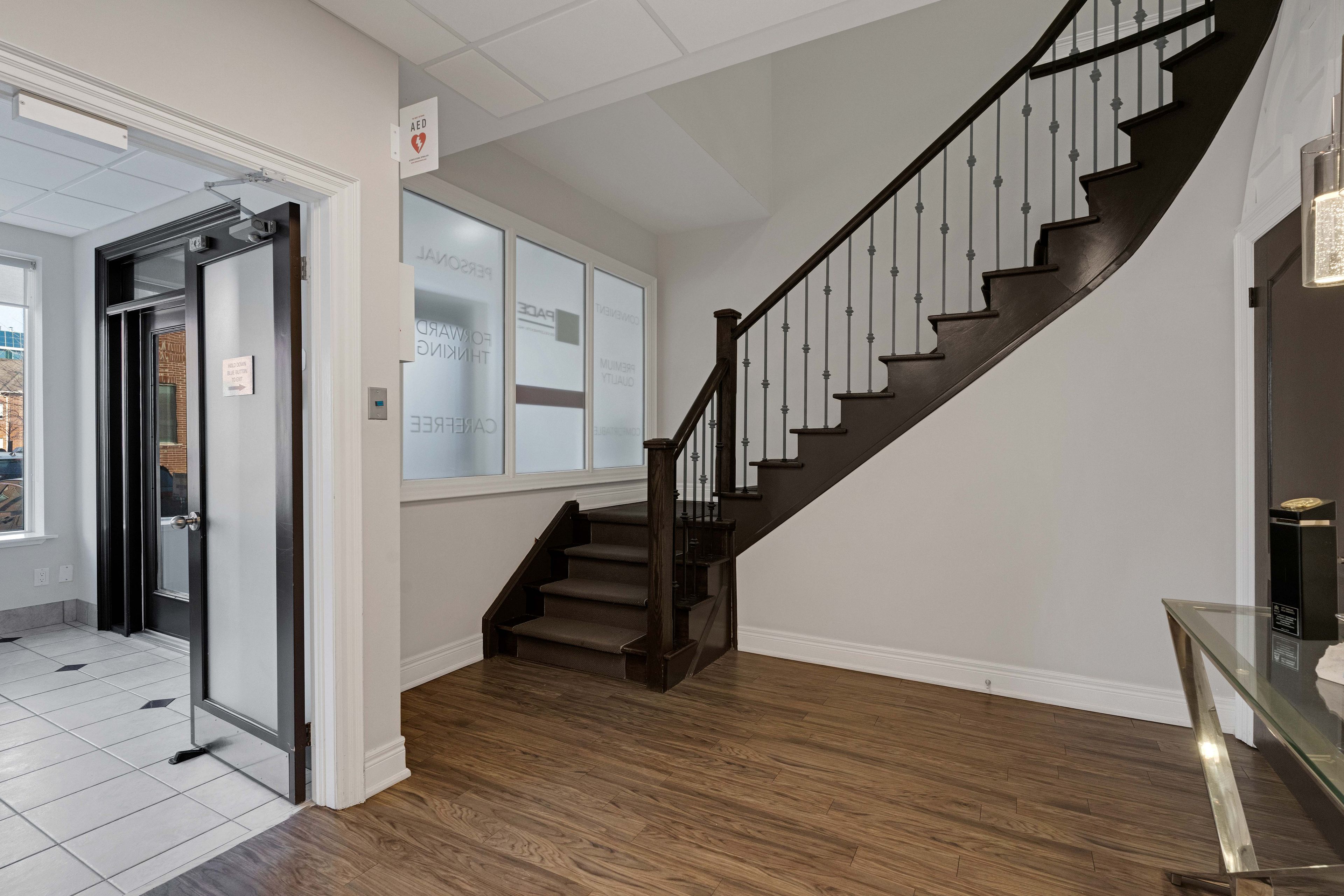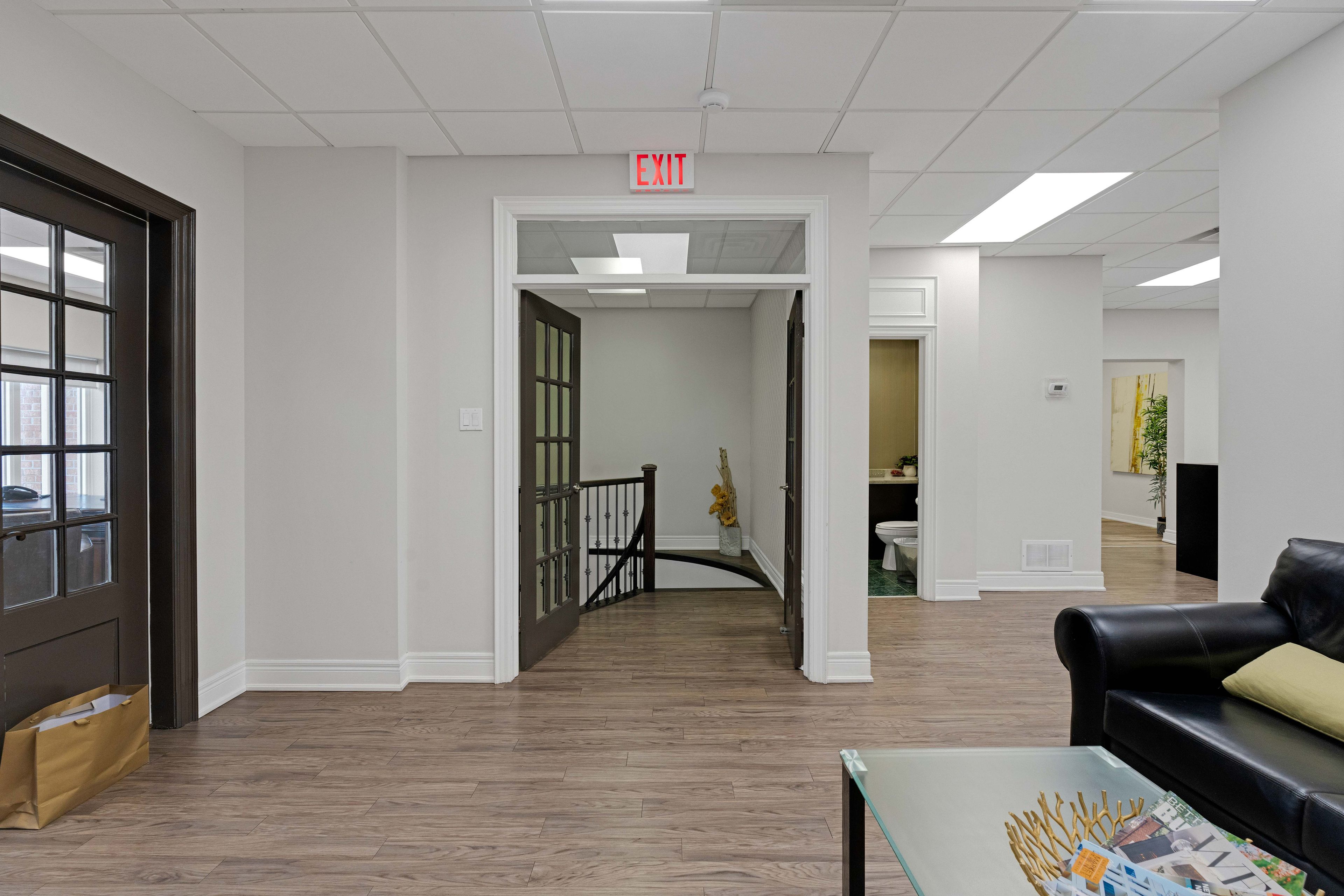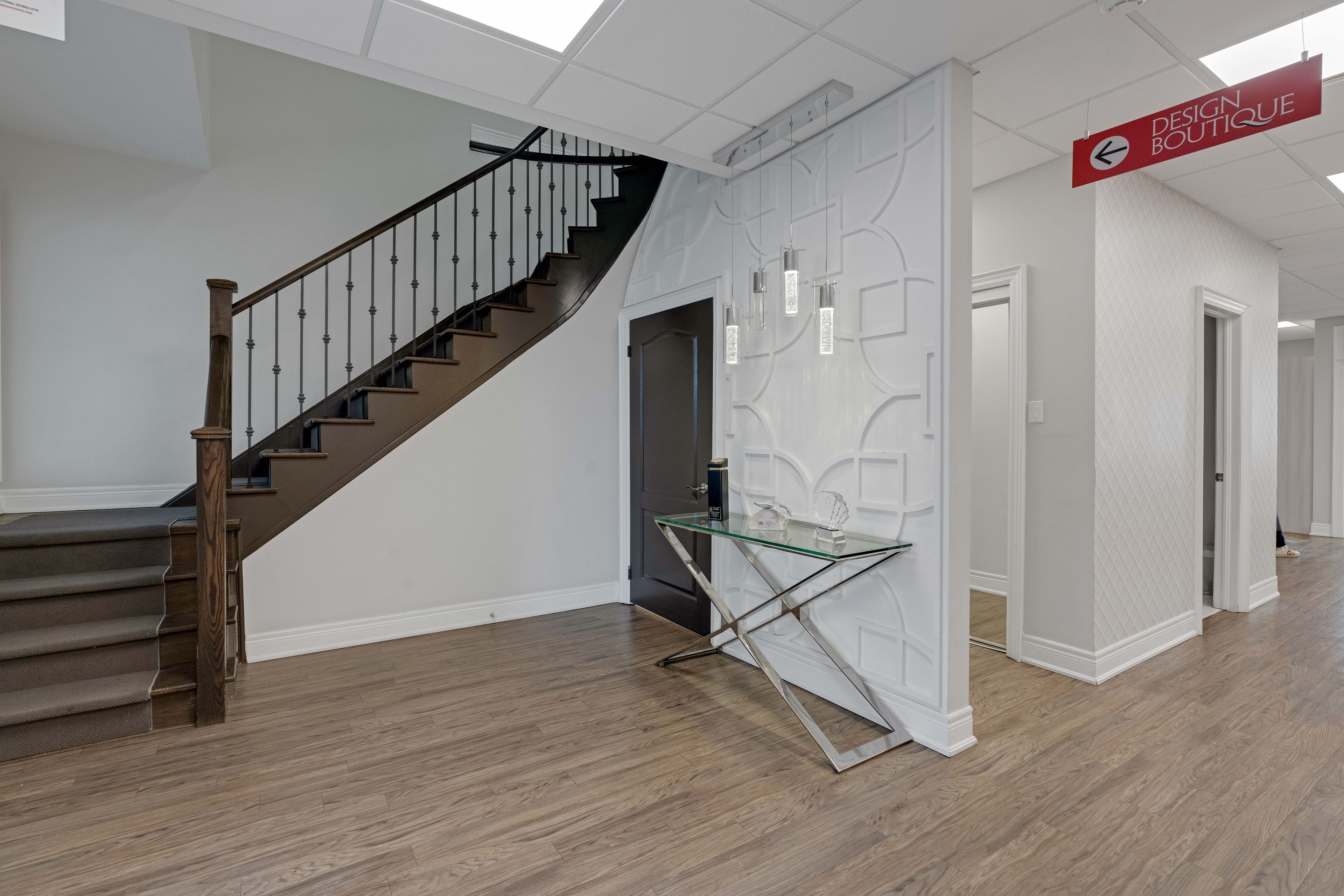 • Main floor features a reception area and an open-concept workspace.