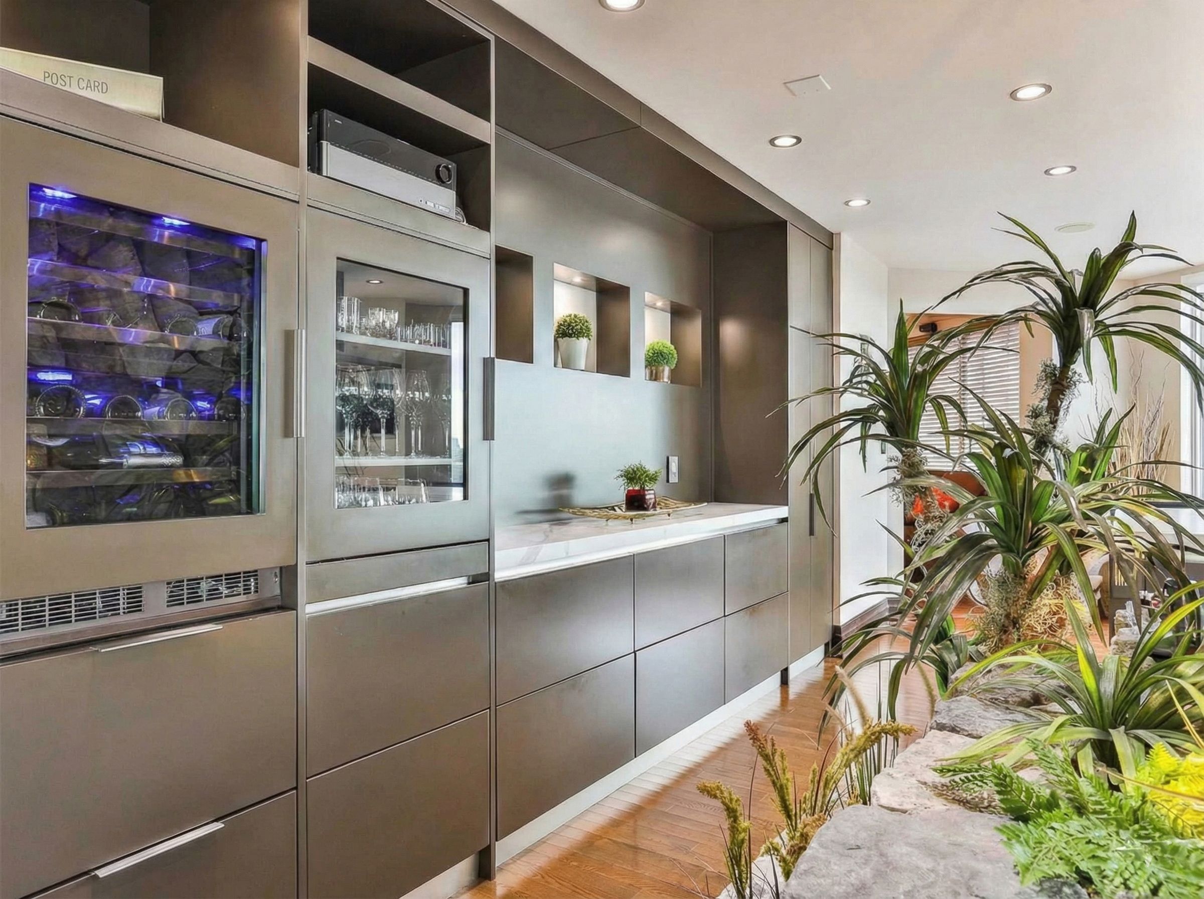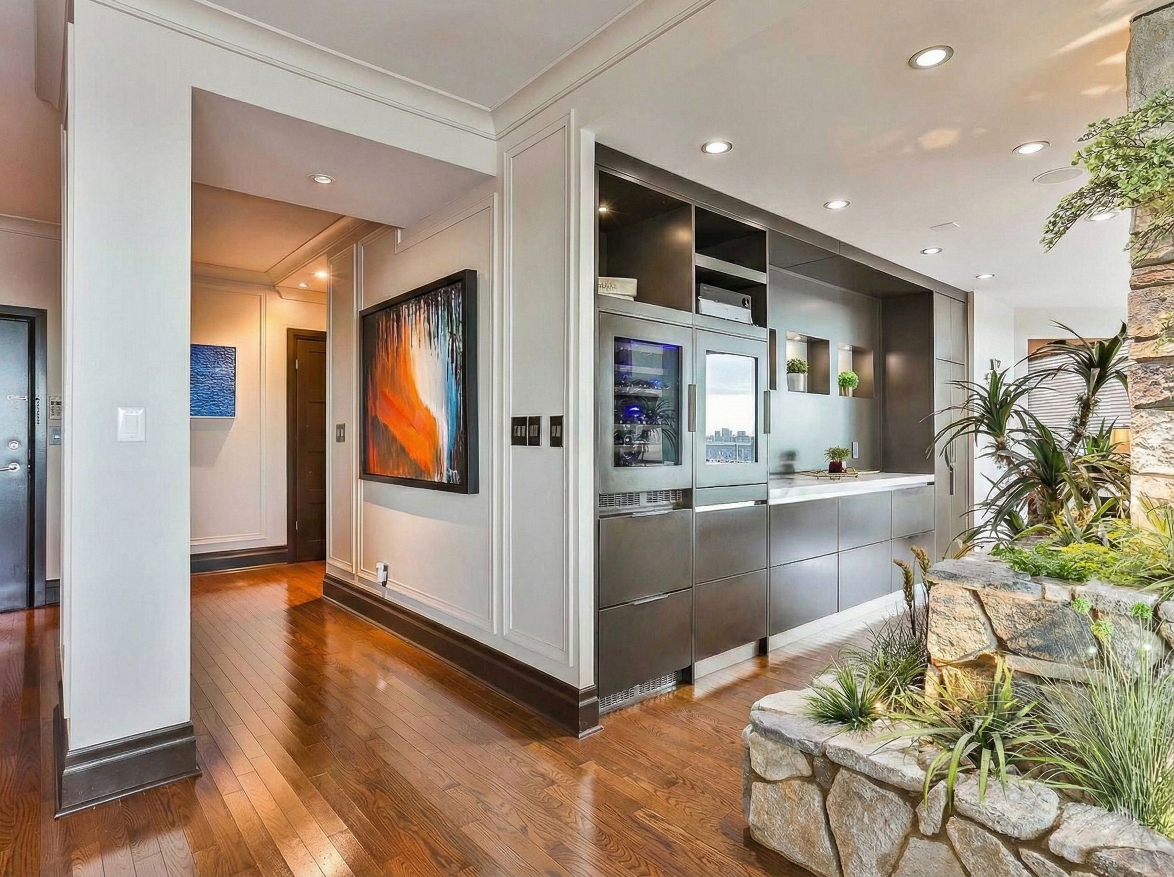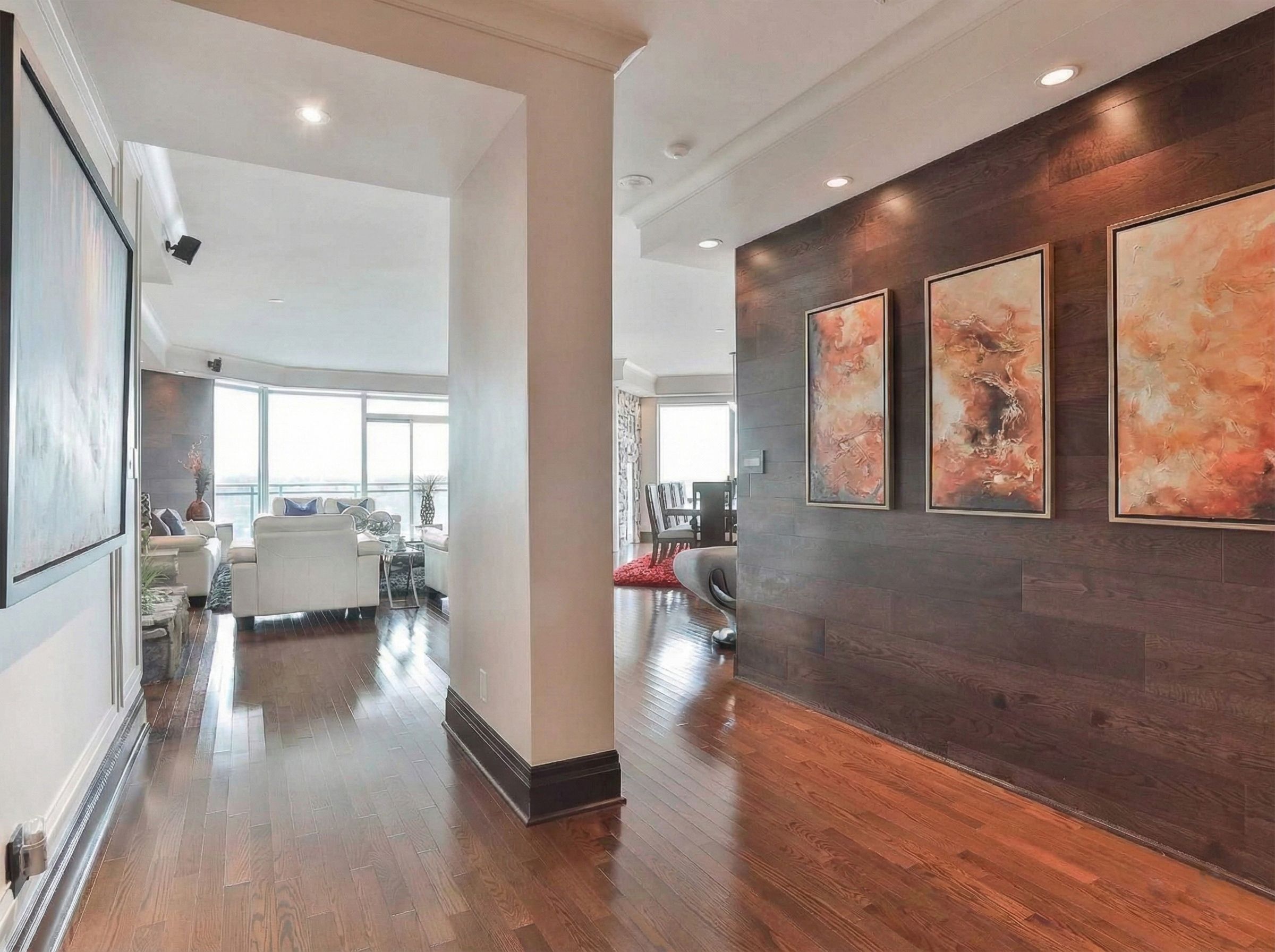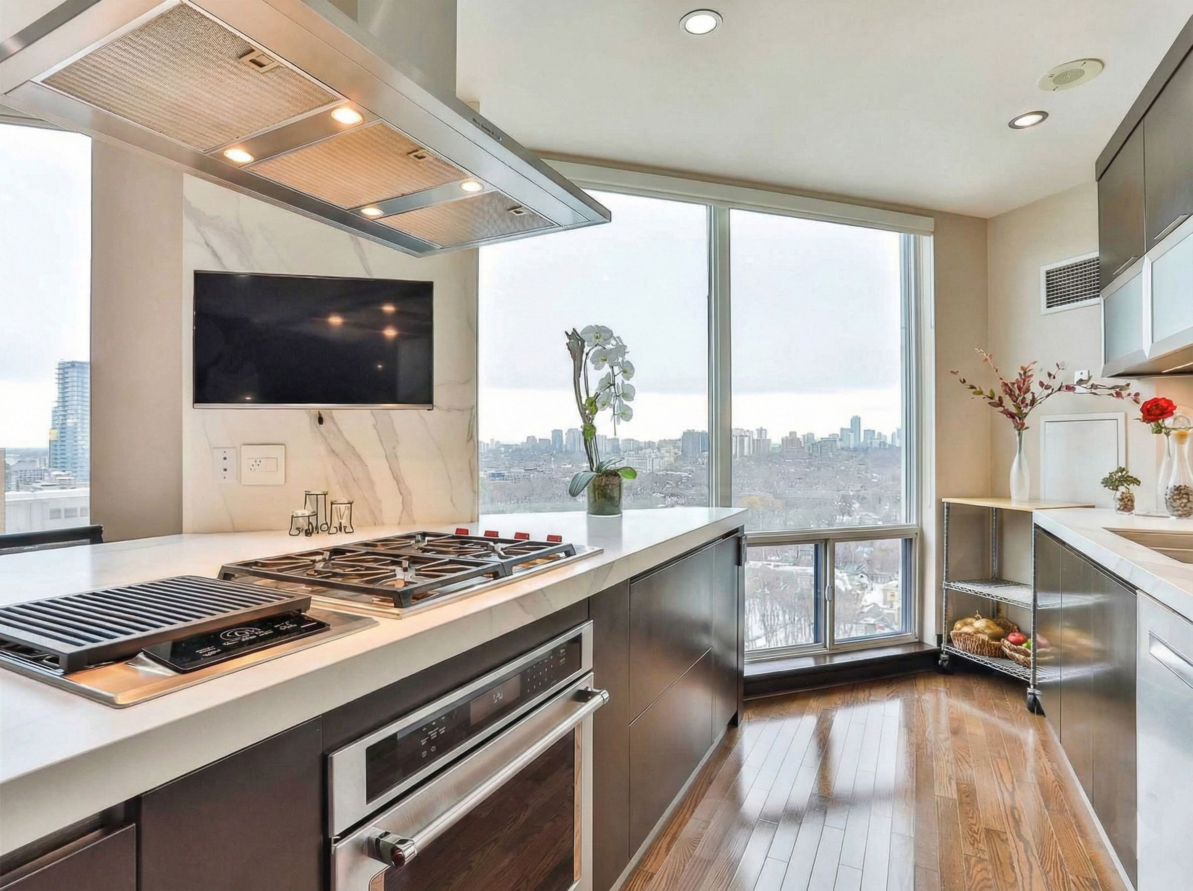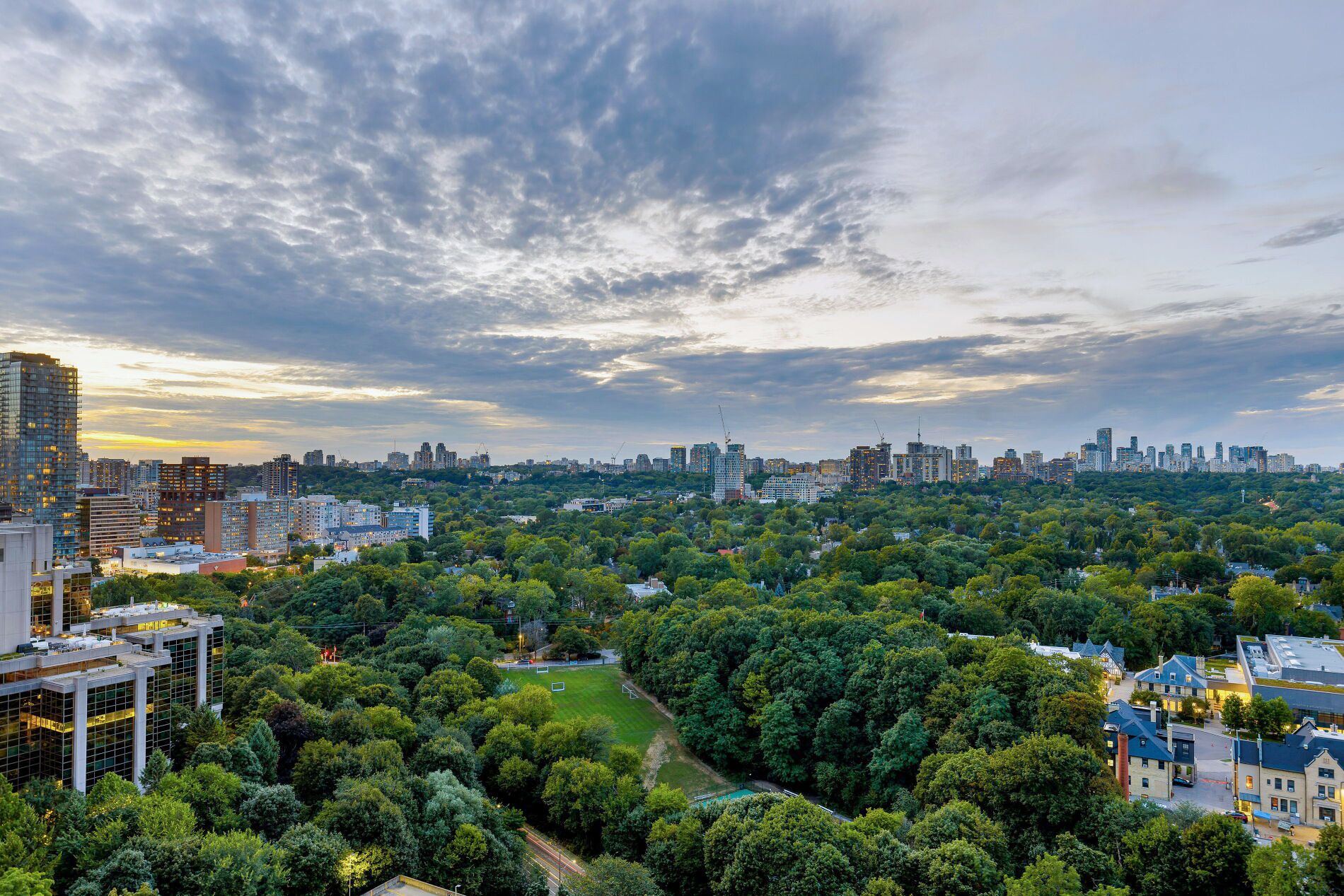 Framed by the endless green canopy of the rosedale ravine, this residence commands one of the most coveted vantage points in toronto. Spanning over 3,000 sq. Ft., it is designed with both elegance and ease in mind. Floor-to-ceiling windows flood the space with natural light, framing uninterrupted majestic views of the ravine and beyond, while travertine and custom wood-accent walls add warmth and timeless sophistication. The thoughtful split-level layout strikes the perfect balance between connection and privacy, featuring expansive principal rooms, a cozy family room with fireplace, and a chefs kitchen appointed with a wolf gas cooktop, stainless steel appliances, wine and beverage fridges, and a splendid centre island with integrated storage making meal prep effortless. A custom-designed servery enhances both everyday living and grand entertaining, while the surround-sound system and independent temperature control zones elevate comfort and convenience. New hardwood flooring throughout main living areas. The primary suite is a private retreat, with a sitting area and fireplace, a resort-worthy five-piece ensuite with jacuzzi, a walk-in closet with custom organizers, and a walkout to a private balcony. Two parking spaces with ev chargers, all-inclusive maintenance fees, and a walkable location in the heart of toronto mere steps to yorkville complete this exceptional offering. Residents also enjoy access to the indoor pool, guest suites, and an impeccable 24/7concierge.