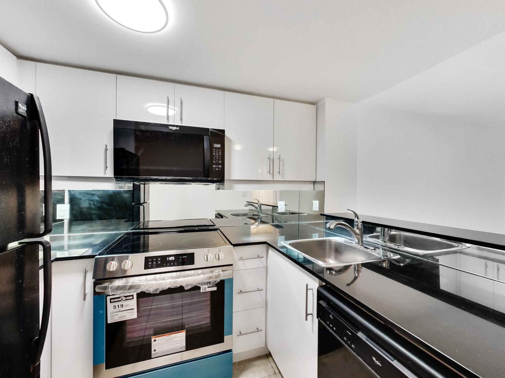 • Modern kitchen equipped with new cabinetry, stove, and microwave.