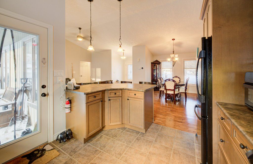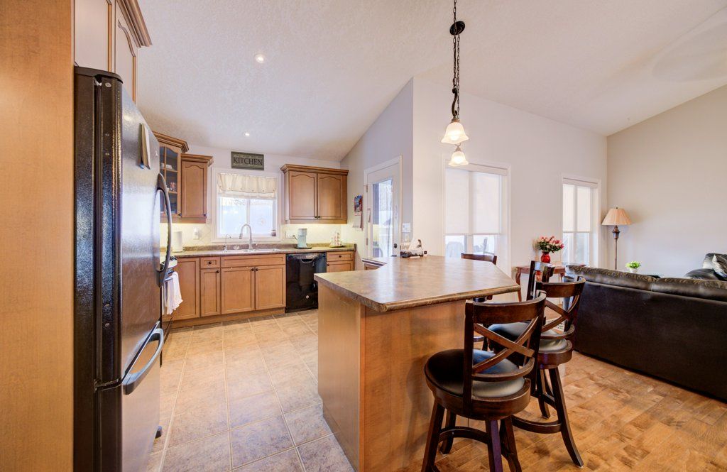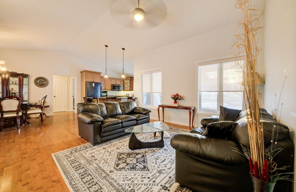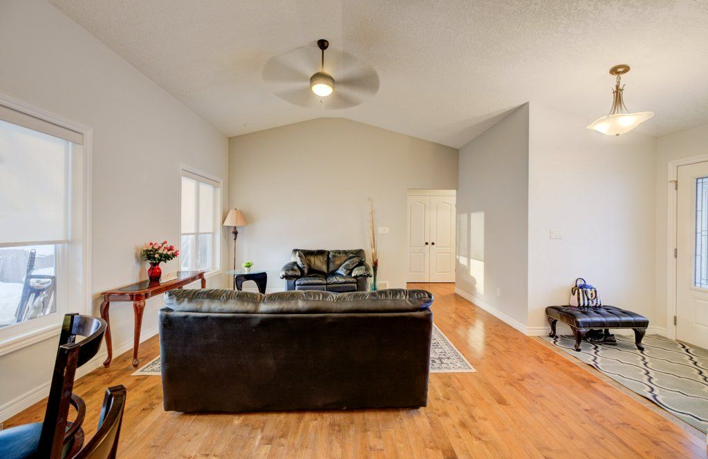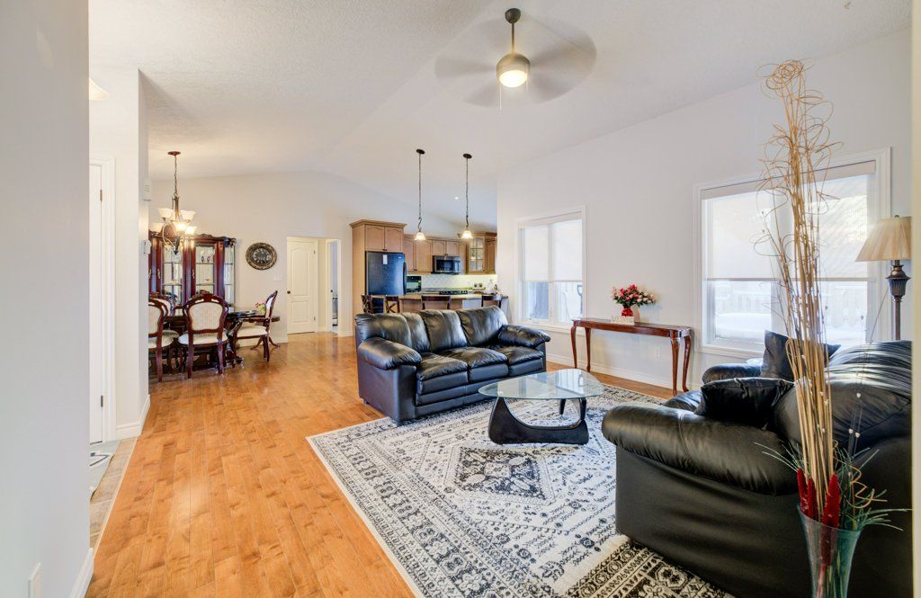 Great curb appeal welcomes you home to this beautifully maintained bungalow, designed for easy living and effortless entertaining. Step inside and you're greeted by soaring vaulted ceilings, warm maple hardwood floors, and a bright, open feel that instantly puts you at ease. The maple kitchen is the heart of the home - perfect for morning coffee, weeknight dinners, or hosting friends - with direct access to the back deck so summer bbqs and outdoor gatherings flow naturally. Main floor laundry adds everyday convenience, while three comfortable bedrooms and 2 full bathrooms, including a private ensuite, provide space and privacy for the whole family. The ensuite is built for unwinding with a large soaker tub. Downstairs, the finished basement becomes your go-to retreat. Imagine cozy movie nights or game days around the gas fireplace, with the added bonus of a two-piece bath for convenience. Step outside to a fully fenced, landscaped yard ready for kids, pets, and relaxing evenings under the stars. Located directly across from the public school, mornings are simpler, afternoon pickups are a breeze, and the playground is just steps away. The paved driveway even offers room for your 5th wheel trailer, making weekend adventures easy to plan. With central air, central vac, and every detail already taken care of, you can simply move in and start enjoying the lifestyle this home offers.