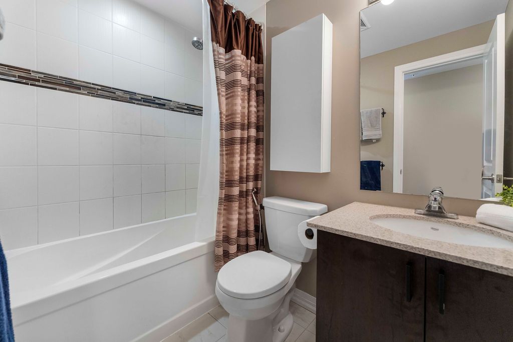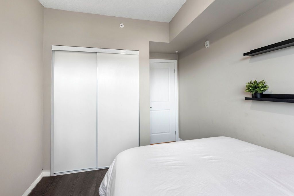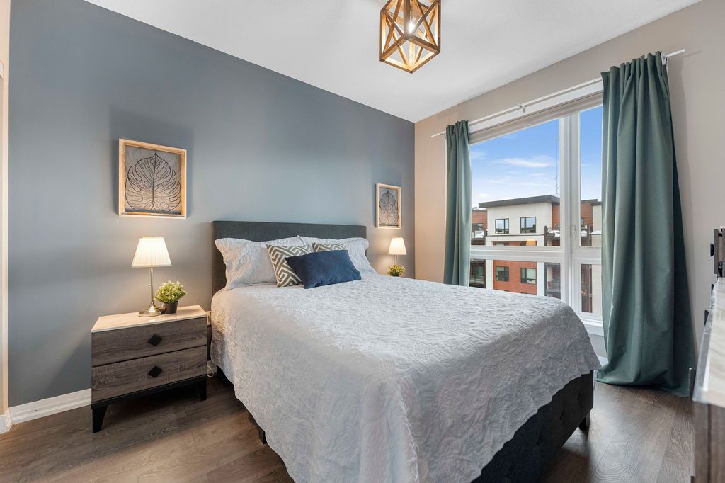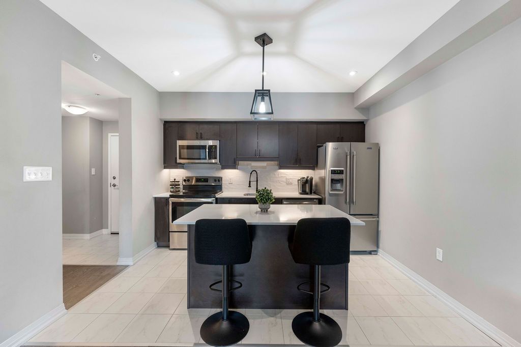 Welcome to the top-floor 2 bed & 1 bath condo in the art-inspired gallery condominiums, set on14 acres of forested grounds with walking trails. This 880 sqft open-concept suite features stainless steel appliances, updated backsplash, pot lights throughout, in-suite laundry (2021),underground parking, and a storage locker. The primary bedroom offers his and hers closets with a large window w/plenty of natural light. Additional spacious 2nd bedroom and updated 4-piecebath. Enjoy a covered balcony with bbqs permitted, community rooftop terrace (building 302),ample visitor parking, onsite superintendent, security system, elevator, and landscape gardens. Conveniently located close to hwy 400, go train, shopping, restaurants, and all amenities.