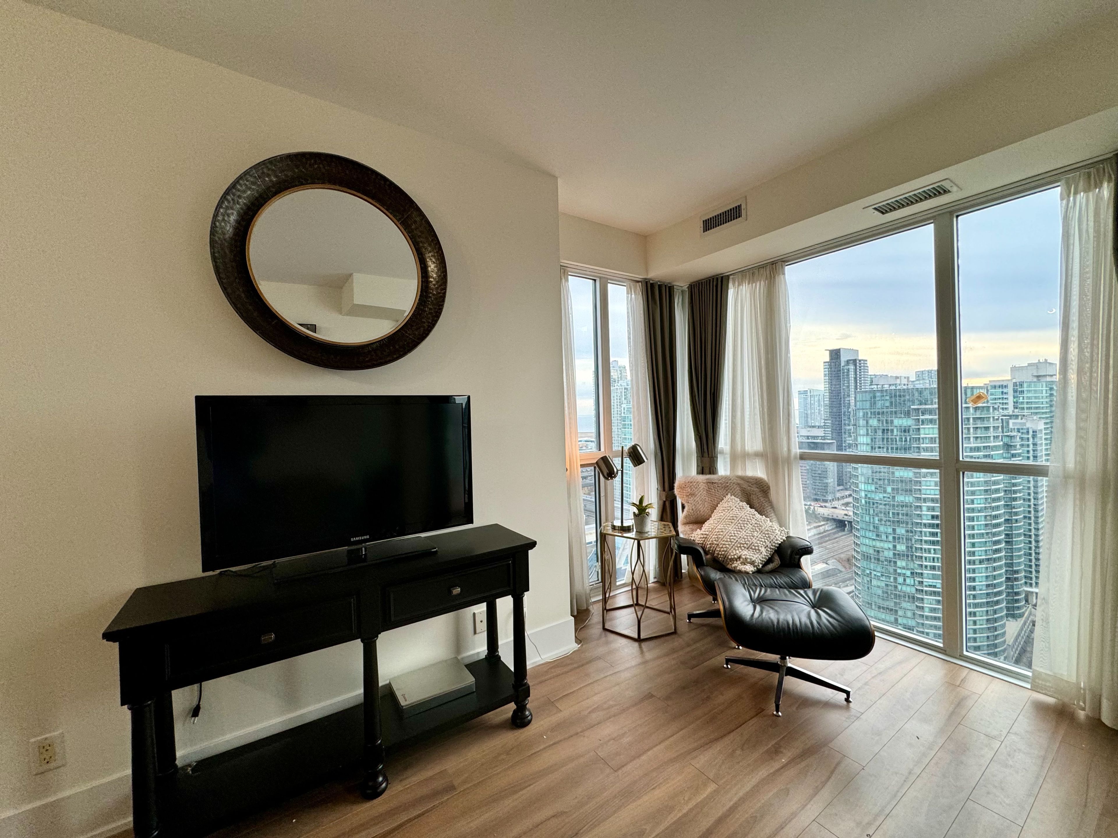 Luxury 2+den 1028 sqft corner suite with 40 sft balcony by tridel in the downtown core. Unobstructed south west view overlook rogers centre & the great lake. Fresh painted. 9' ceilings, floor-to-ceiling windows full of sunlight. Engineering wood floor throughout. Large balcony with new deck flooring. Modern kitchen with stainless steel appliances and luxury dining table. Primary bedroom with walk-in closet & 4pc ensuite & cn tower is right in the centre of the windows. The large den can be used as a home office or guest room. World class amenities including roof top infinity pool, cabanas & bbq, fitness, visitor parking, & 24 concierge. Steps to toronto's landmark attractions: the rogers centre, cn tower, ripley's aquarium, roy thomson hall, & more. Enjoy the luxury, convenience, entertainment, and professional living of downtown toronto.