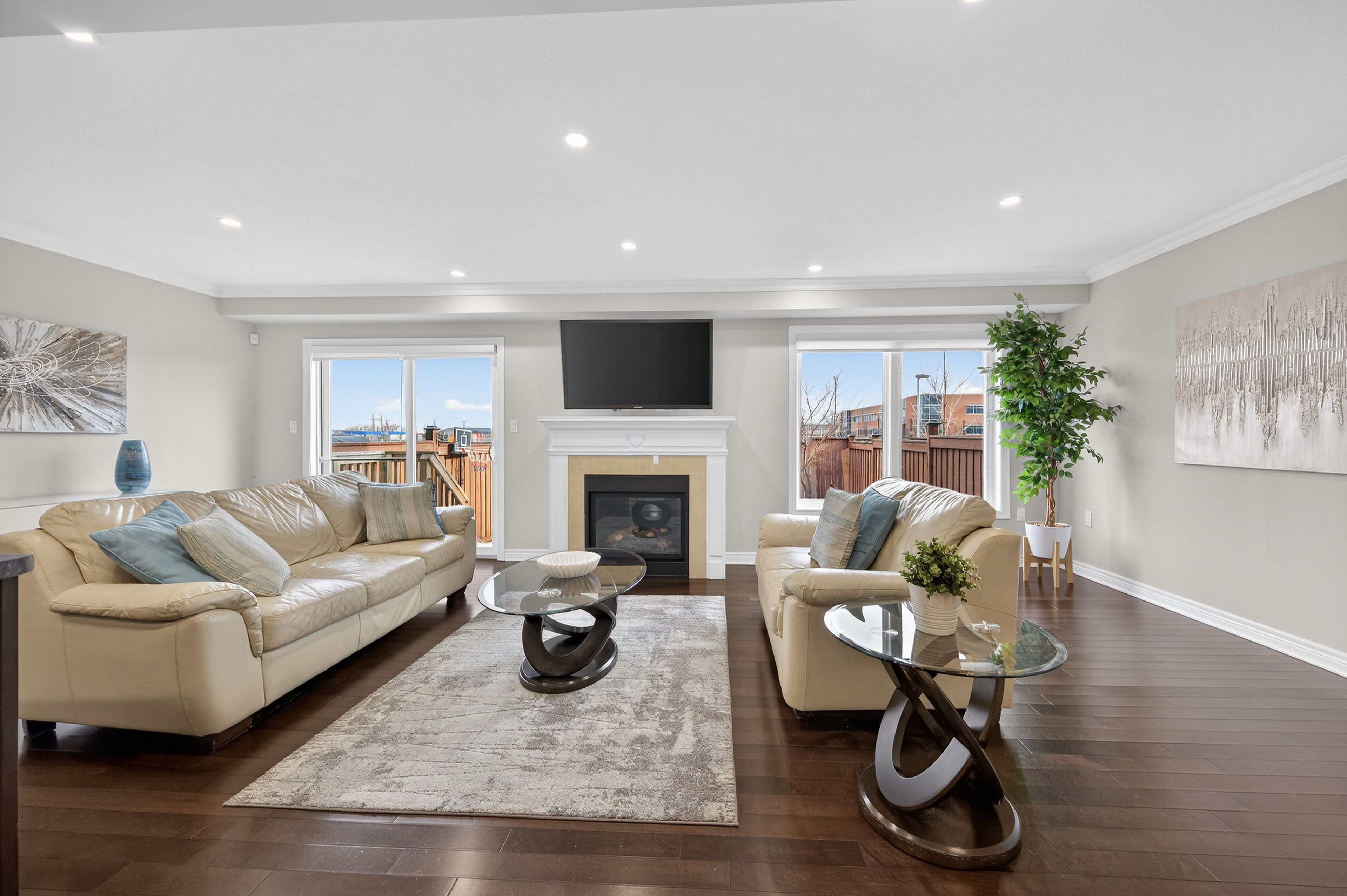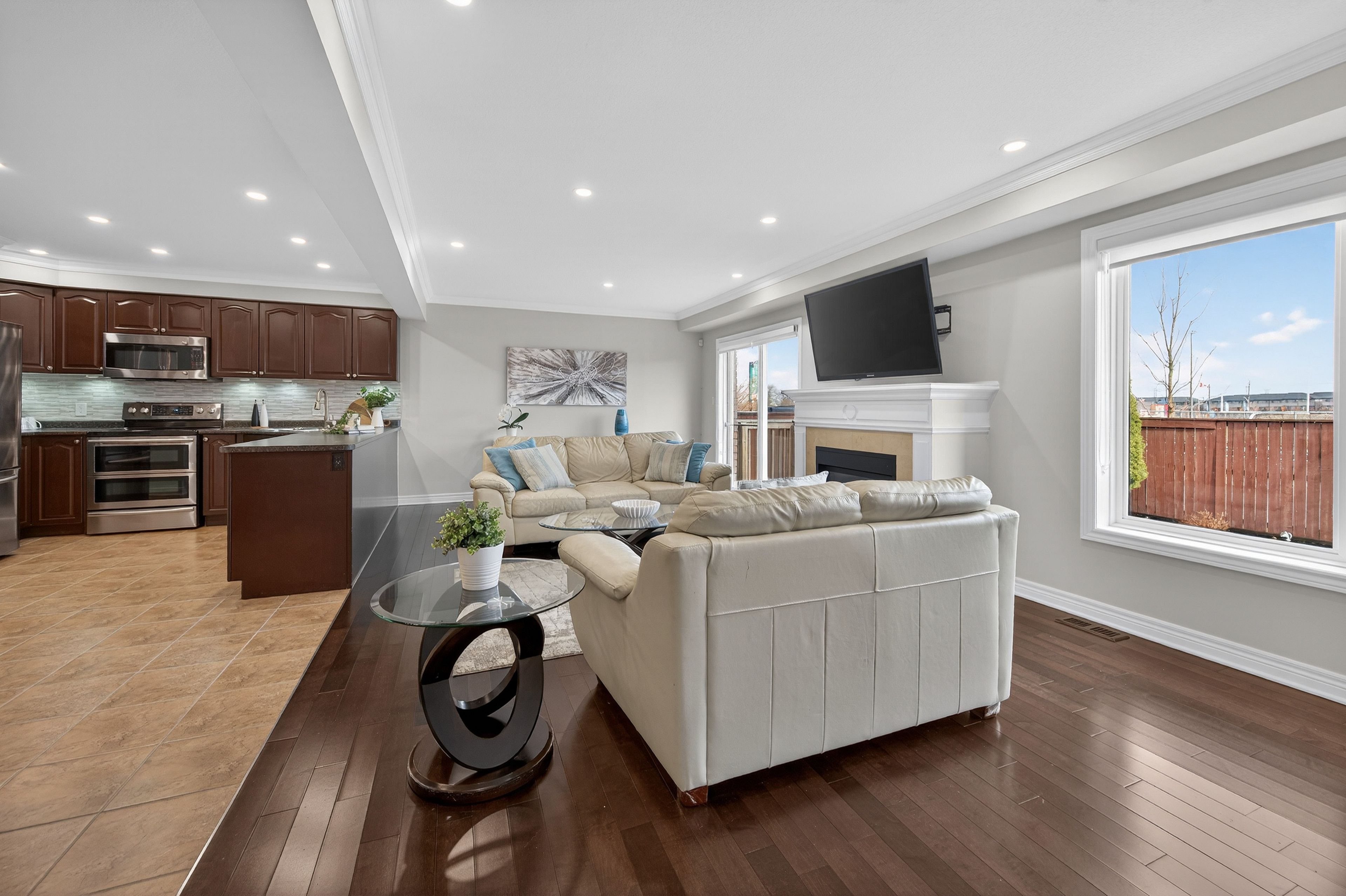 • Open-concept main floor with hardwood flooring and gas fireplace.
