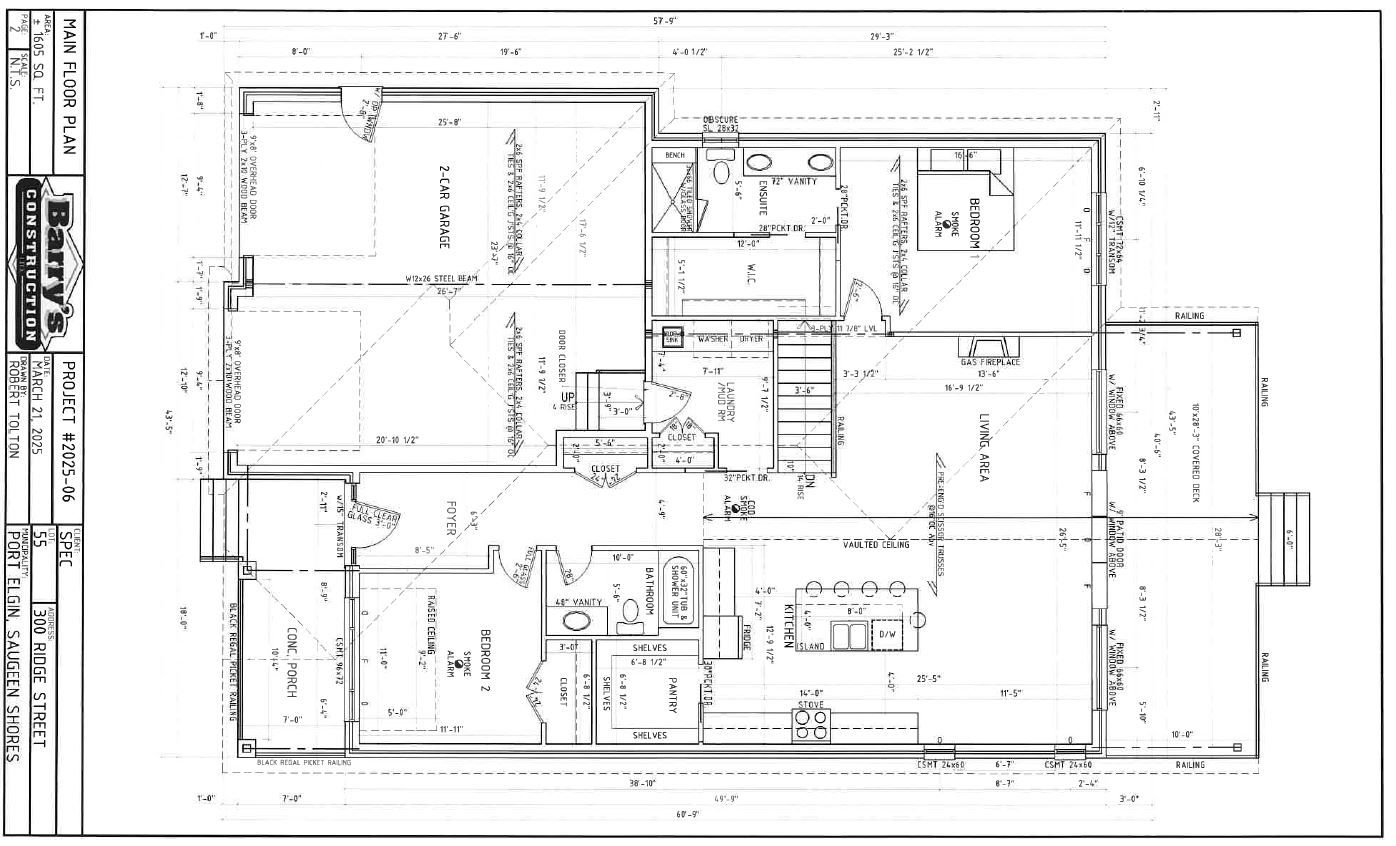 One of our favourite plans. This 2 + 2 bedroom 3 bath bungalow is located in one of port elgin's newest streets at 300 ridge street; on the south end of town close to walking trails and the beach. Boasting 1605 sqft on the main floor with vaulted ceilings in the principle area; 9 foot ceilings in the balance, quartz kitchen counter tops, walk-in pantry, gas fireplace, tiled shower in the ensuite bath, hardwood staircase from the main floor to the basement, and hardwood and ceramic flooring. The basement is finished with the exception of the utility room and will feature a family room, 2 bedrooms and 3pc bath. Exterior finishing includes a sodded yard, pressure treated covered deck 10 x 28'3 and double concrete drive. Bonus extras include central air conditioning and automatic garage door openers. Hst is included in the list price provided the buyer qualifies for the rebate and assigns it to the builder on closing. Colour selections may be available to those that act early. Prices subject to change without notice