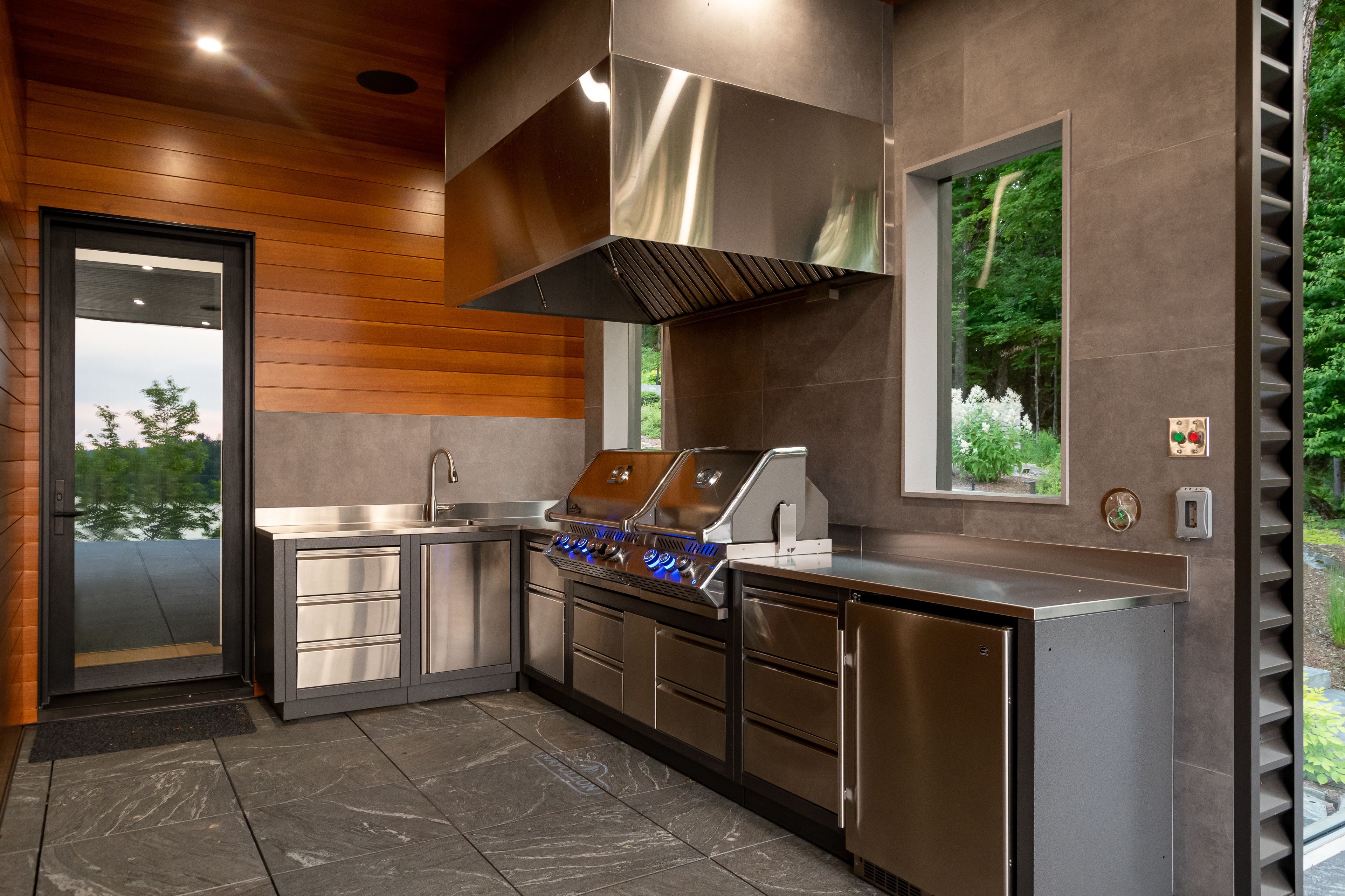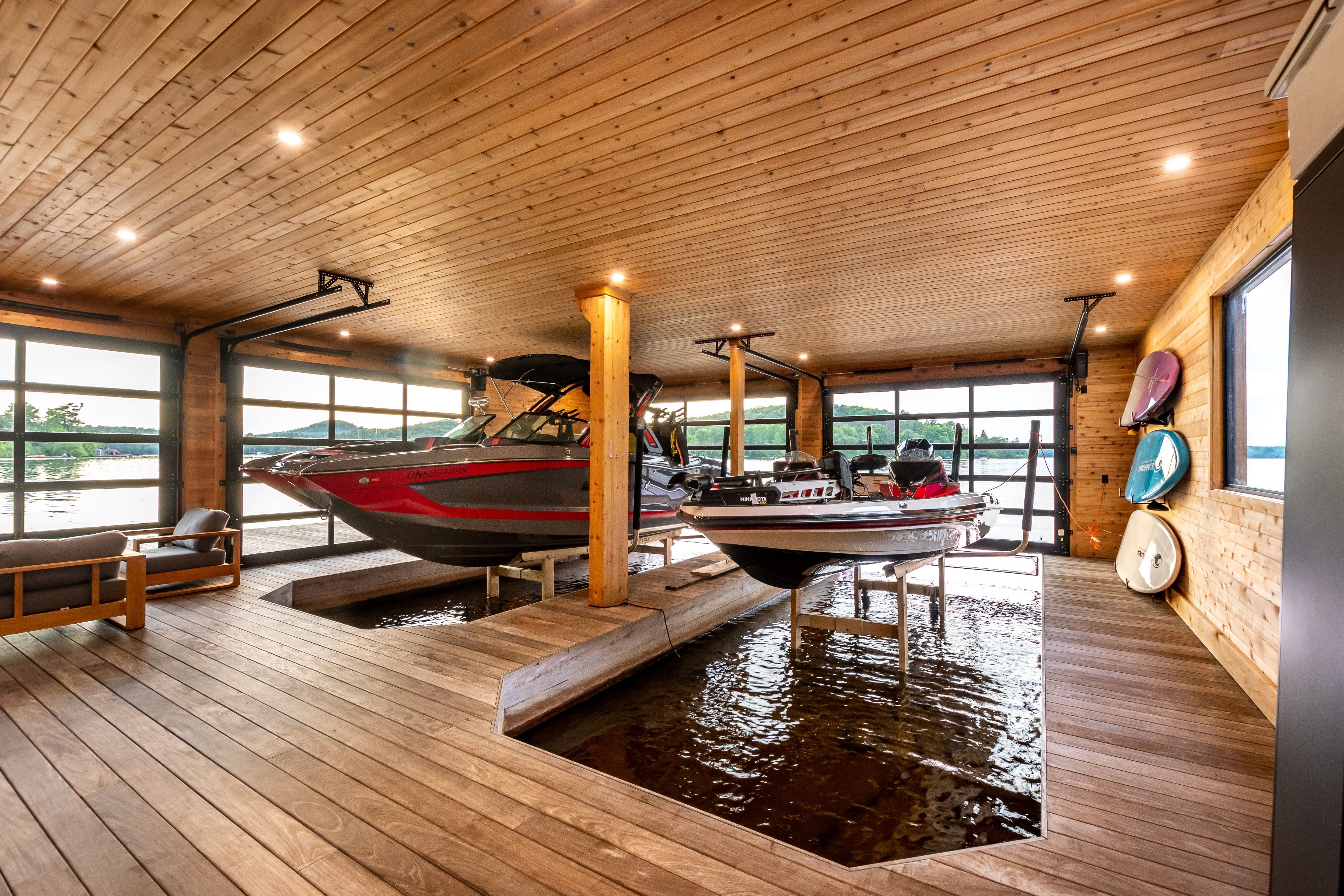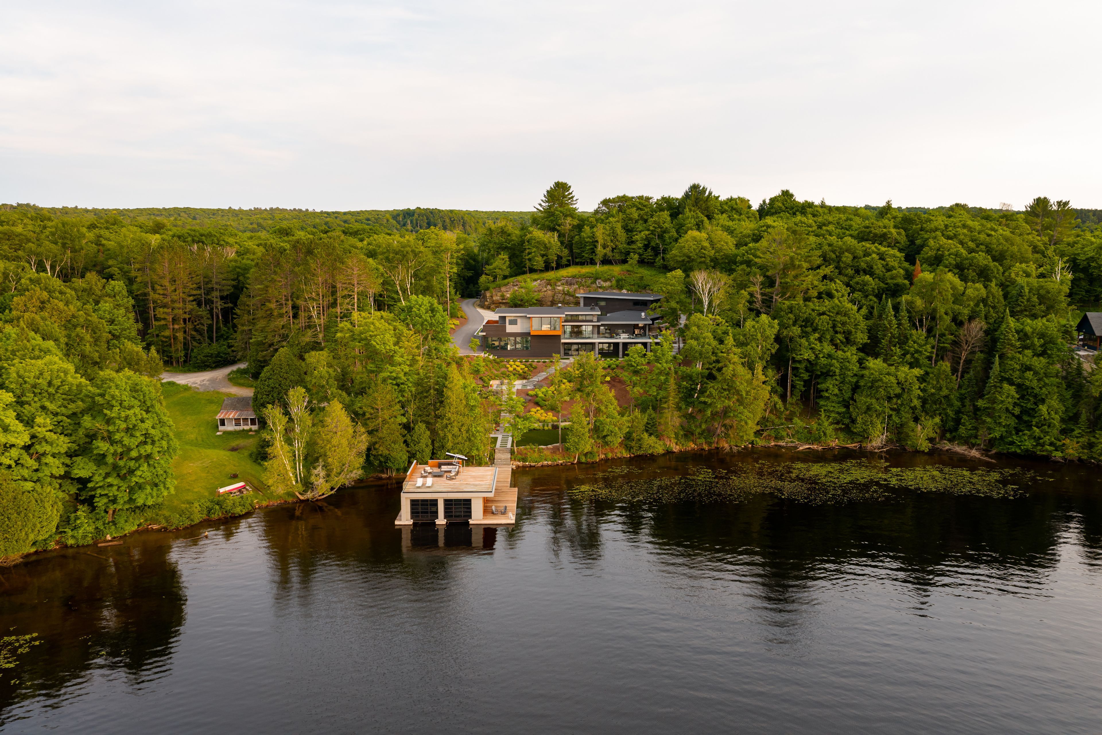 Welcome to your dream retreat on the serene shores of fairy lake in huntsville, ontario. This stunning modern lakefront home offers the ultimate in muskoka living, blending contemporary elegance with breathtaking natural beauty. With 4 spacious bedrooms and 6 luxurious bathrooms, this home features high-end finishes, clean architectural lines, and an open-concept design perfect for both relaxing and entertaining. This home also has in floor heating in all the garages and the home. Expansive windows frame unobstructed lake views, while a control4 smart home system puts lighting, audio, security, and more at your fingertips. Step outside to a private waterfront oasis with low-maintenance modern turf, striking stone accents, and a boathouse for endless summer fun. Enjoy lakeside dining with the industrial-grade outdoor kitchen and bbq area, ideal for entertaining in style. Inside, the extensive home gym is equipped with high-end, commercial-quality machines, making wellness part of your daily routine. The detached garage with its own bathroom offers flexible use as a guest suite, gym extension, or studio, and the high-end garages provide ample space for vehicles and storage. What truly sets this property apart are the additional lots on either side, offering unmatched privacy, expansion potential, or a rare investment opportunity a major value add for discerning buyers seeking scale and exclusivity. All of this is just minutes from the shops, dining, and charm of downtown huntsville. While enjoying the peace and prestige of lakefront living in one of muskoka's most desirable locations.