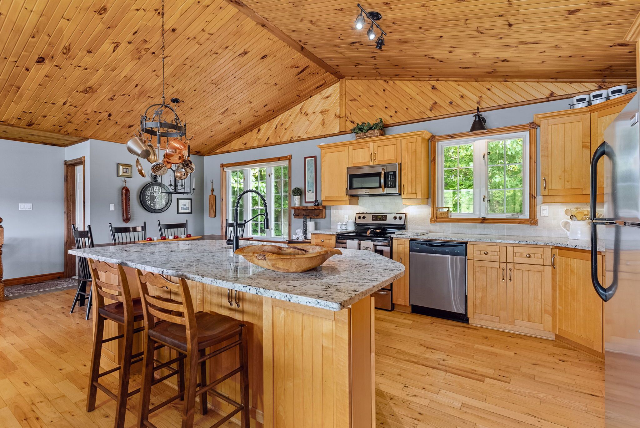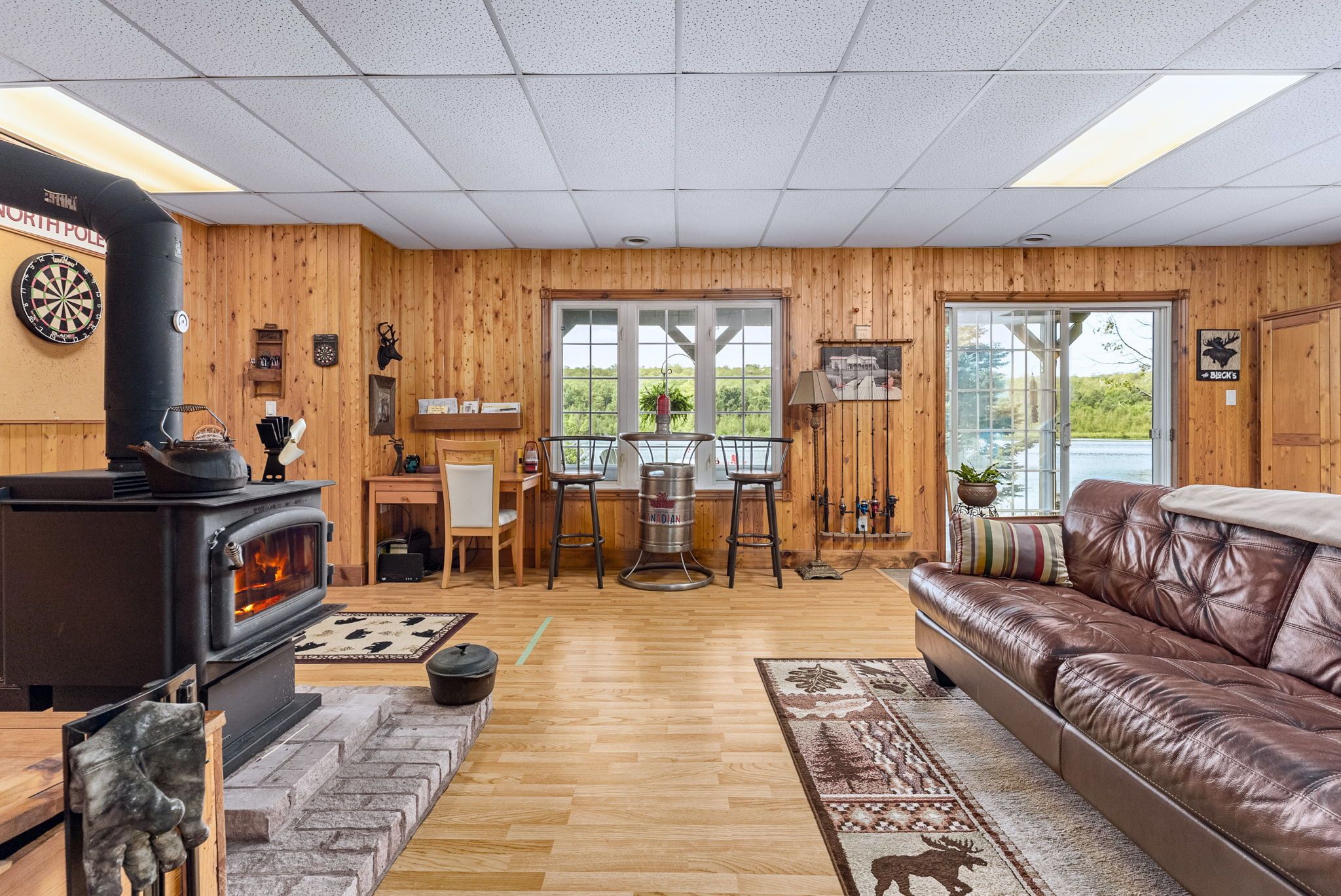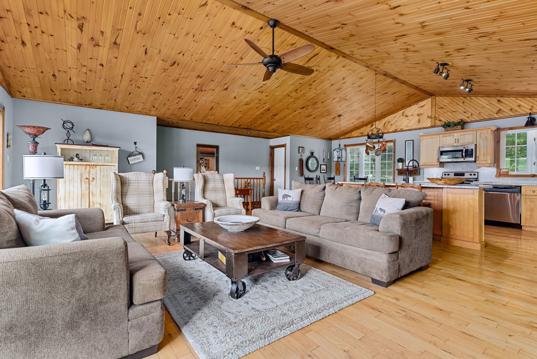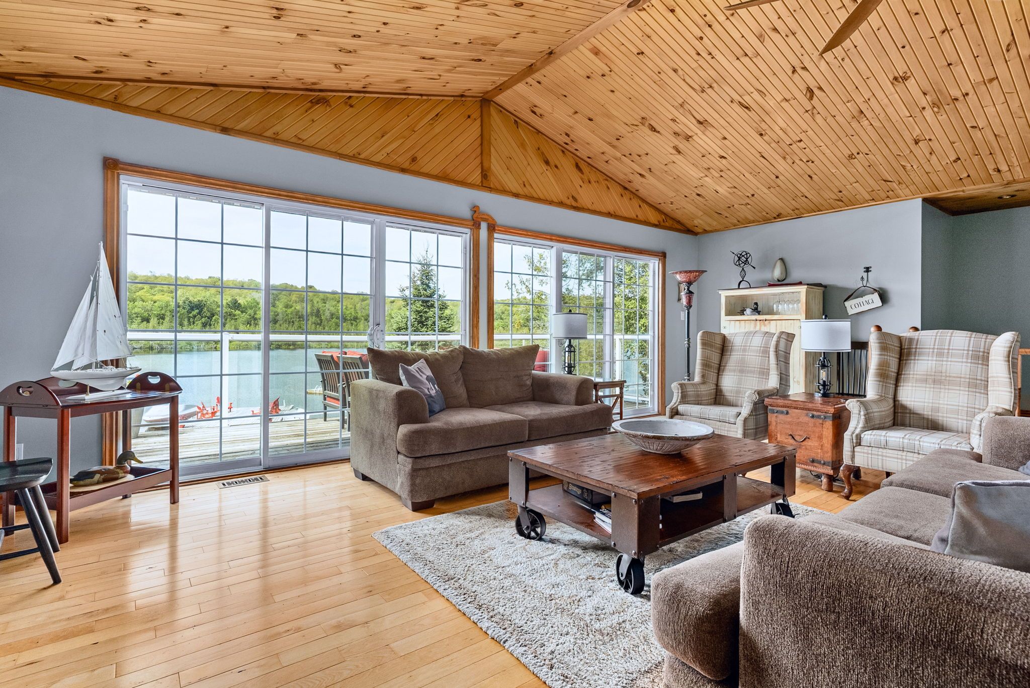 • Bright open concept with warm pine accents and stunning lake views.