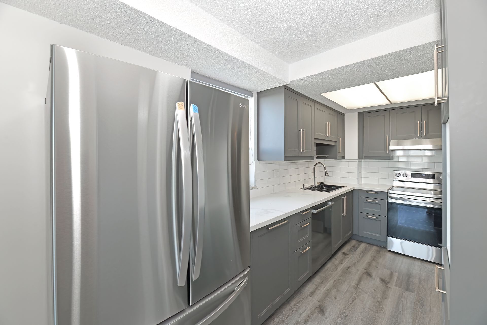 • Updated kitchen features stainless steel appliances and sleek cabinetry.