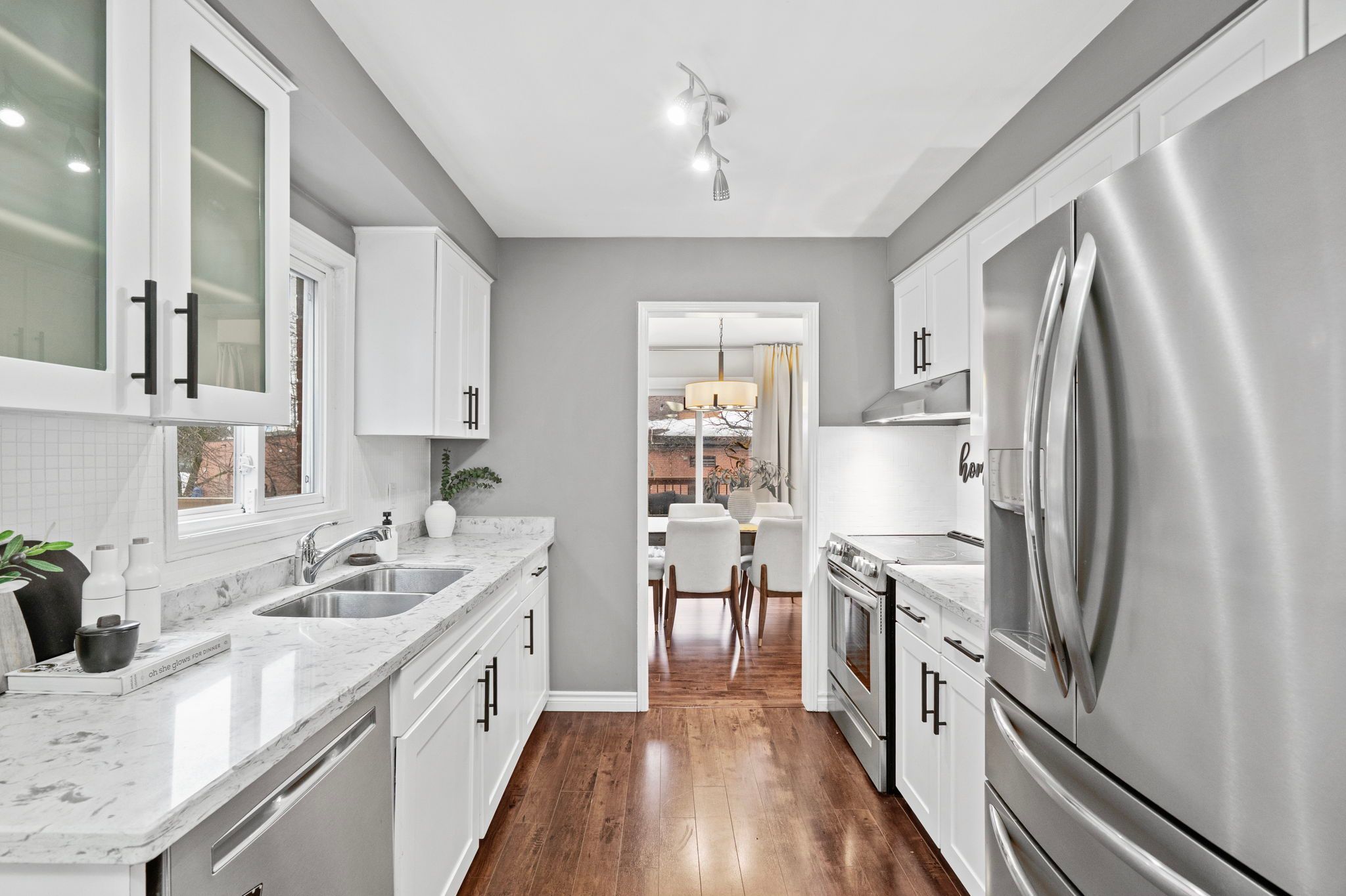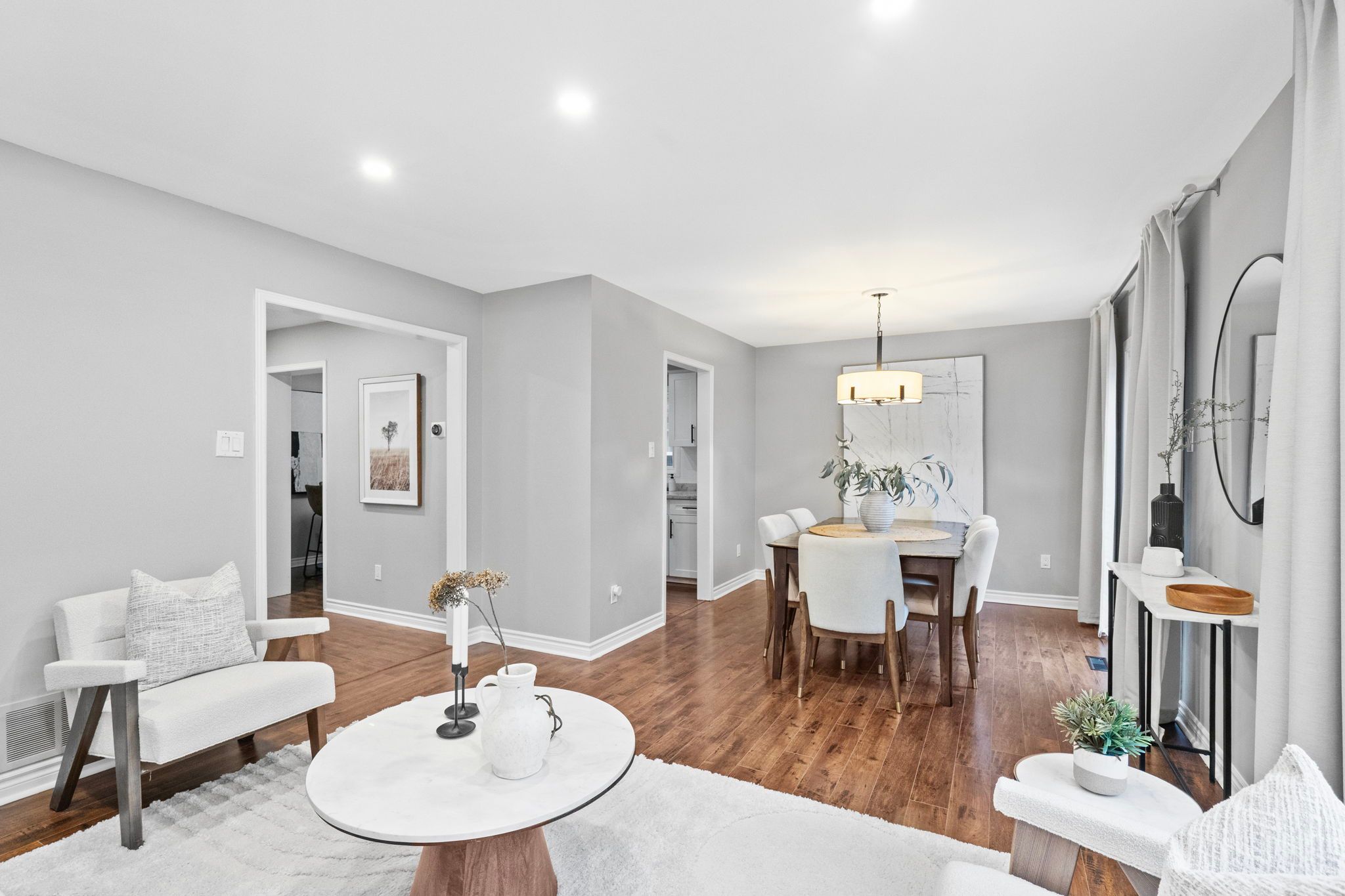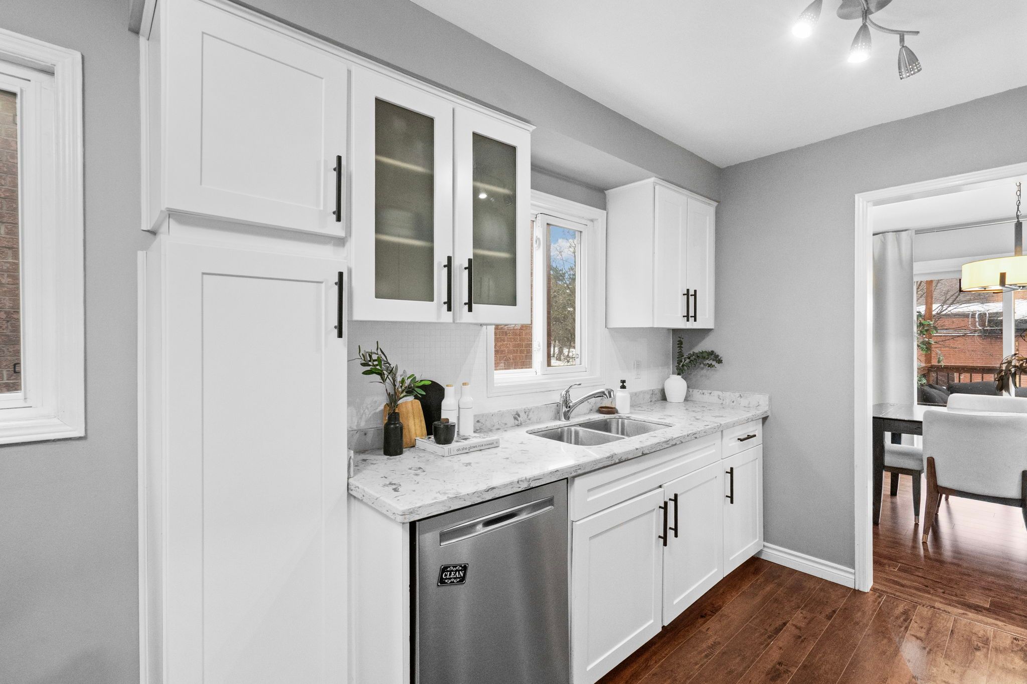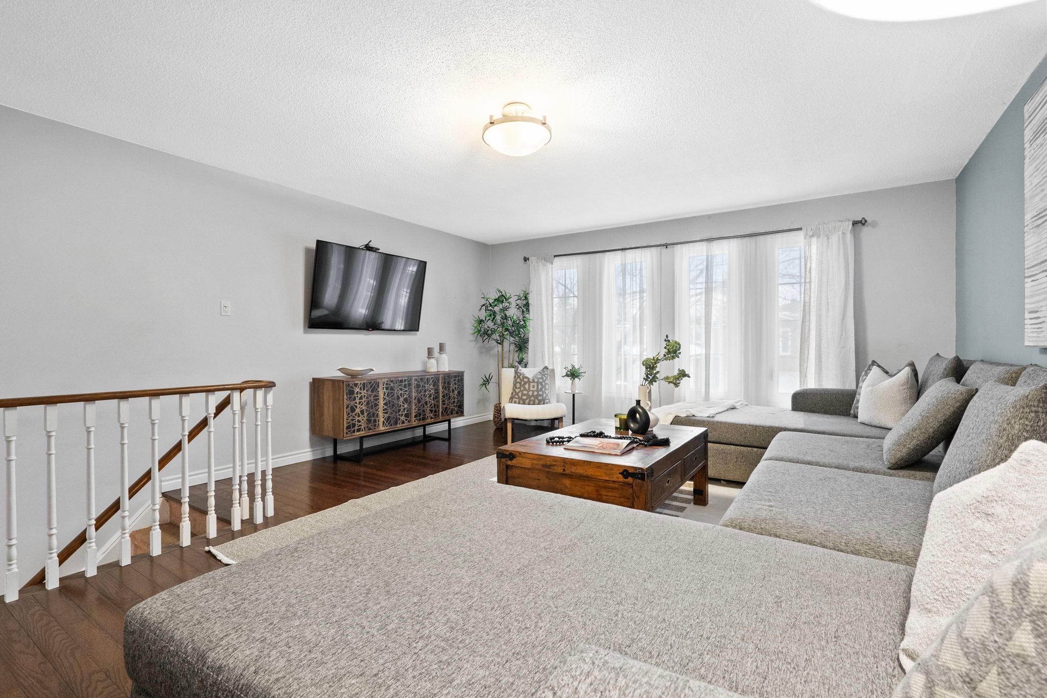 Welcome to 3005 olympus mews in the heart of meadowvale. Located on a quiet dead-end street, this beautifully maintained detached home offers 3 plus 1 bedrooms, 4 bathrooms, and flexible living space within the highly sought-after plum tree park public school boundary. The renovated front entrance features upgraded stonework along with a redone porch and steps, creating impressive curb appeal. The roof was replaced in 2021, providing added peace of mind for years to come. Inside, the open-concept main floor showcases laminate flooring, pot lights, and a thoughtfully updated kitchen with quartz countertops, refaced cabinetry, a newly added island, and newer stainless steel frigidaire appliances. The layout flows seamlessly into the dining area with walkout to an oversized deck featuring updated railings. The backyard has been completely redesigned with artificial grass and surrounding stone landscaping, creating a clean, modern, and low-maintenance outdoor space perfect for children and entertaining. A portable shed adds convenient additional storage. A highly desirable main floor laundry room with exterior access adds everyday convenience. Upstairs offers three spacious bedrooms with hardwood flooring, including a primary suite with two walk-in closets and a 4-piece ensuite. The large family room above the garage provides exceptional flexibility and can easily be modified to suit your needs such as an additional bedroom, home office, or playroom. The finished basement includes a fourth bedroom, a full 4-piece bathroom, and separate access through the garage, offering ideal space for multi-generational living or guests. Additional highlights include a dual climate-controlled garage for year-round comfort. Conveniently located near lake aquitaine, meadowvale town centre, meadowvale go station, and major highways.