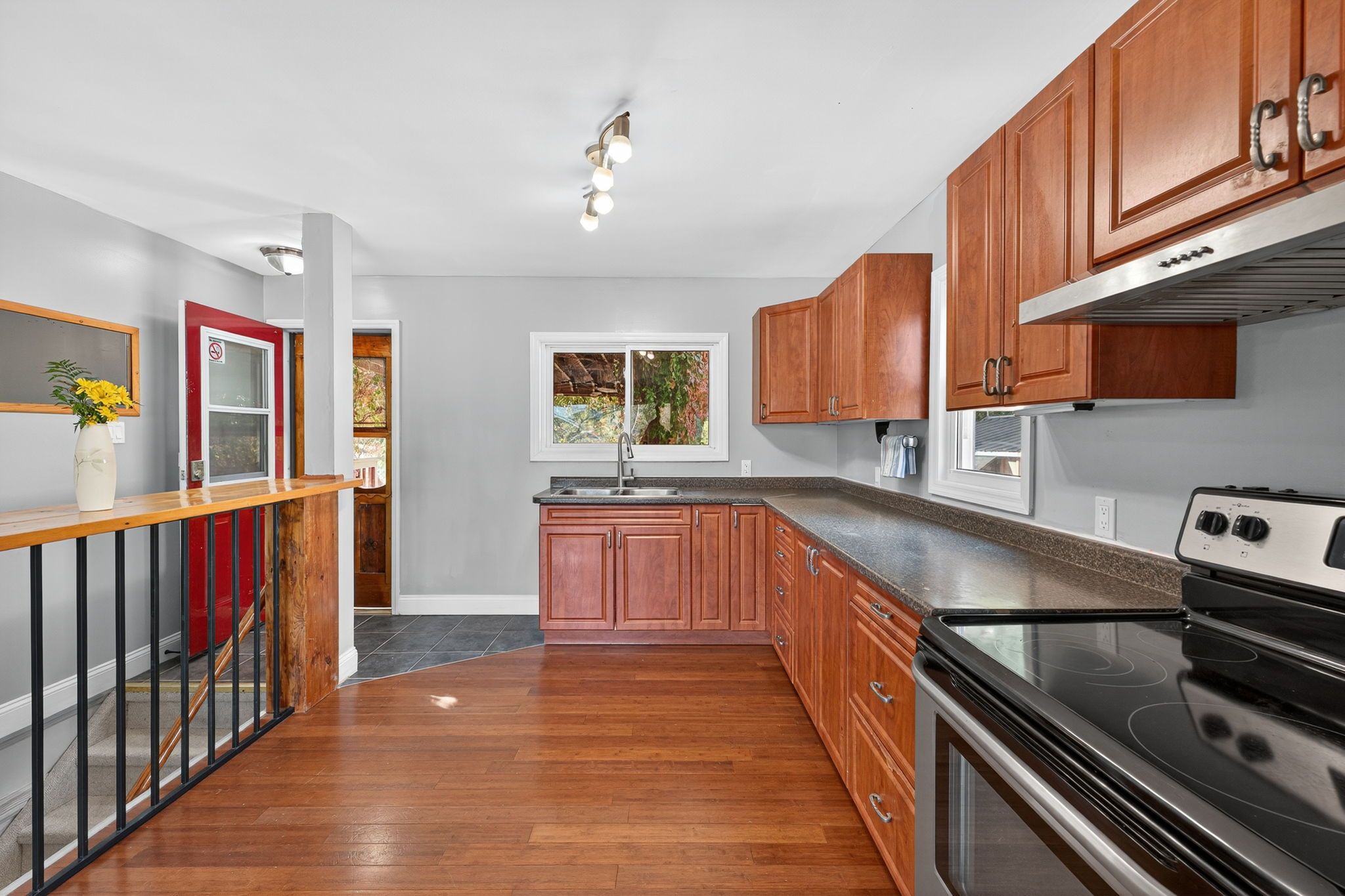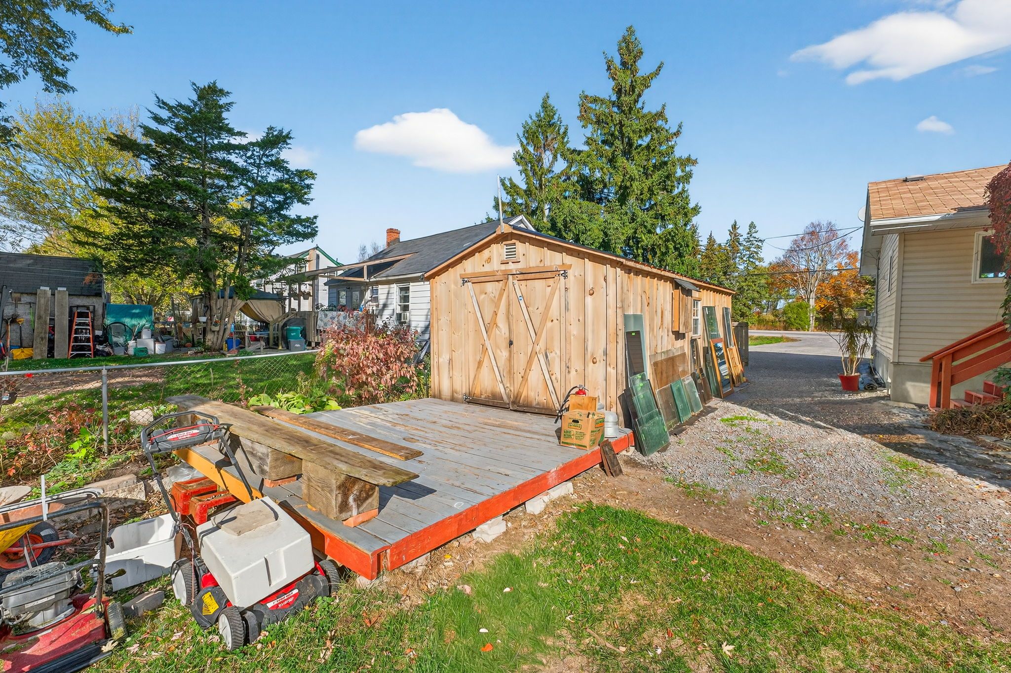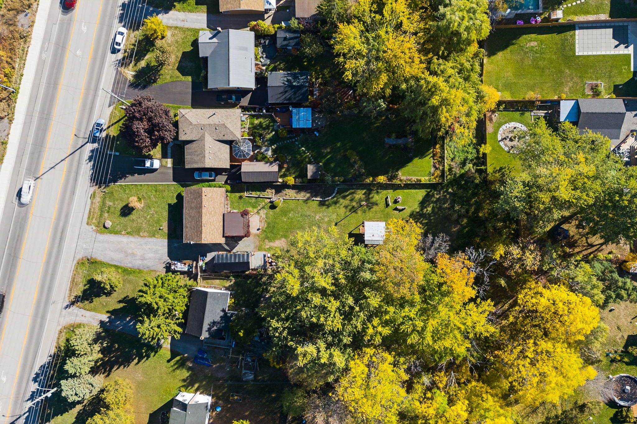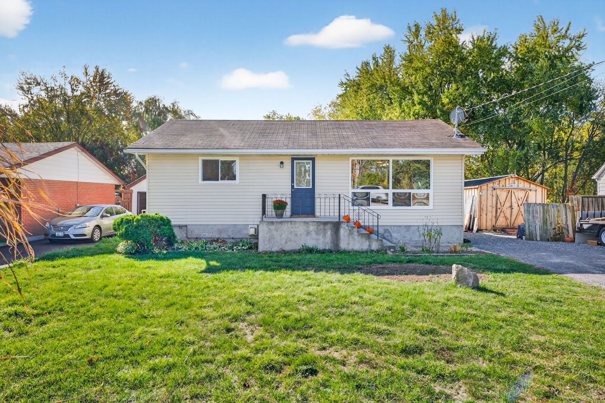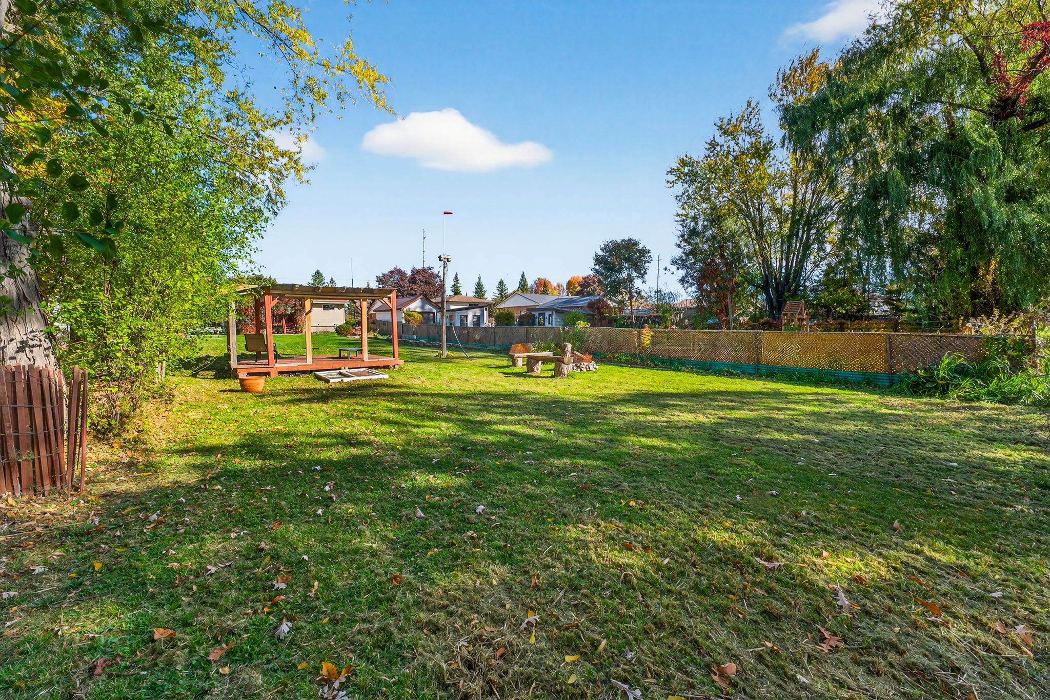 Charming home on a deep private lot! Welcome to this inviting 2+1 bedroom home, perfectly situated on a beautiful 310-ft deep, fenced lot with mature gardens and a tranquil creek running along the back. Offering comfort, character, and practical updates, this home is ideal for those who value nature, privacy, and charm. The main floor features include an open concept design with a cozy great room overlooking the kitchen, 2 bedrooms, each with ceiling fans for added comfort, a tiled 4-piece bathroom, hardwood floors throughout the main living areas, with tiled foyer and back landing. A finished basement with additional bedroom, a spacious recreation room with a large natural gas fireplace that efficiently heats both the lower and main levels, and a laundry/utility room. The exterior of this home is sure to please with a deck boasting a steel-roofed pergola adorned with mature vines plus an open-face pergola (13'5" 15'10"), perfect for outdoor entertaining. Two sheds perfect for storage or the hobbyist. Organic gardens filled with perennials, shrubs, and flowers and a fire pit area (wood included). This property blends rustic charm with modern practicality... Ideal for gardeners, hobbyists, or anyone seeking a home just minutes from amenities.