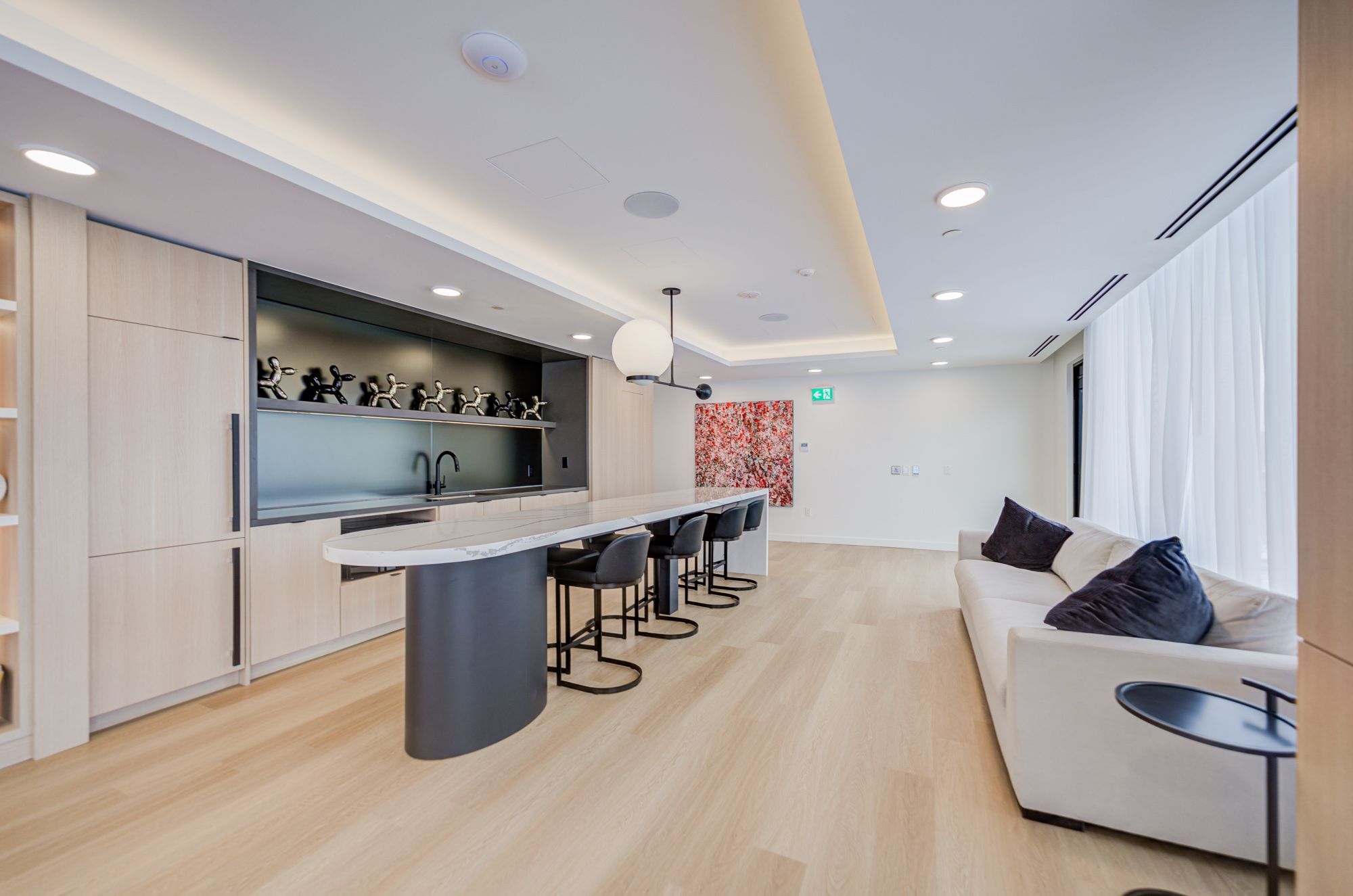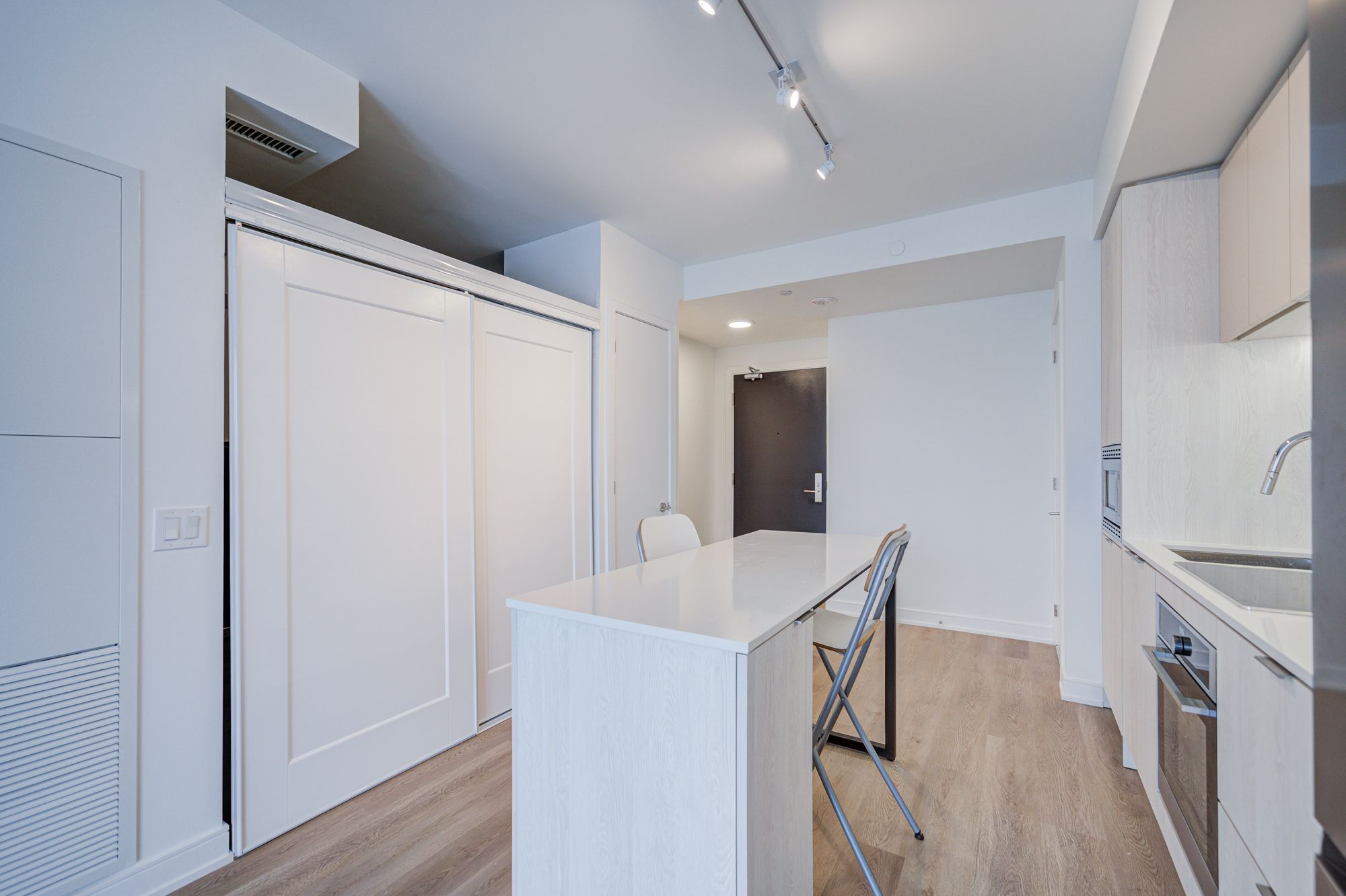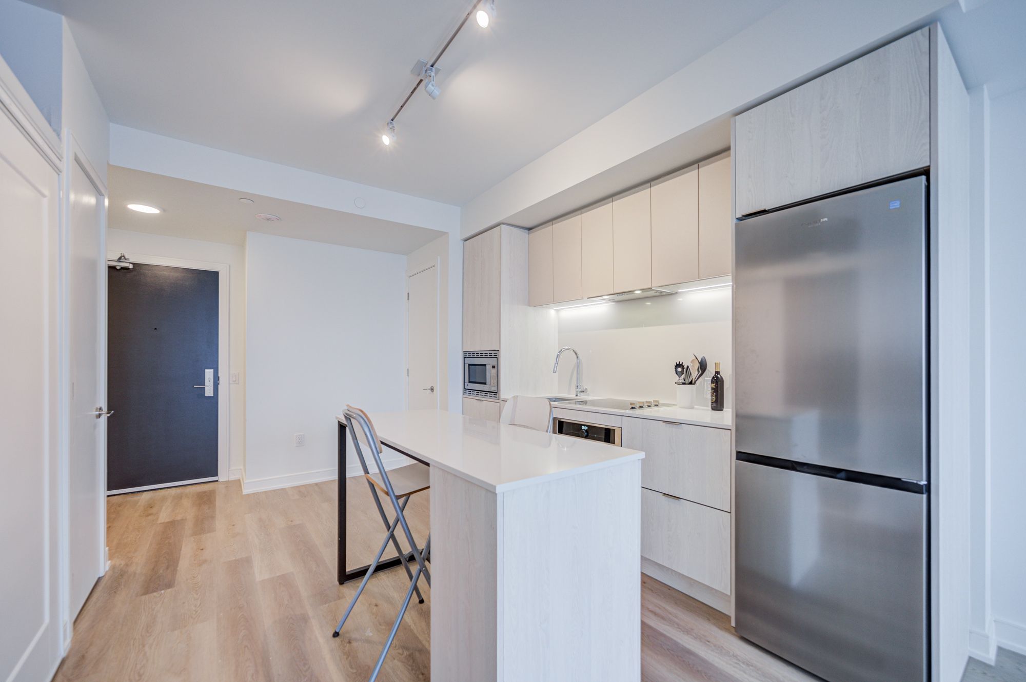 • Building amenities include fitness room, co-working lounge, and rooftop BBQ area.