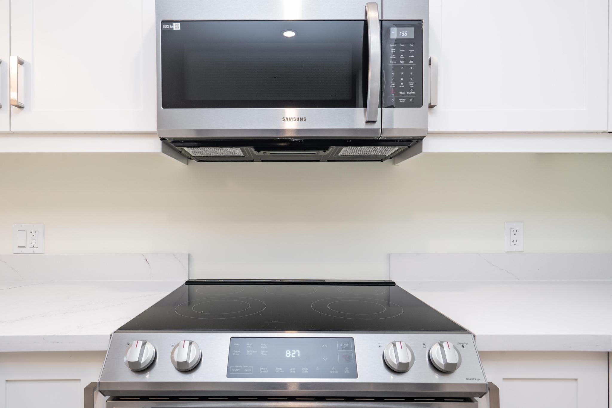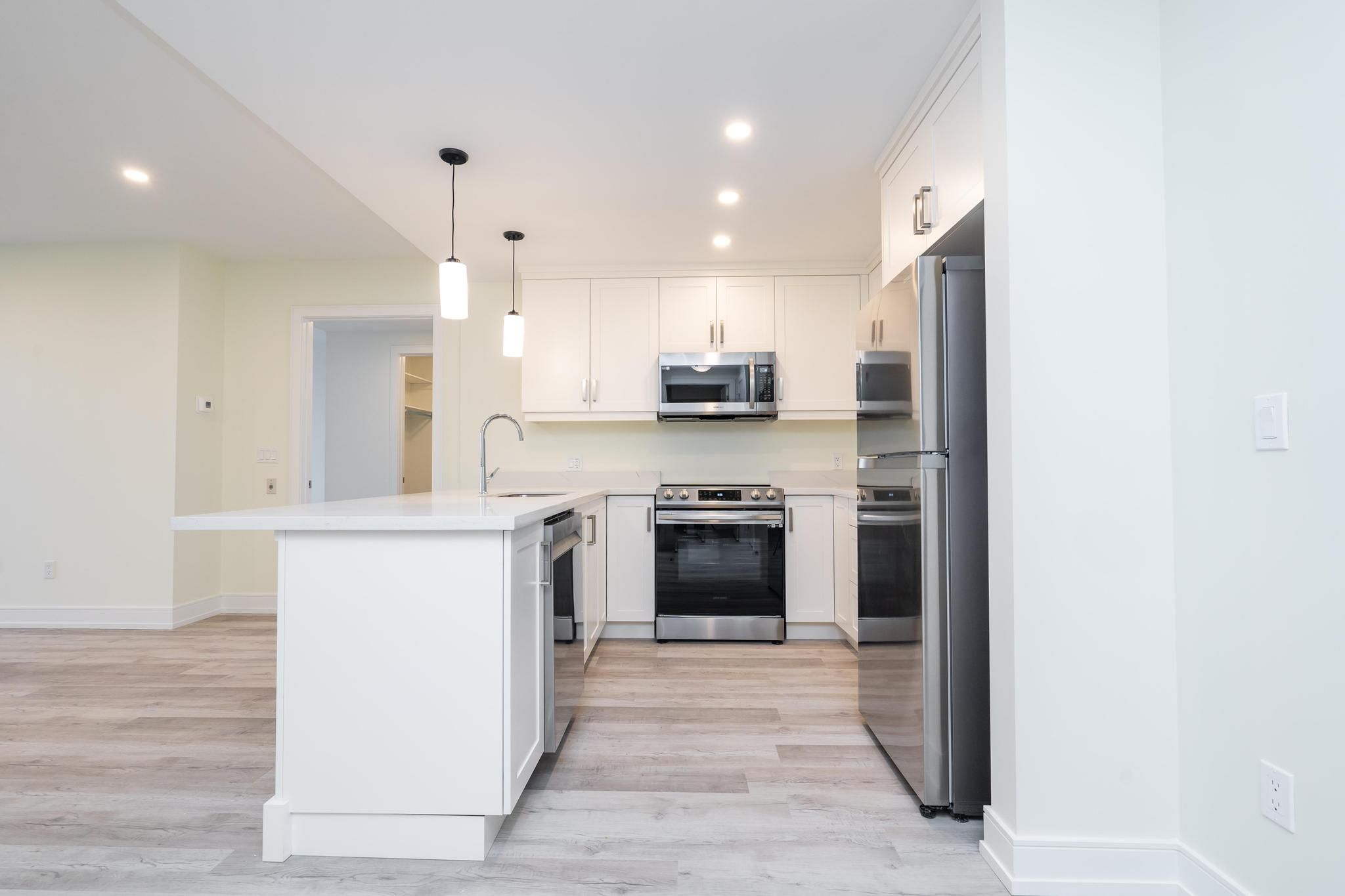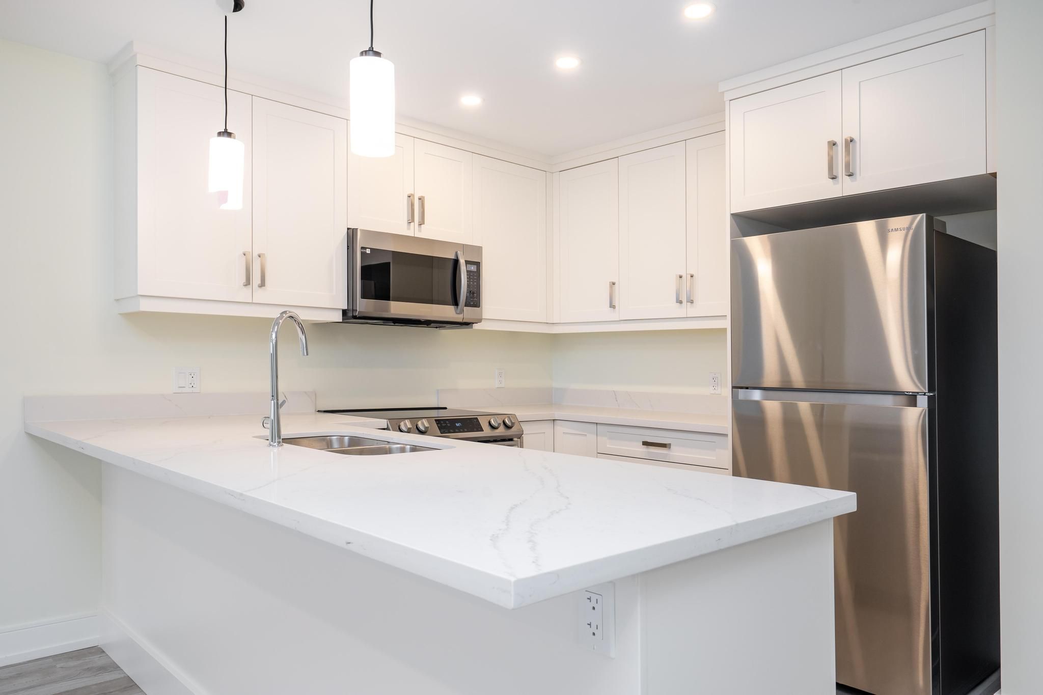 • Contemporary kitchen with stainless steel appliances and breakfast bar.
