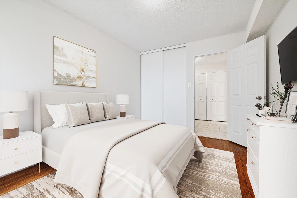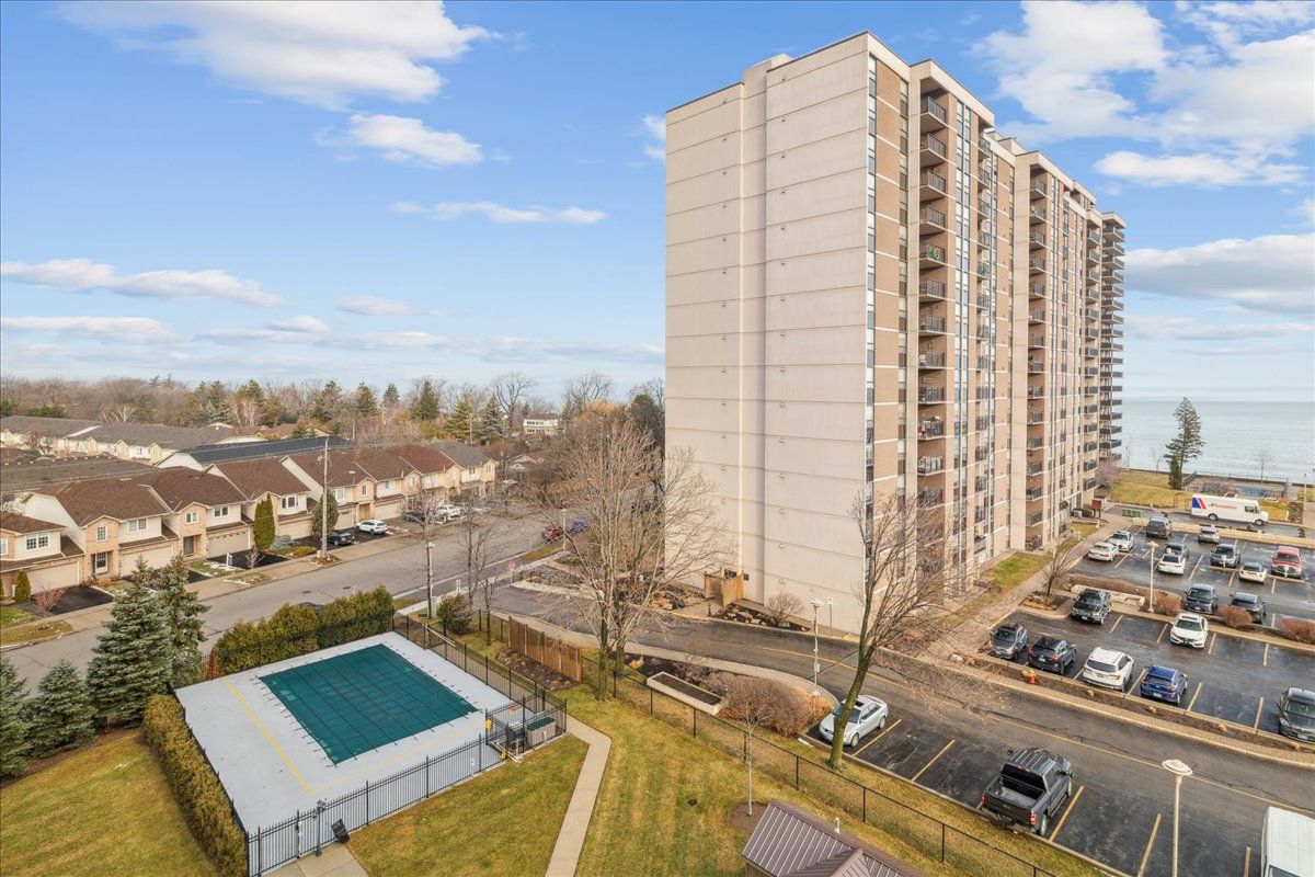 Welcome to this immaculate 2 bedroom plus den suite with serene lake views from the moment you step through the front door as well as from every room. Pride of ownership! Beautifully maintained, approximately 1130 s. F., generous size living room opening to bright updated eat-in kitchen with ample counter and cupboard space, six appliances, breakfast/dining room area, cozy den with new carpet, freshly painted through-out in warm neutral tones. Living room opens to a private covered balcony via sliding glass doors, perfect for relaxing & taking in waterfront views and the sunrise. Good sized master bedroom includes a 2-piece ensuite with sizeable walk-in closet, 4-piece main bathroom, supplementary in-suite storage space. Perfect for down-sizing or small family. Building amenities include outdoor pool, gym, sauna, party room, library & car wash bay. Ideally located close to major highways with quick access to everyday essentials, shopping, dining & more, all while enjoying peaceful lakefront living in the heart of the city. One underground parking & storage locker included. Monthly condo fee includes the cost of heat, hydro, air conditioning, water, cable tv.