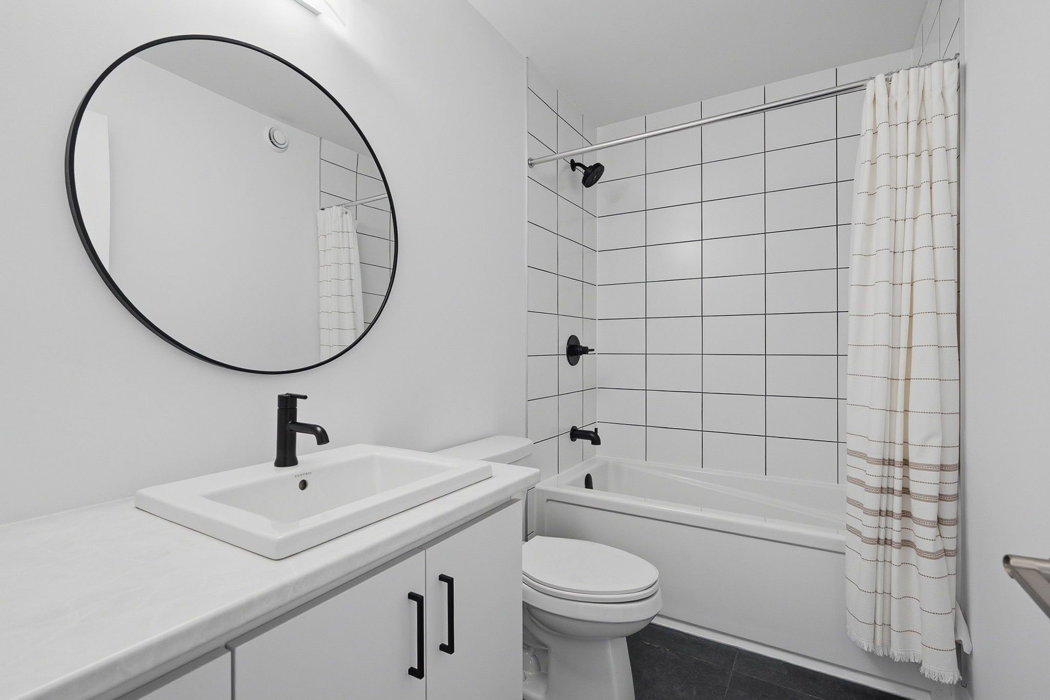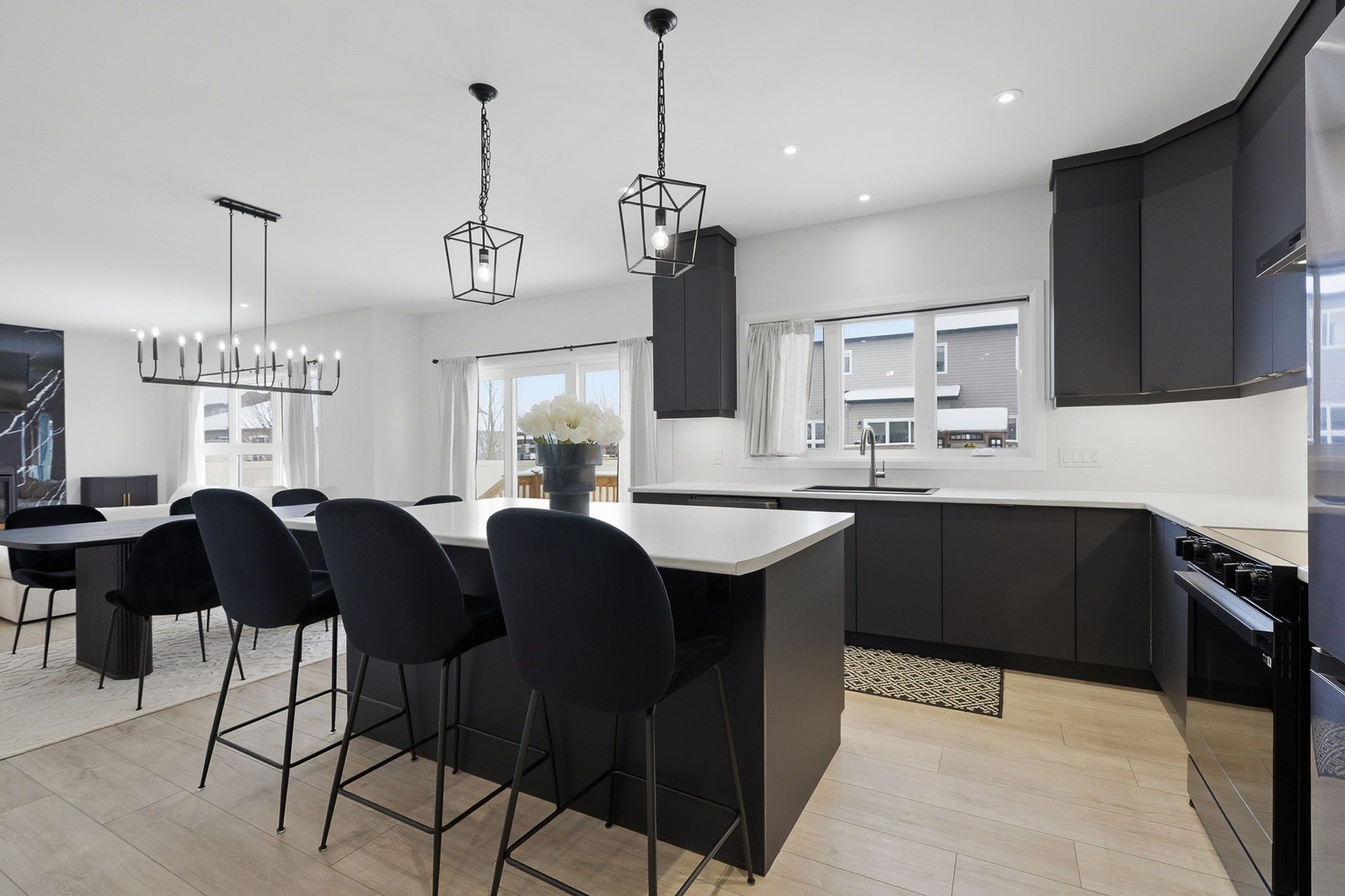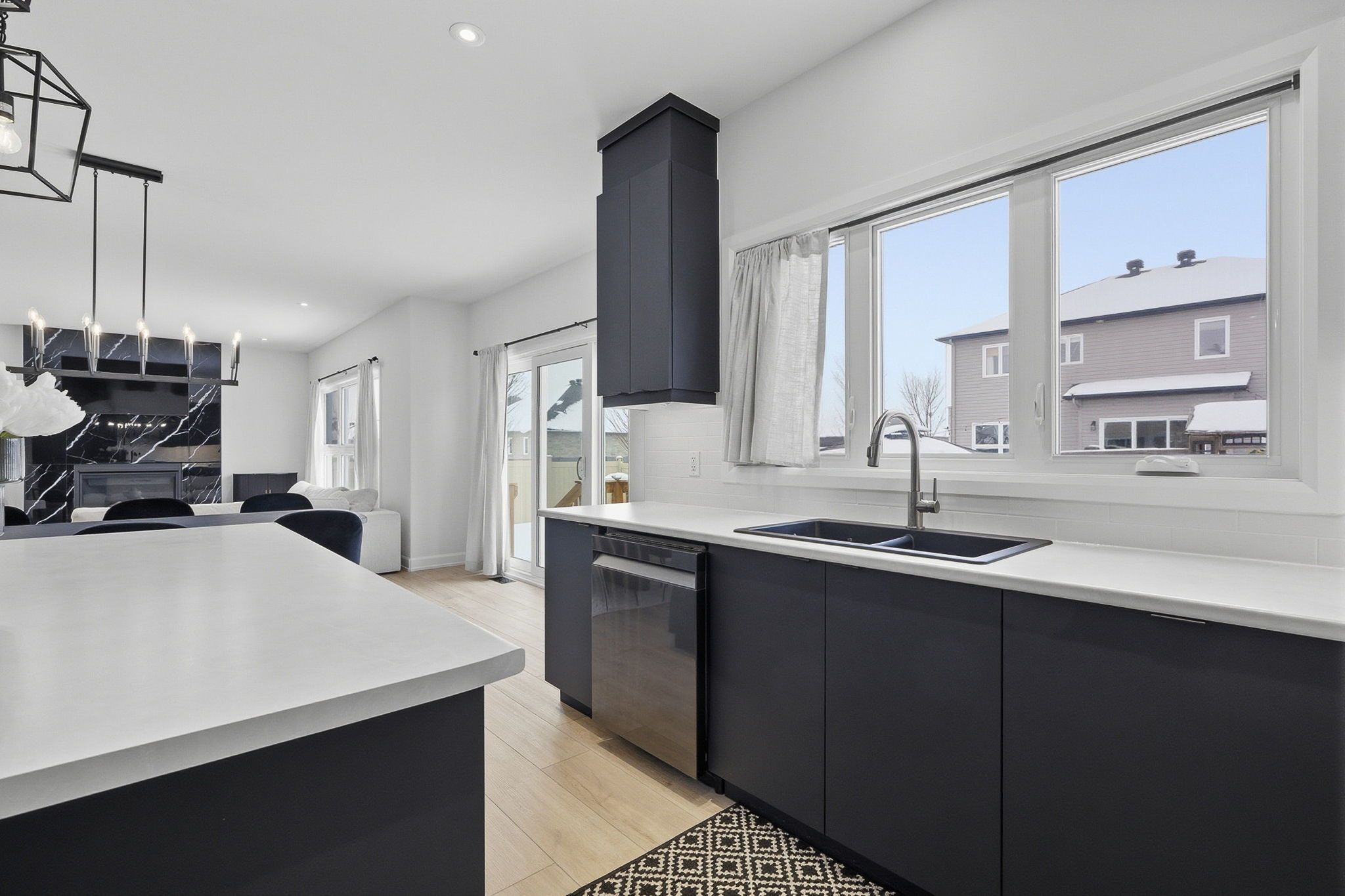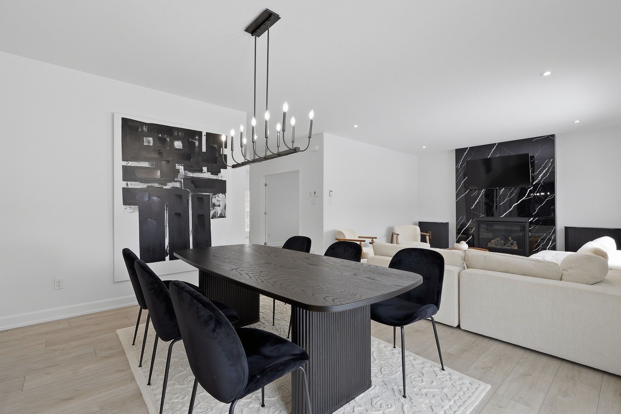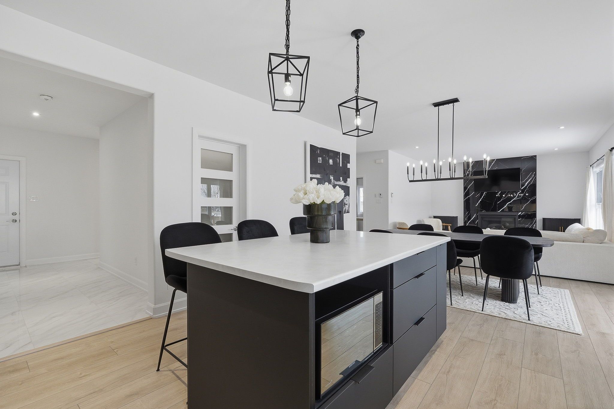 • Open living area with luxury vinyl flooring and a stylish fireplace.