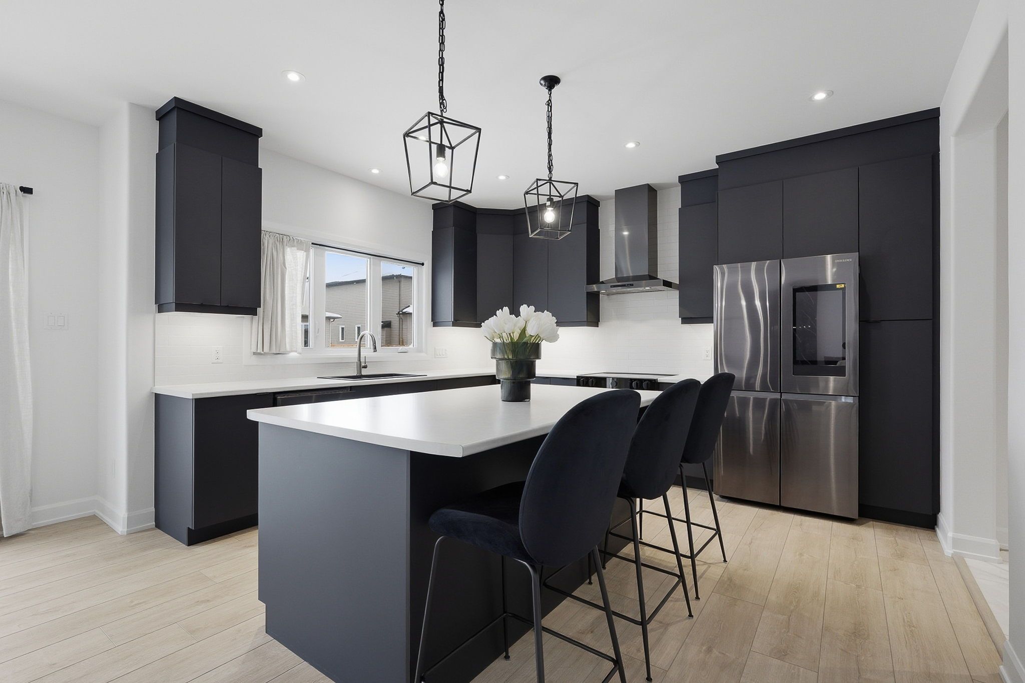 • Modern kitchen with ample workspace and contemporary matte cabinetry.