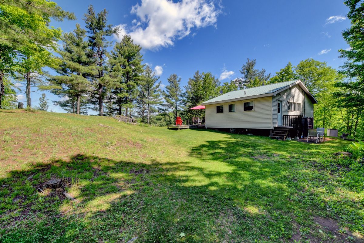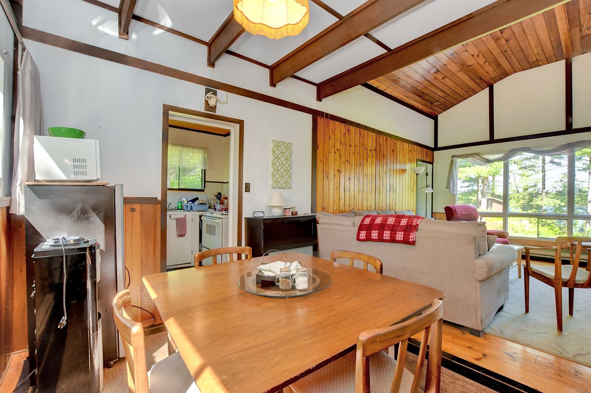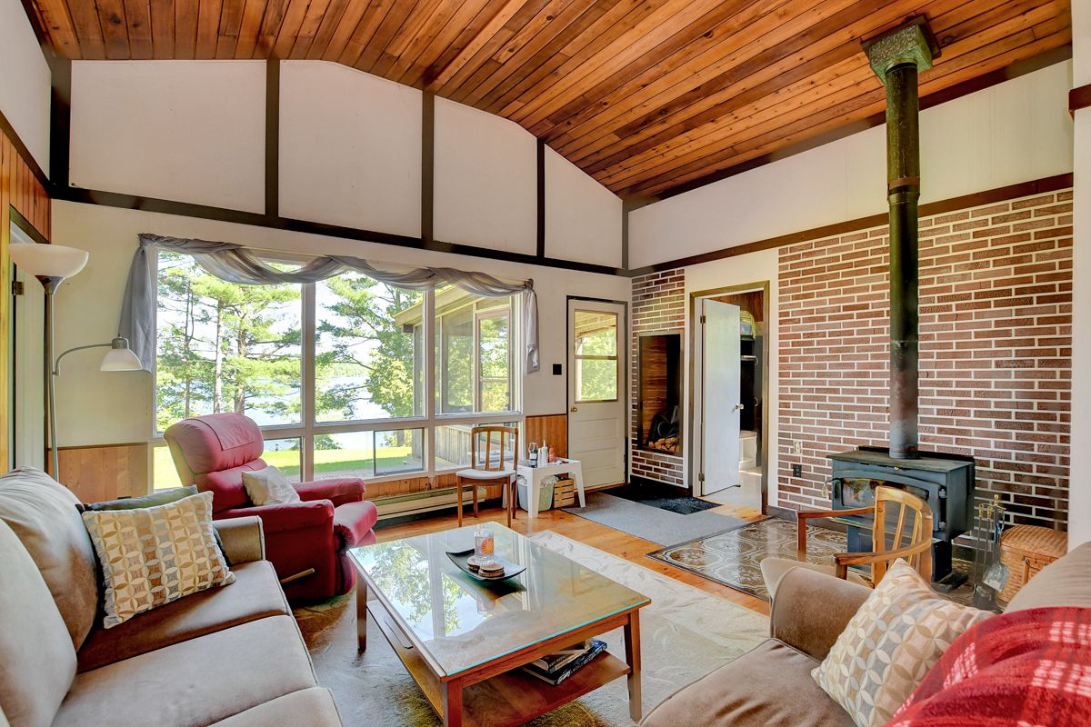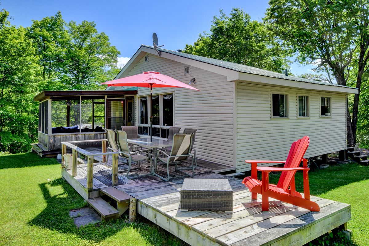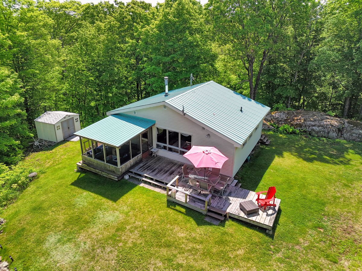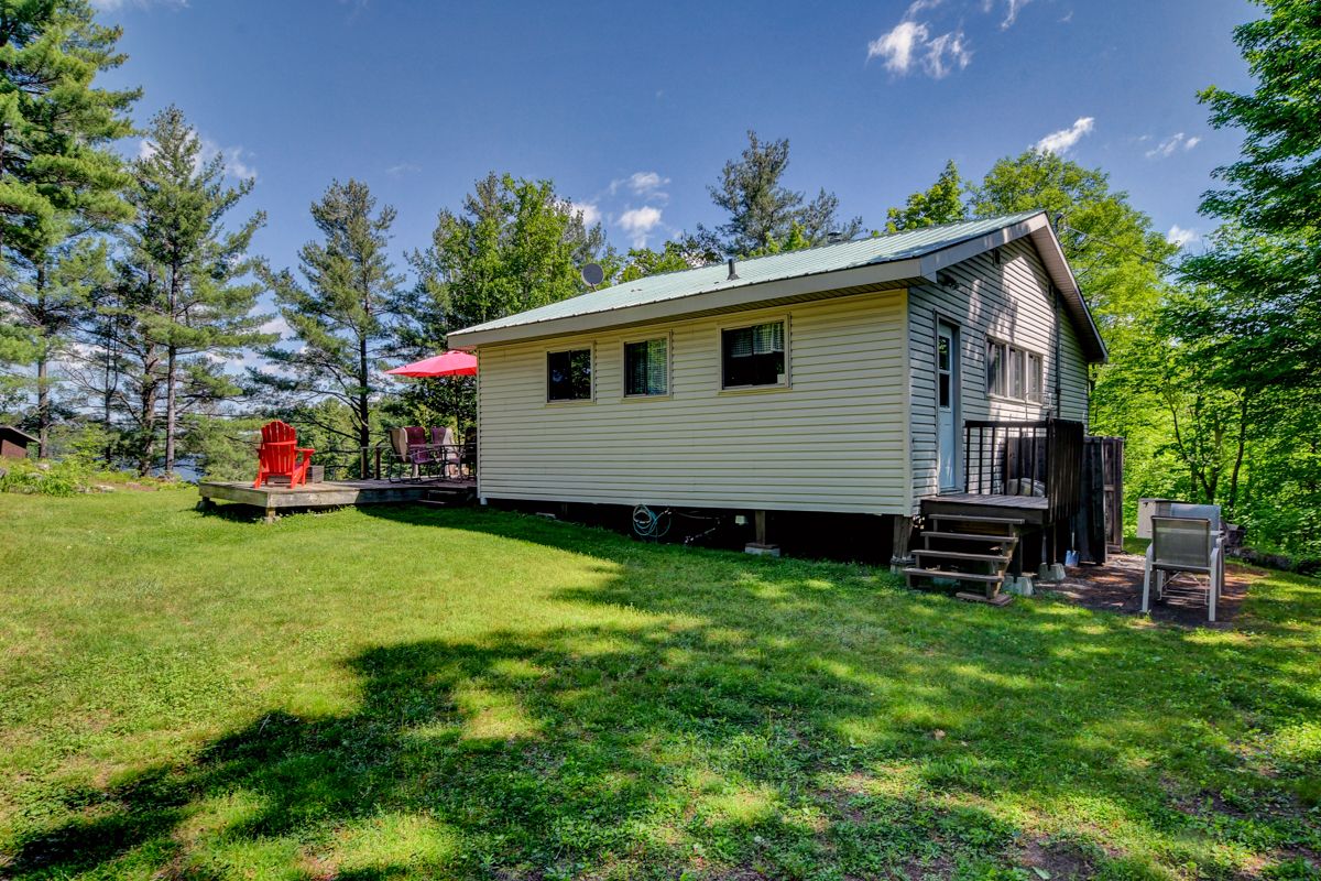 Rare opportunity to own 6. 9 acres of waterfront with approximately 850 feet of shoreline and mature mixed forest offering exceptional privacy. This rustic three-season cottage features tongue and groove pine ceilings, a durable metal roof, and an open-concept living area with expansive lake-facing windows. Three bedrooms provide cozy accommodations, while a screened sunroom and spacious deck are ideal for outdoor entertaining. Set slightly elevated, a newer staircase leads down to the water and a large dock in a private bay, perfect for swimming and boating. Property offers excellent future potential to enjoy as-is, build, or explore severance possibilities (buyer to complete due diligence with township). Water source is lake intake. Annual road maintenance fee $134. 24-hour irrevocable on all offers.