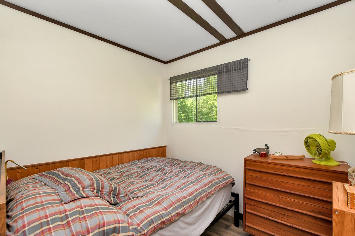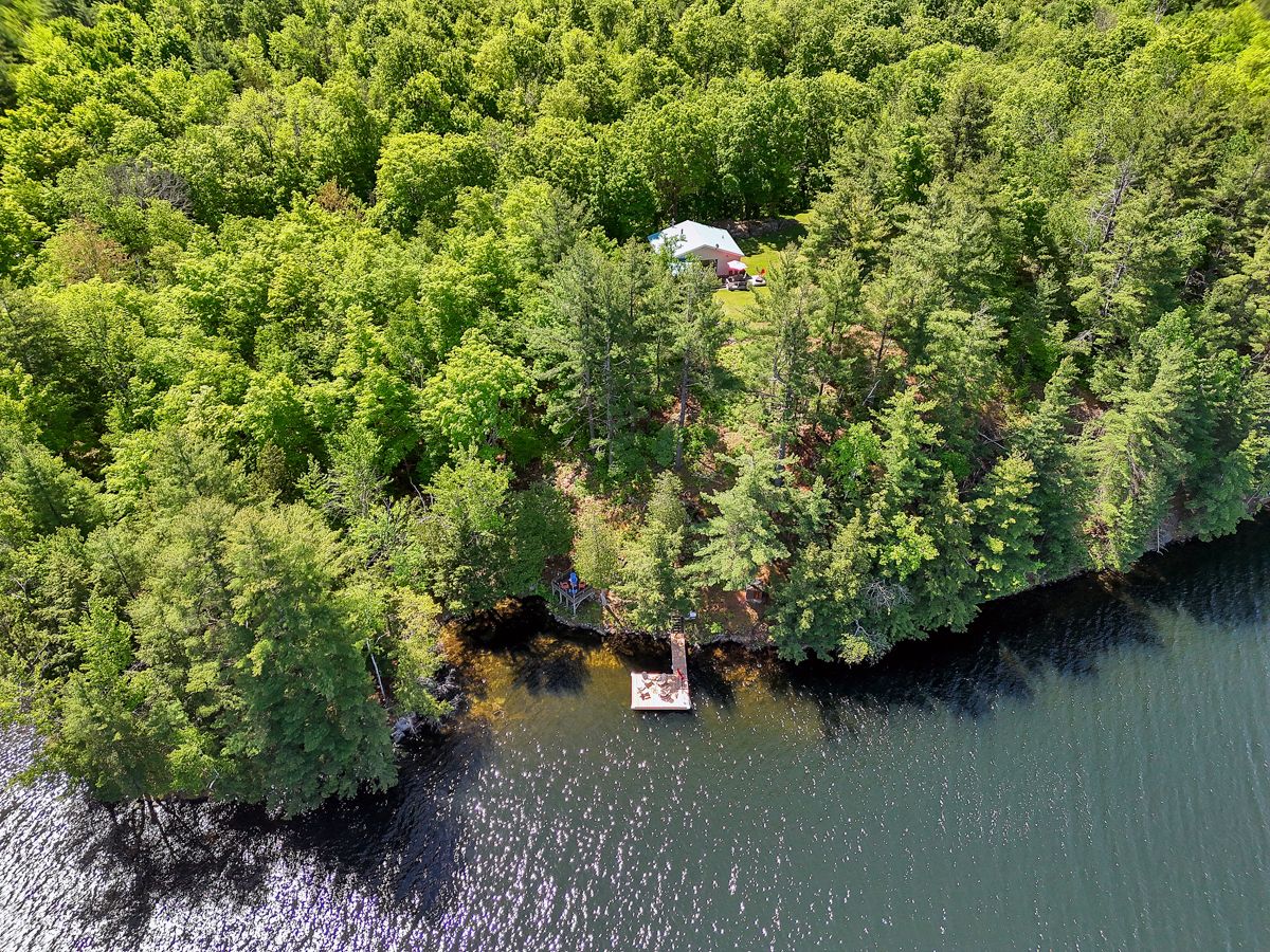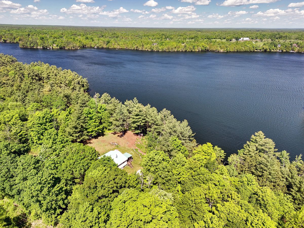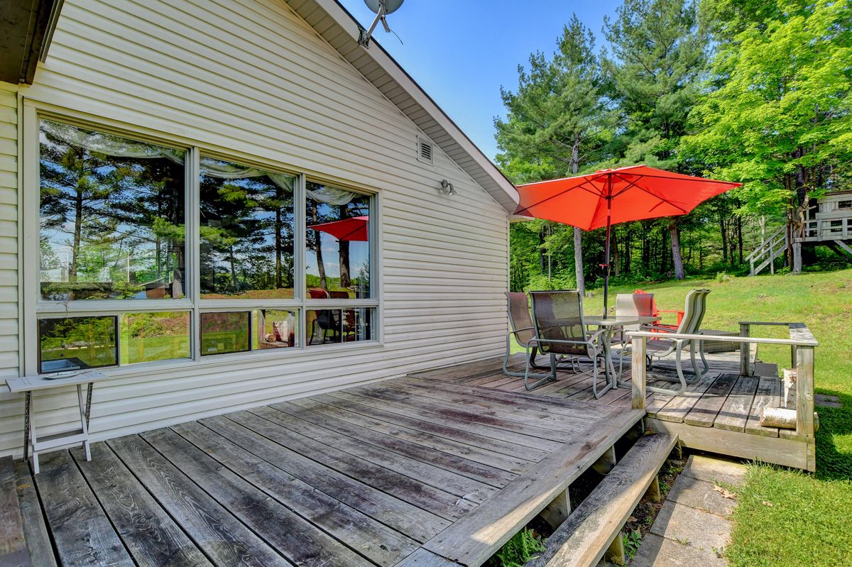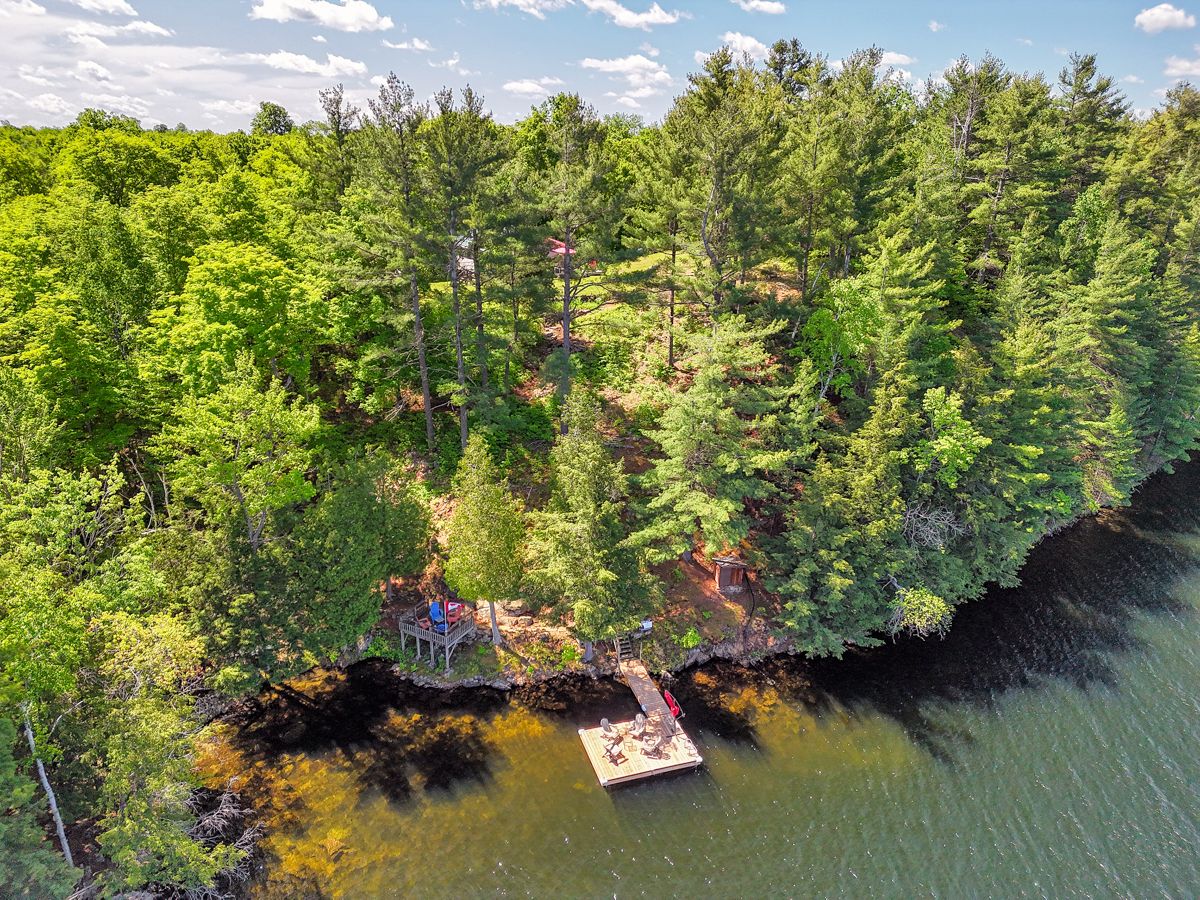 Rare opportunity to own 6. 9 acres of waterfront with approximately 850 feet of shoreline and mature mixed forest offering exceptional privacy. This rustic three-season cottage features tongue and groove pine ceilings, a durable metal roof, and an open-concept living area with expansive lake-facing windows. Three bedrooms provide cozy accommodations, while a screened sunroom and spacious deck are ideal for outdoor entertaining. Set slightly elevated, a newer staircase leads down to the water and a large dock in a private bay, perfect for swimming and boating. Property offers excellent future potential to enjoy as-is, build, or explore severance possibilities (buyer to complete due diligence with township). Water source is lake intake. Annual road maintenance fee $134. 24-hour irrevocable on all offers.