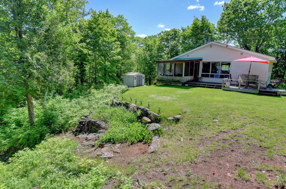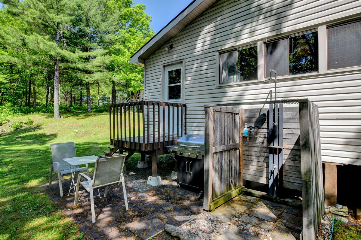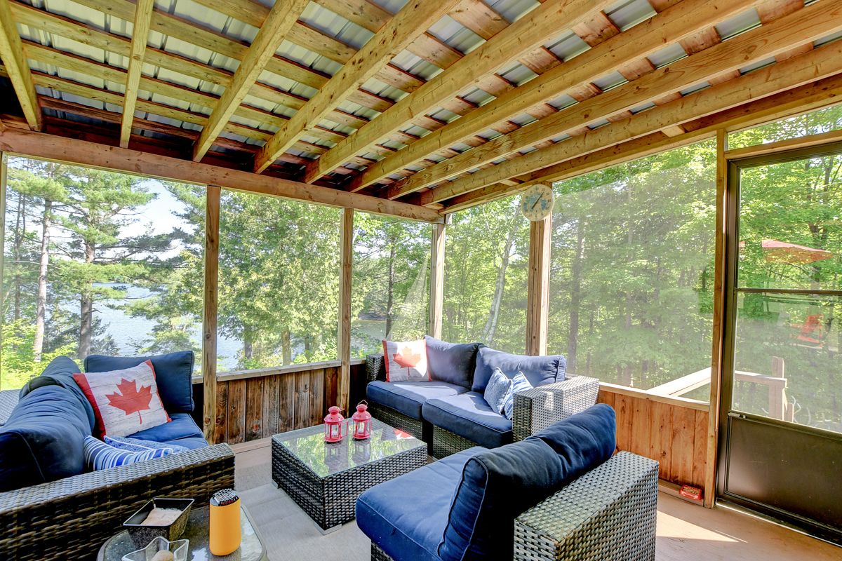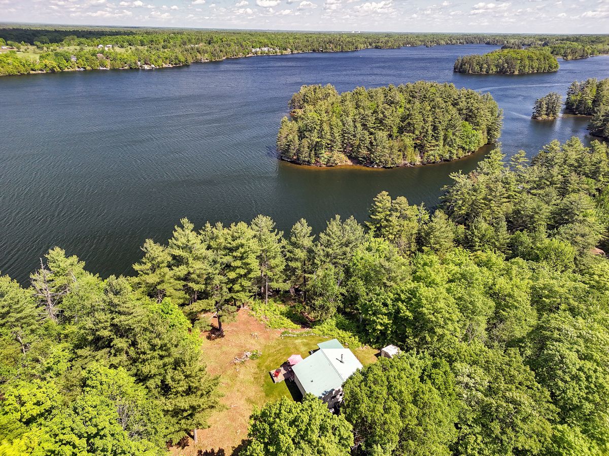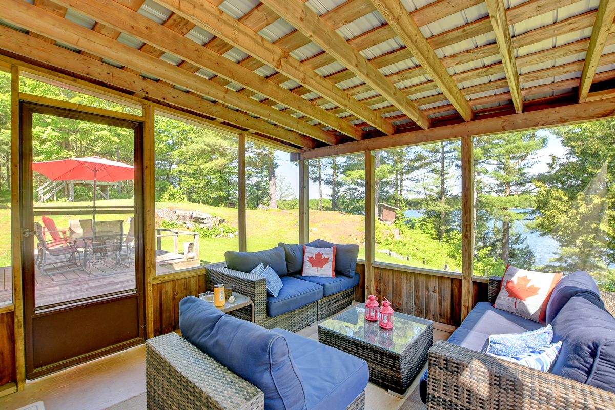 Rare opportunity to own 6. 9 acres of waterfront with approximately 850 feet of shoreline and mature mixed forest offering exceptional privacy. This rustic three-season cottage features tongue and groove pine ceilings, a durable metal roof, and an open-concept living area with expansive lake-facing windows. Three bedrooms provide cozy accommodations, while a screened sunroom and spacious deck are ideal for outdoor entertaining. Set slightly elevated, a newer staircase leads down to the water and a large dock in a private bay, perfect for swimming and boating. Property offers excellent future potential to enjoy as-is, build, or explore severance possibilities (buyer to complete due diligence with township). Water source is lake intake. Annual road maintenance fee $134. 24-hour irrevocable on all offers.