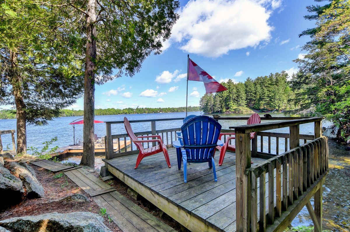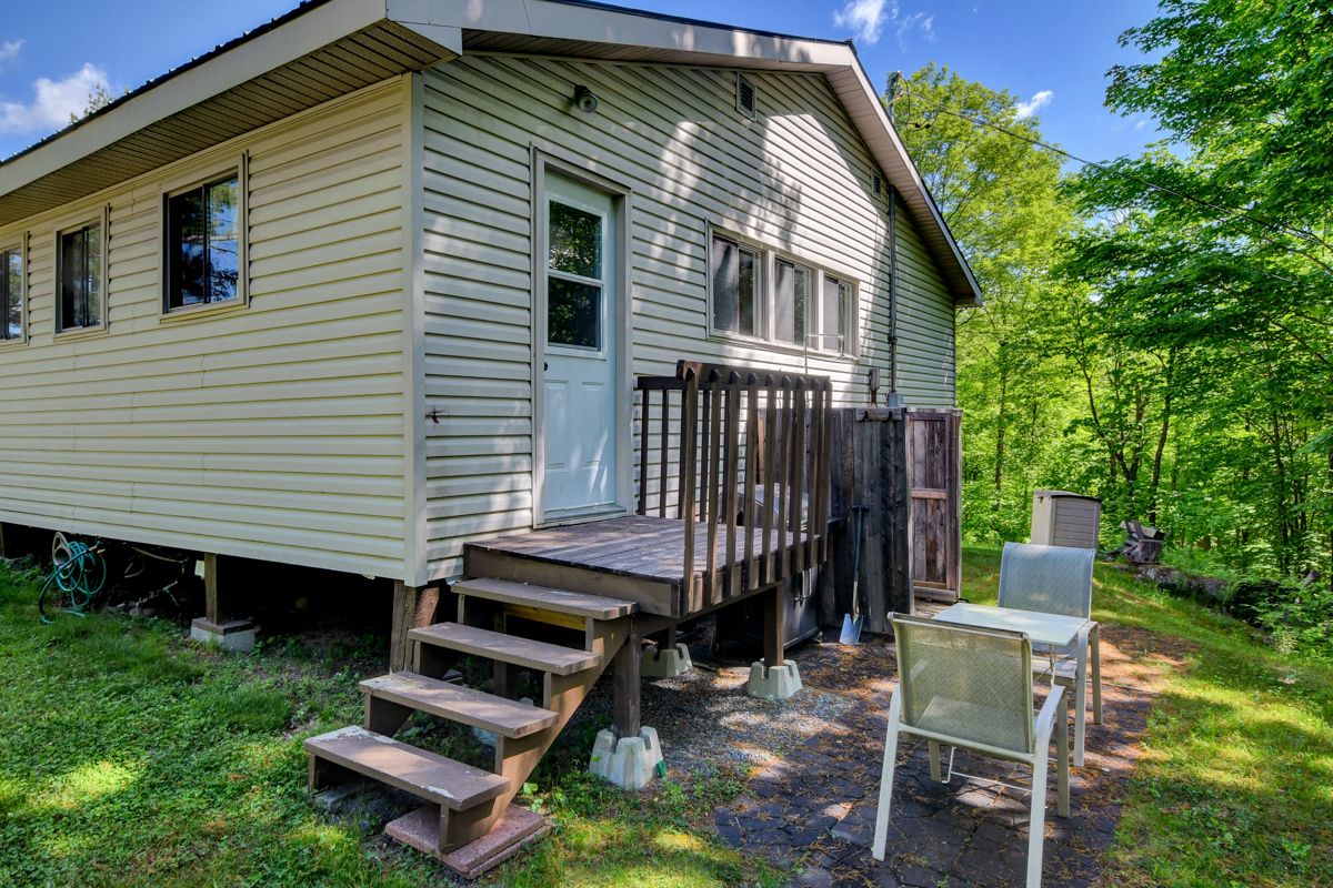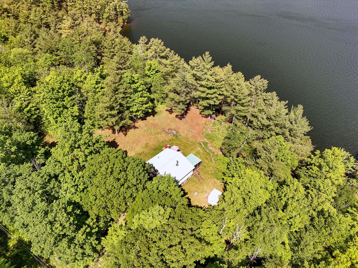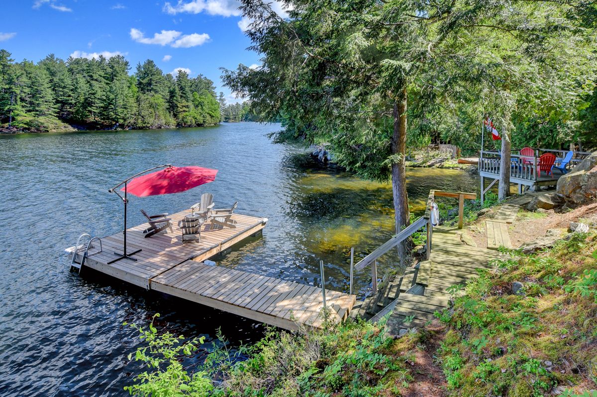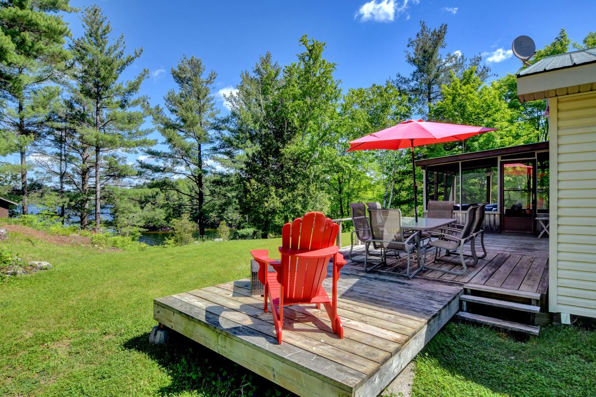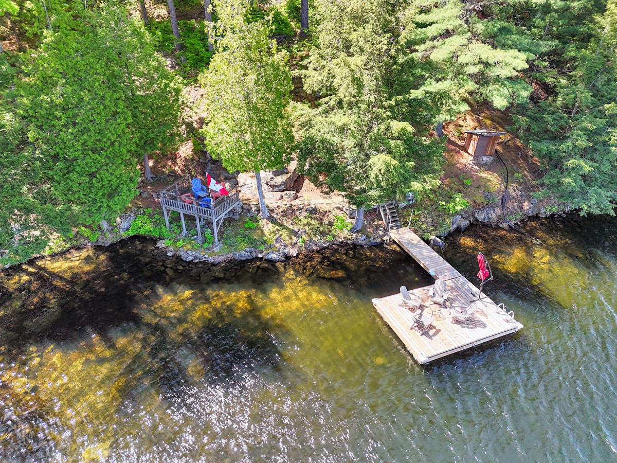 Rare opportunity to own 6. 9 acres of waterfront with approximately 850 feet of shoreline and mature mixed forest offering exceptional privacy. This rustic three-season cottage features tongue and groove pine ceilings, a durable metal roof, and an open-concept living area with expansive lake-facing windows. Three bedrooms provide cozy accommodations, while a screened sunroom and spacious deck are ideal for outdoor entertaining. Set slightly elevated, a newer staircase leads down to the water and a large dock in a private bay, perfect for swimming and boating. Property offers excellent future potential to enjoy as-is, build, or explore severance possibilities (buyer to complete due diligence with township). Water source is lake intake. Annual road maintenance fee $134. 24-hour irrevocable on all offers.