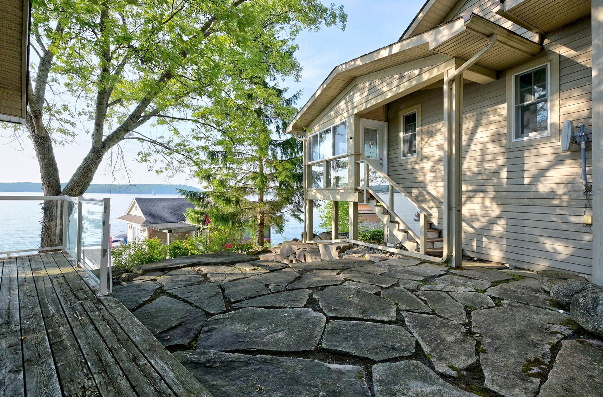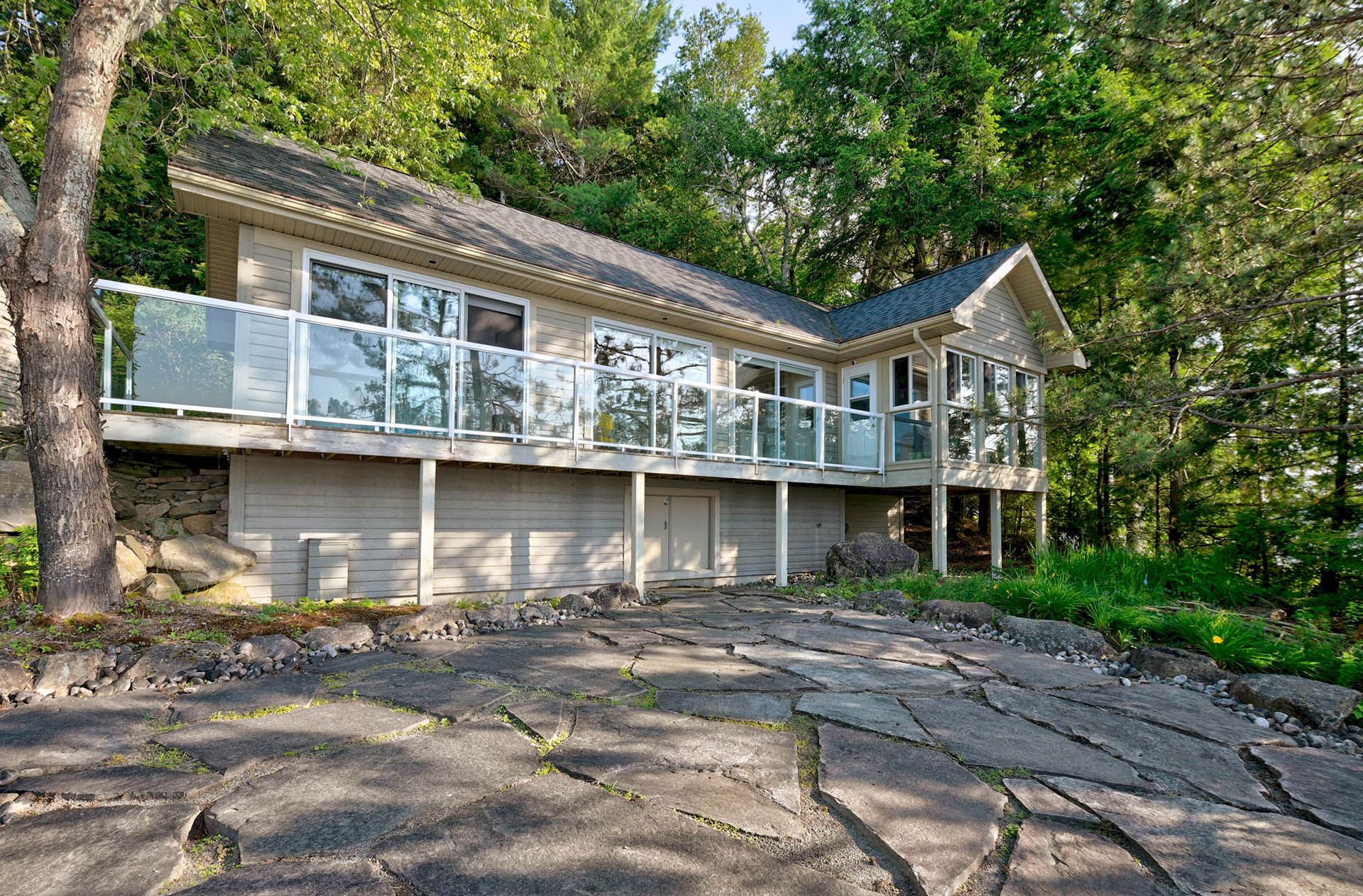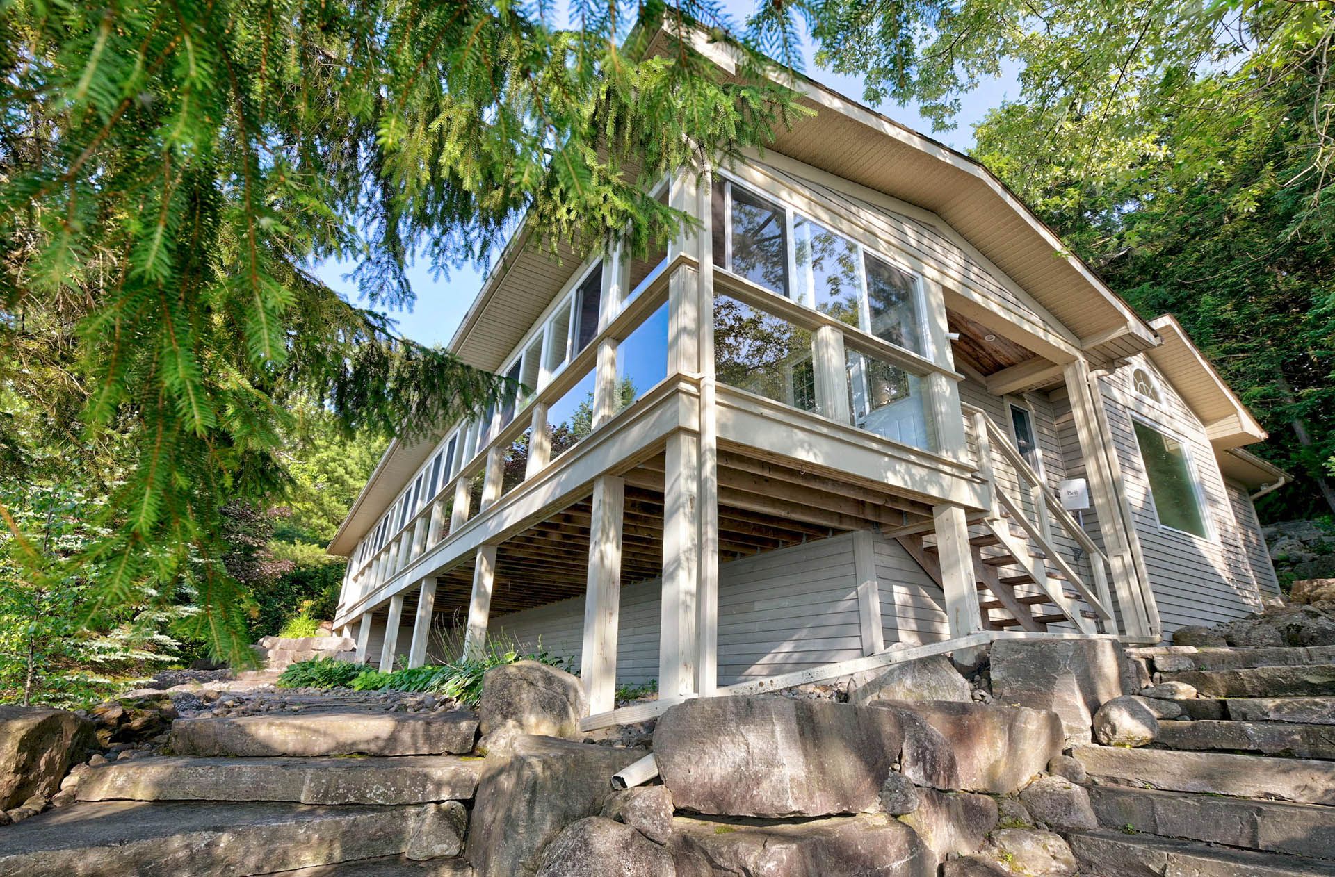 Prime lake of bays waterfront just outside baysville, only a two-hour drive from the gta, featuring 220 feet of pristine shoreline. This executive family compound offers two beautifully designed cottages. The main cottage boasts three bedrooms and two bathrooms, with a spacious open-concept great room that opens onto a 780 sq. Ft. Porch-perfect for entertaining or relaxing. The fully equipped two-bedroom and one bathroom guest cottage, complete with its own kitchen, is connected by professionally crafted stone pathways and patios, creating a seamless and inviting retreat for family and guests. Just steps from the water, the property includes a two-slip boathouse and generous dock, ideal for swimming, boating, and lakeside living. Enjoy breathtaking sunsets in this serene, private setting, while remaining just minutes from bigwin island.