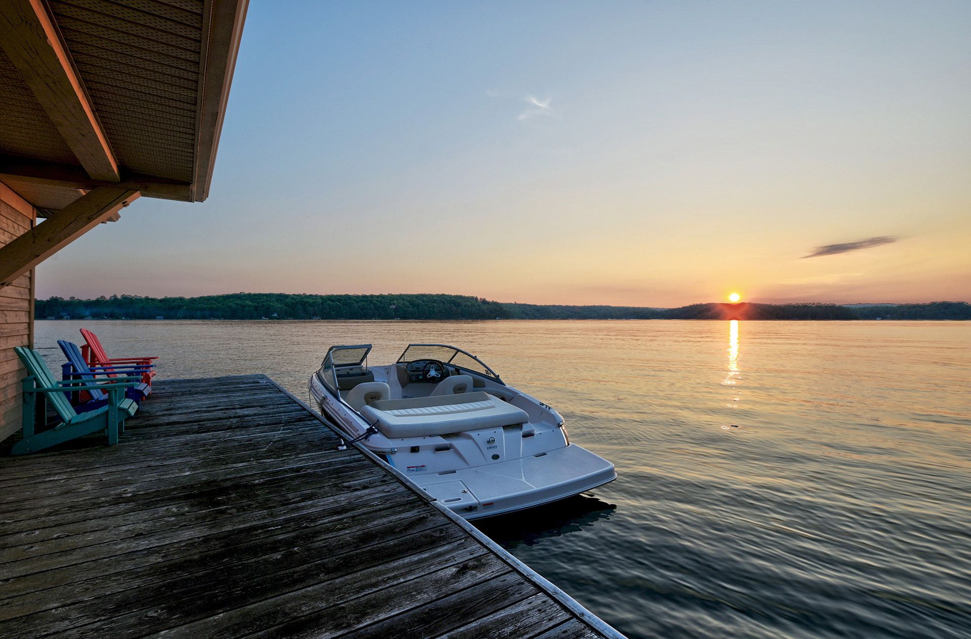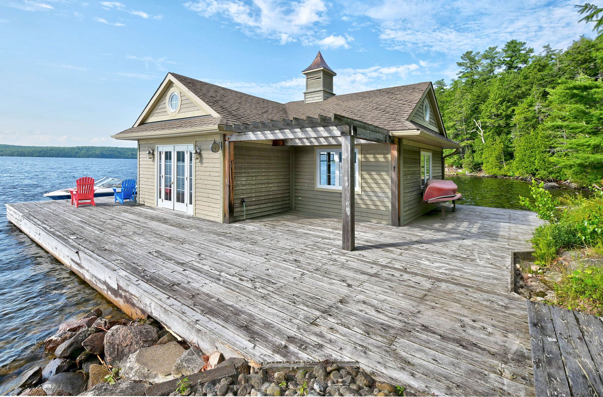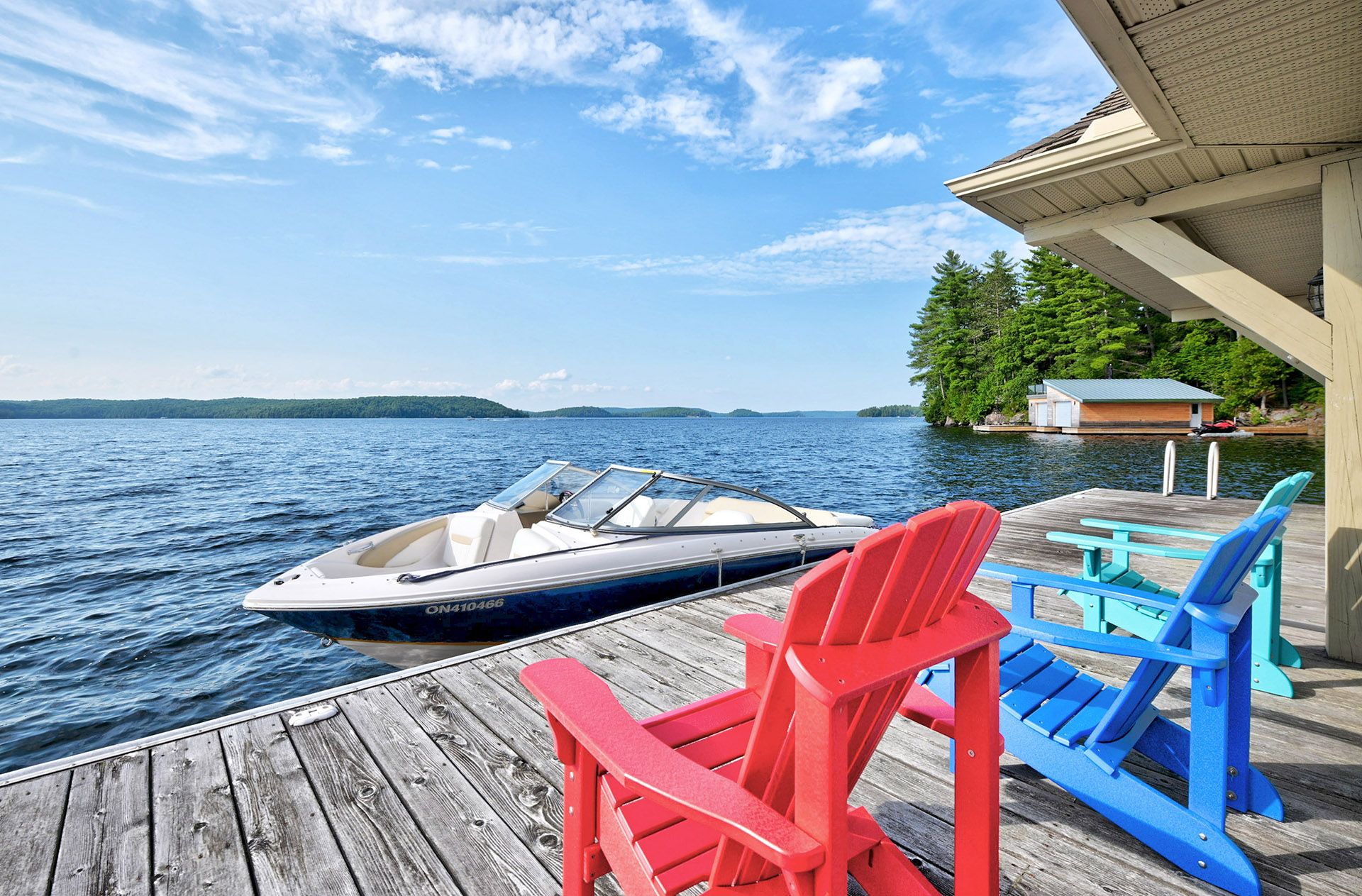 • Two-slip boathouse and dock perfect for swimming and boating.