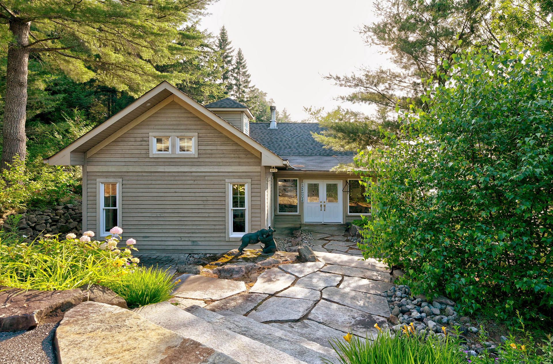 • Guest cottage includes kitchen and connects via stone pathways.