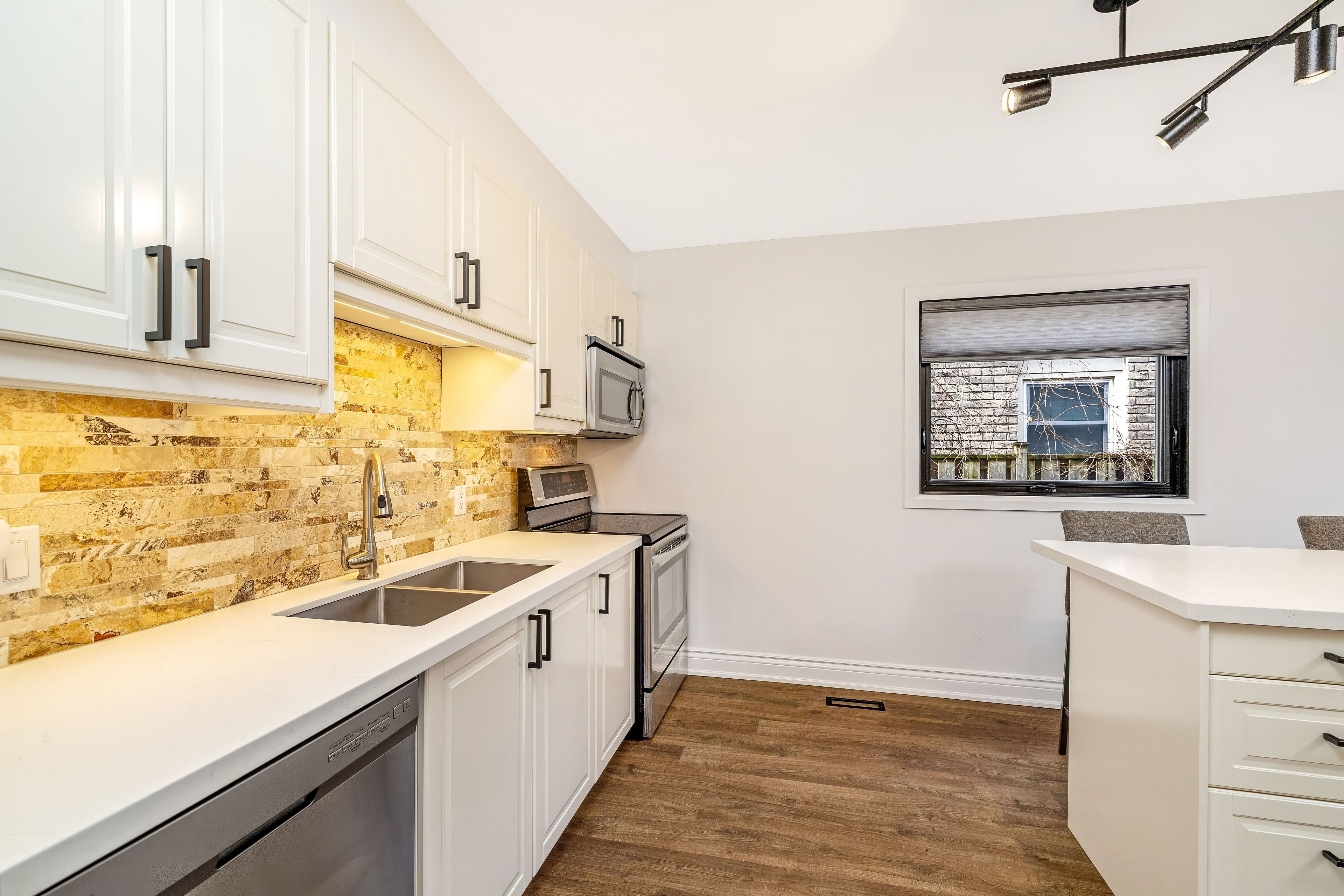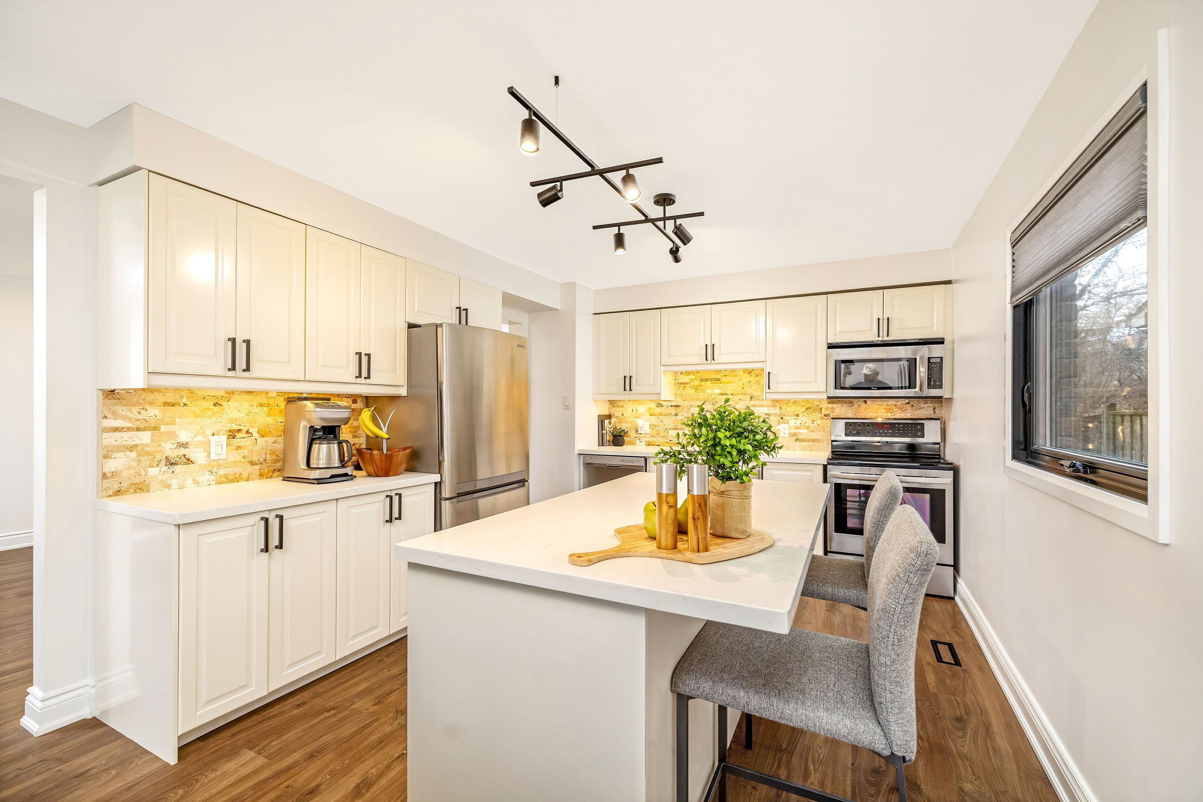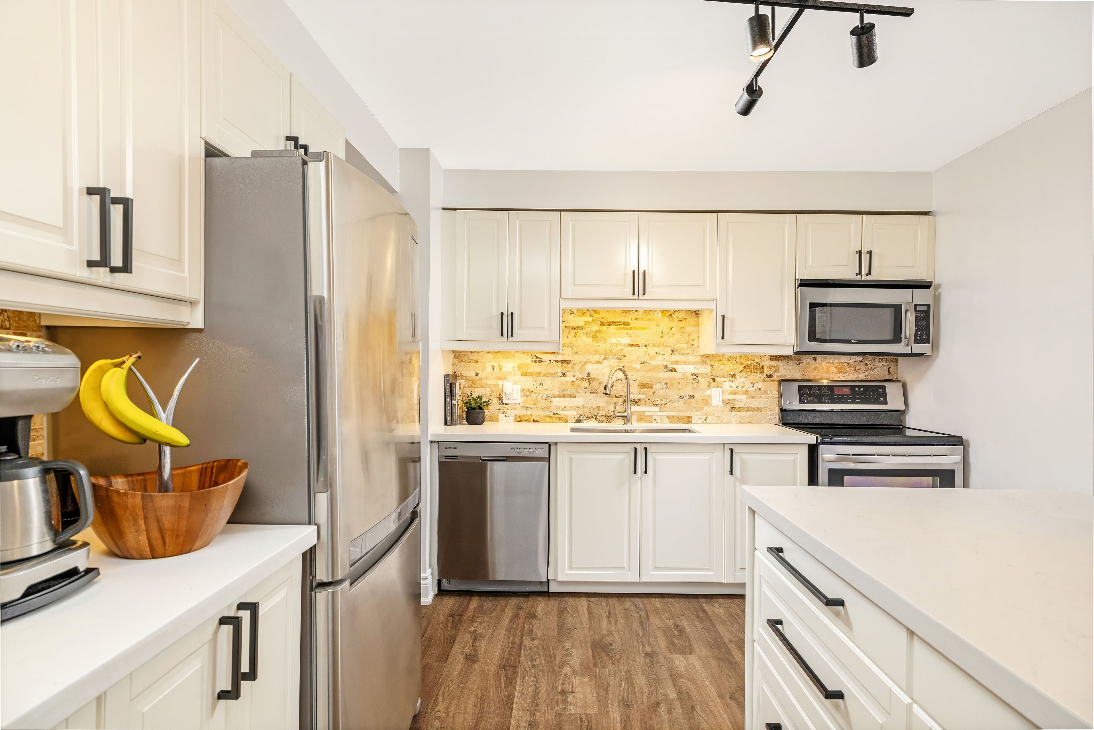 • Stylish kitchen with quartz countertops and stainless steel appliances.
