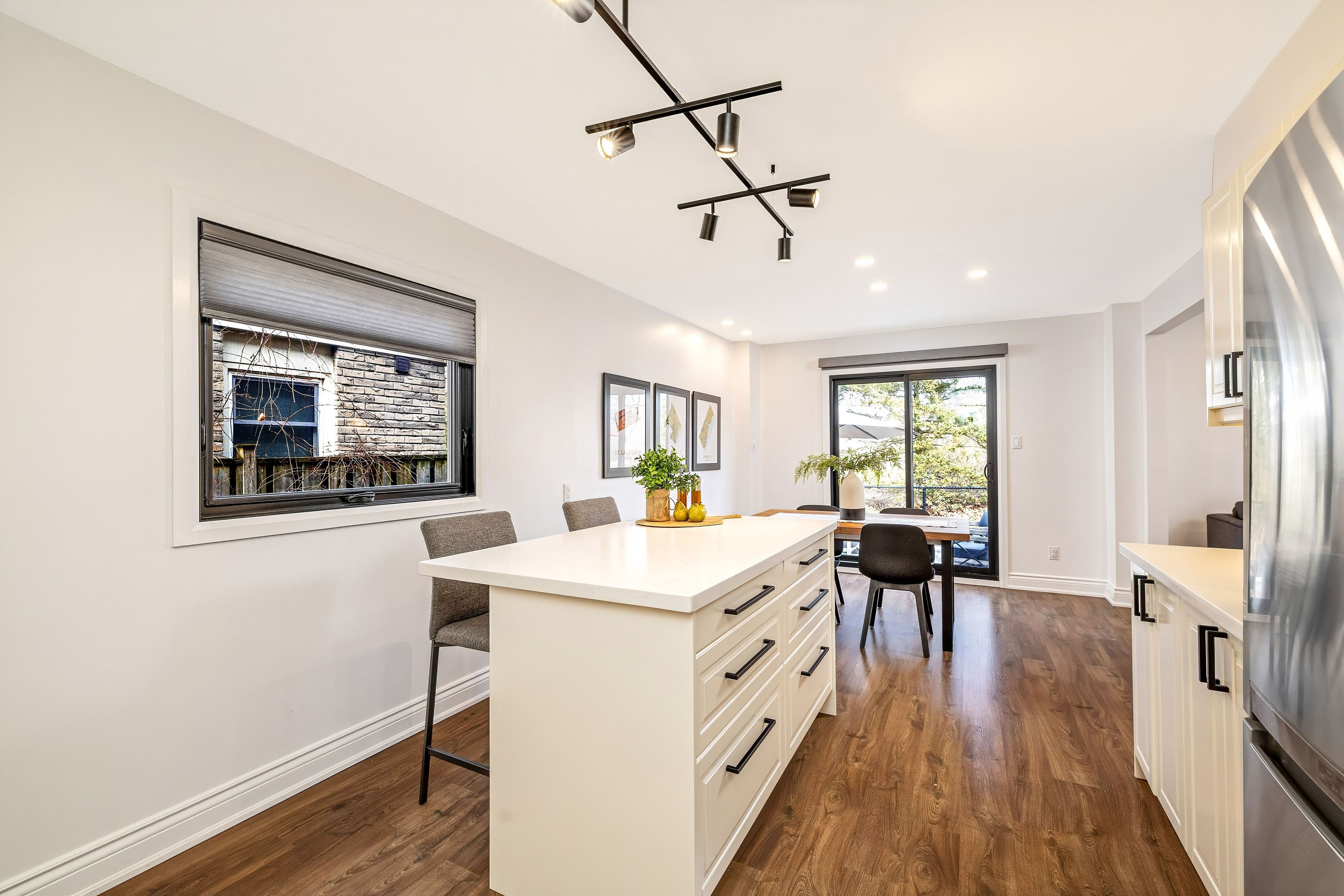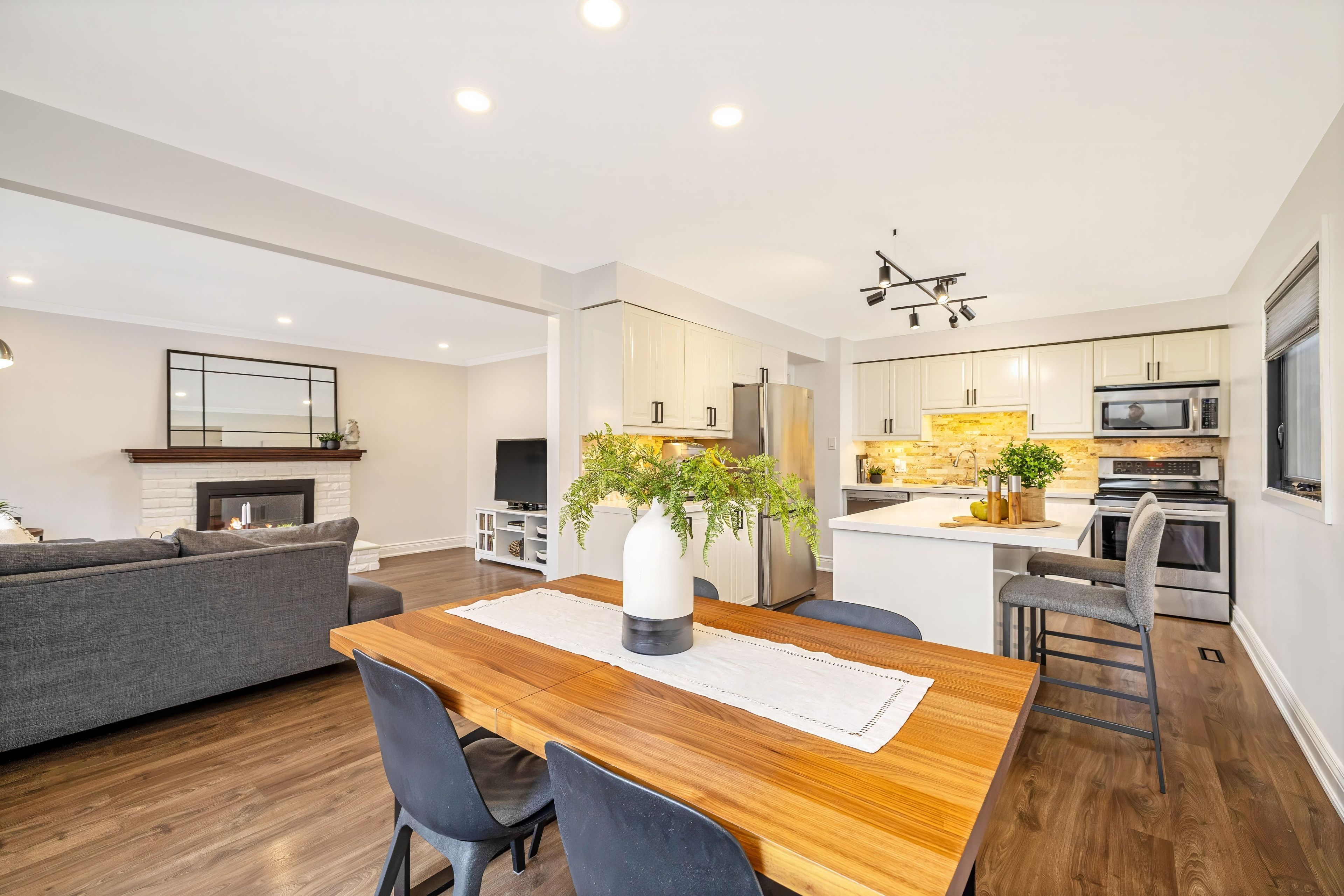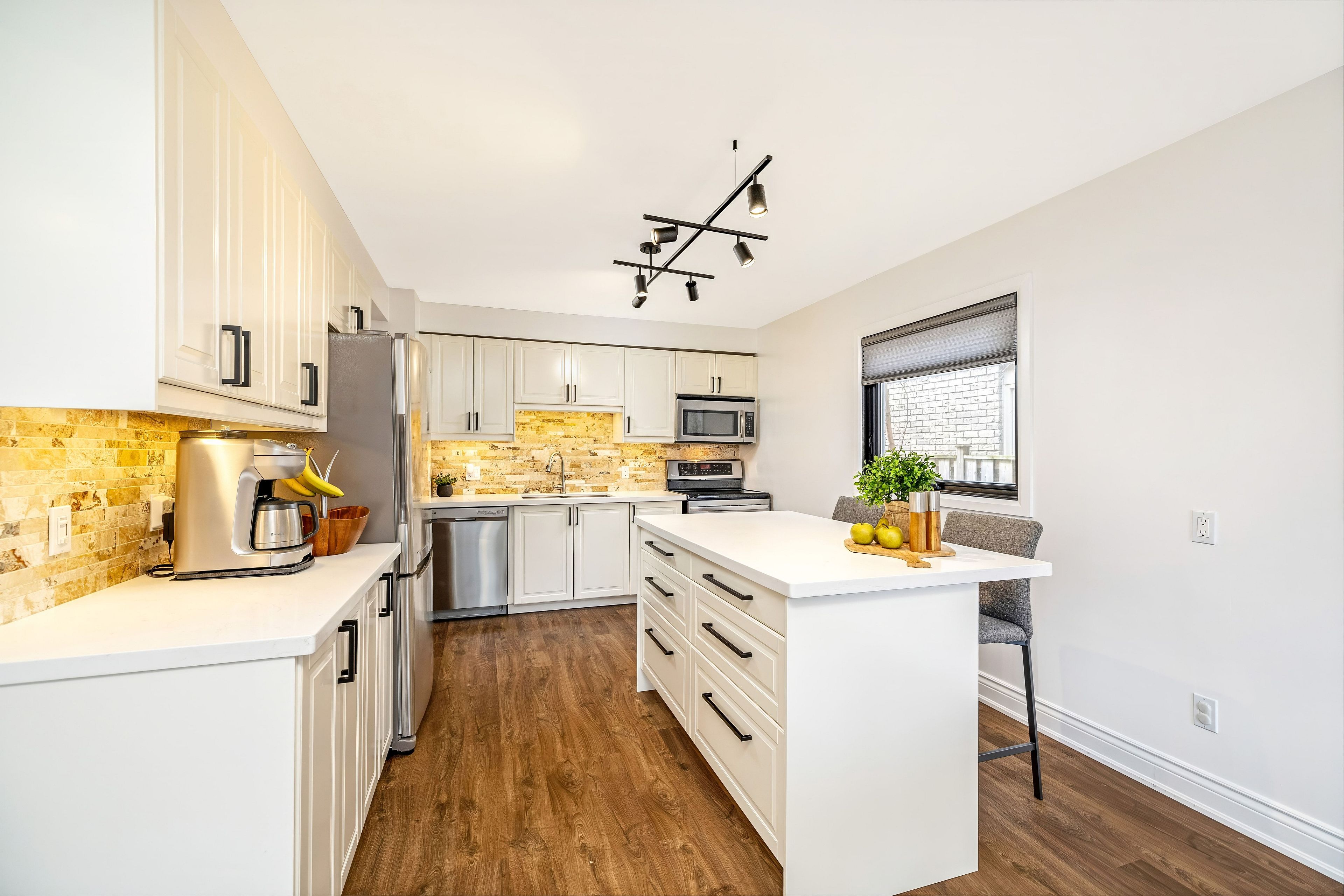 • Stylish kitchen with quartz countertops and stainless steel appliances.