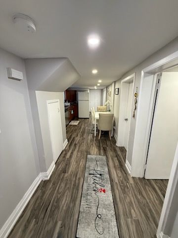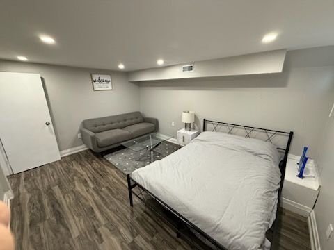 Fully furnished available short term and long term. Renovated 2 bedroom basement apartment with separate entrance from side of house, two large size bedroom and family room,can use family room as third room. New floors, new bathrooms. Pot lights. Shared landry,large closet and storage space, . Parking in drive way is available. 2 min walk to bus station ,close to high rank school ,walmart, grocery shops and go station