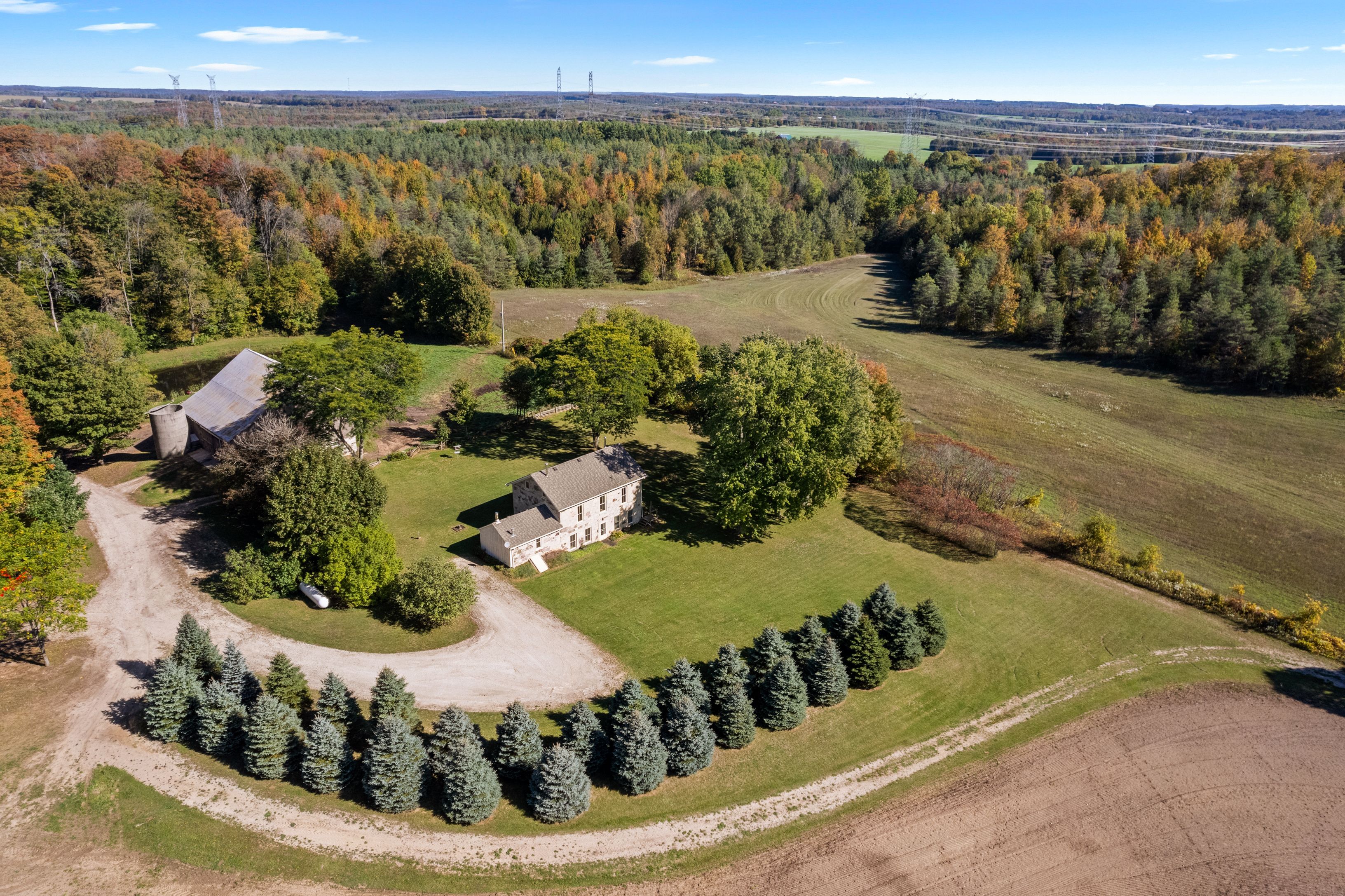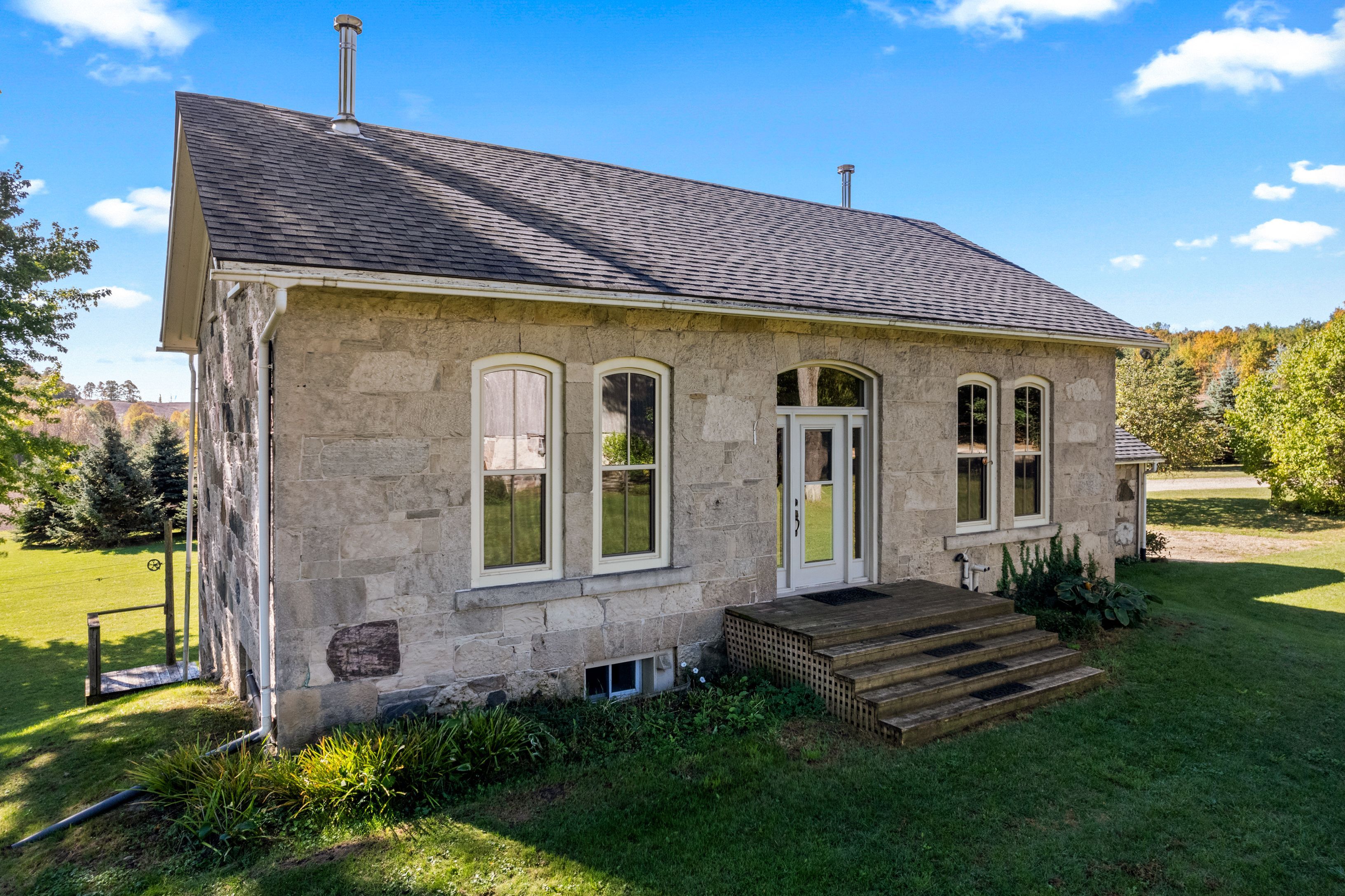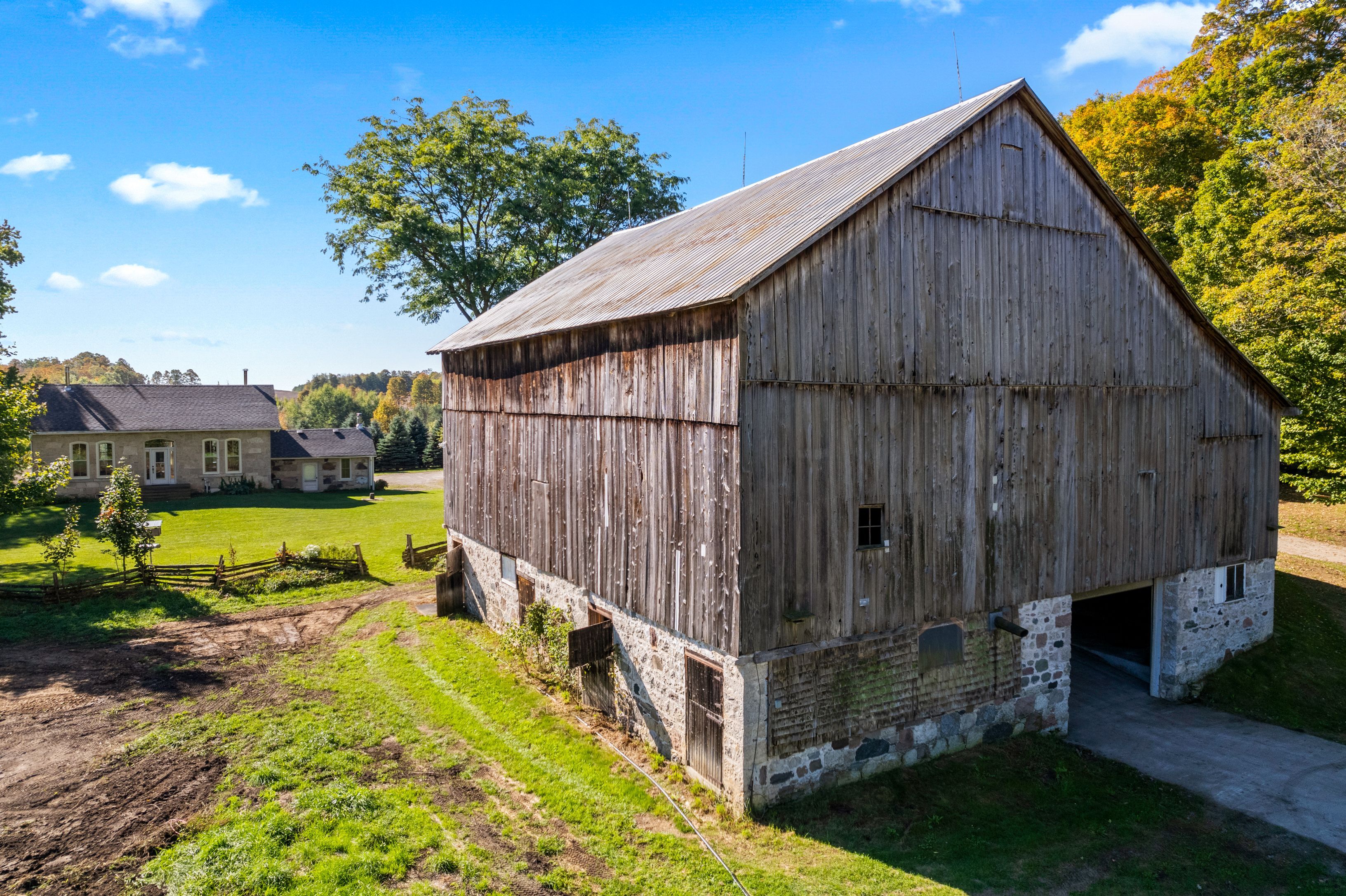 An exceptional stone farmhouse set in the middle of 71. 65 acres of rolling hills, mature forest and beautiful views. This functional estate includes 35 workable or cleared pasture acres, and 35 acres of woodland with ponds and trails. Ultimate privacy is assured via the long, tree-lined lane leading to the historic 1870s stone house. With its unmistakable character and modernized farmhouse charm boasting over 2200 sq. Ft of space, 3 bedrooms and 2 full bathrooms with space for more. Perfectly blending history and modernity, featuring hardwood floors and an updated modern kitchen. The home retains its original trims and moldings, cozy certified woodstoves (plus the convenience of propane forced air furnace with a/c), a full walk-out lower level with a bathroom featuring in-floor radiant heat, and an inviting exposed stone bedroom or bonus family room with propane stove. The clean and prepared open attic (35'6x11'7) is ready for conversion into additional living space, a cozy bedroom suite or office- the inspiring canvas is ready. The property's crowning jewel is the original 54x53 bank barn. The upper barn space is ideal for storage but well enough maintained and preserved to set the stage for event hosting with carriage lights mounted on the beams and fairy lights strung along the rafters. While the lower level workshop/garage is perfect for multiple vehicles, equipment storage, or a clean slate for horse stable and tack room conversion. The truly inspiring aspect of this property's location is how it backs onto the desirable unassumed sand road providing direct access for activities like quiet walks, horseback riding, or cross-country skiing into the vast 428 acres of allen parks forested lands. With groomed trails and the most beautiful and bountiful natural trillium blooms in ontario. Your search is over for an unique estate offering both historical charm and vast functional potential as a hobby or horse farm, rural retreat, event host, and private oasis.