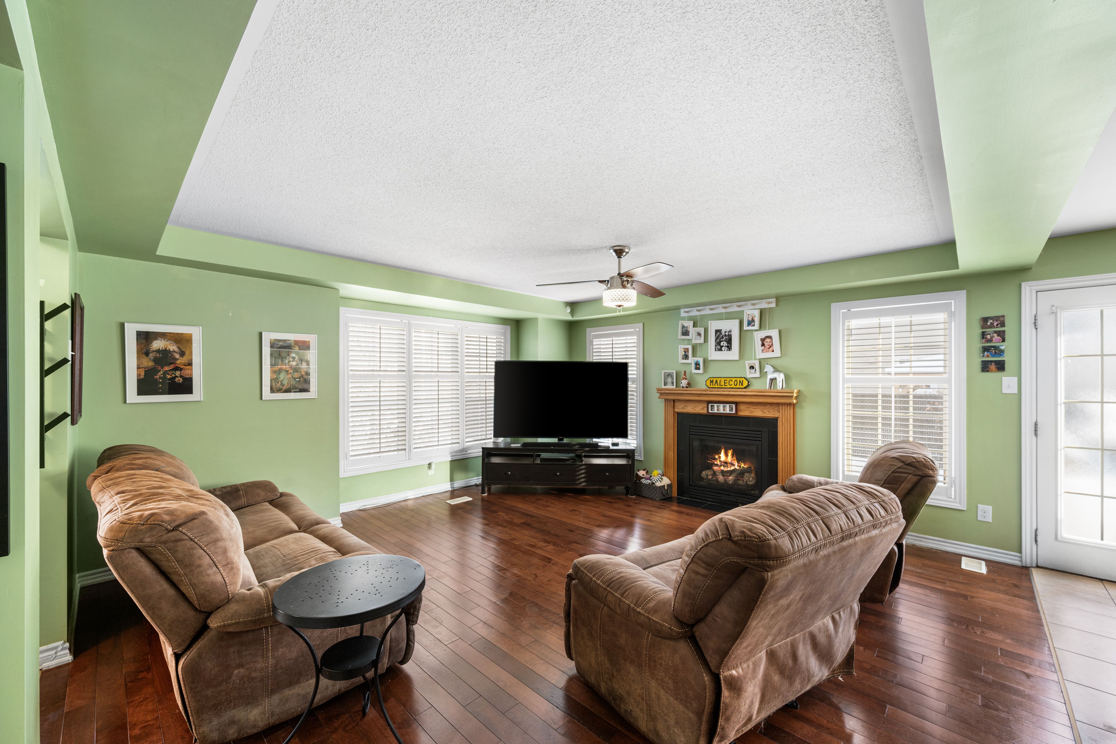 • Open-concept kitchen flows into the family room with a gas fireplace.