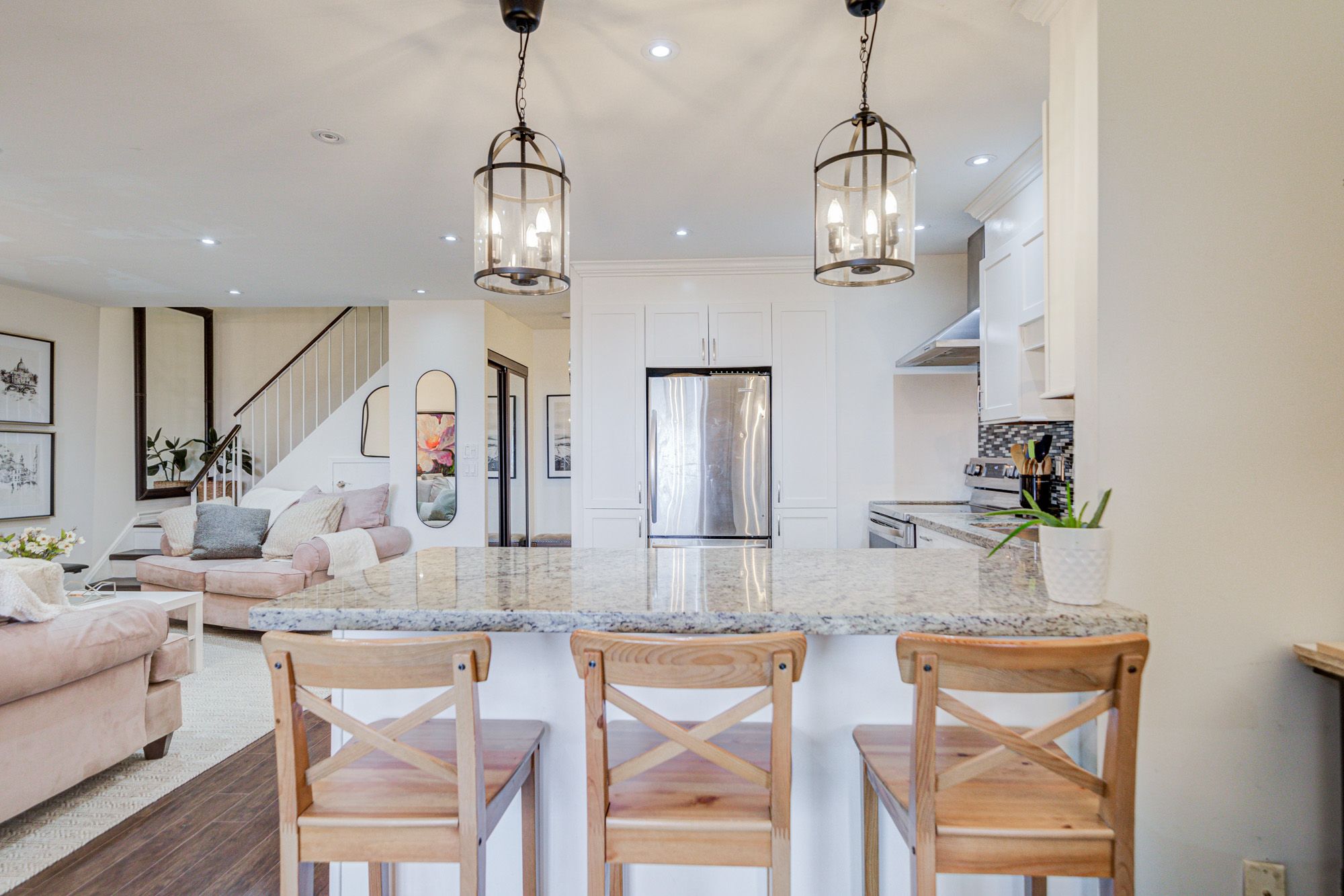 • Modern kitchen with granite countertops and seamless flow for entertaining.