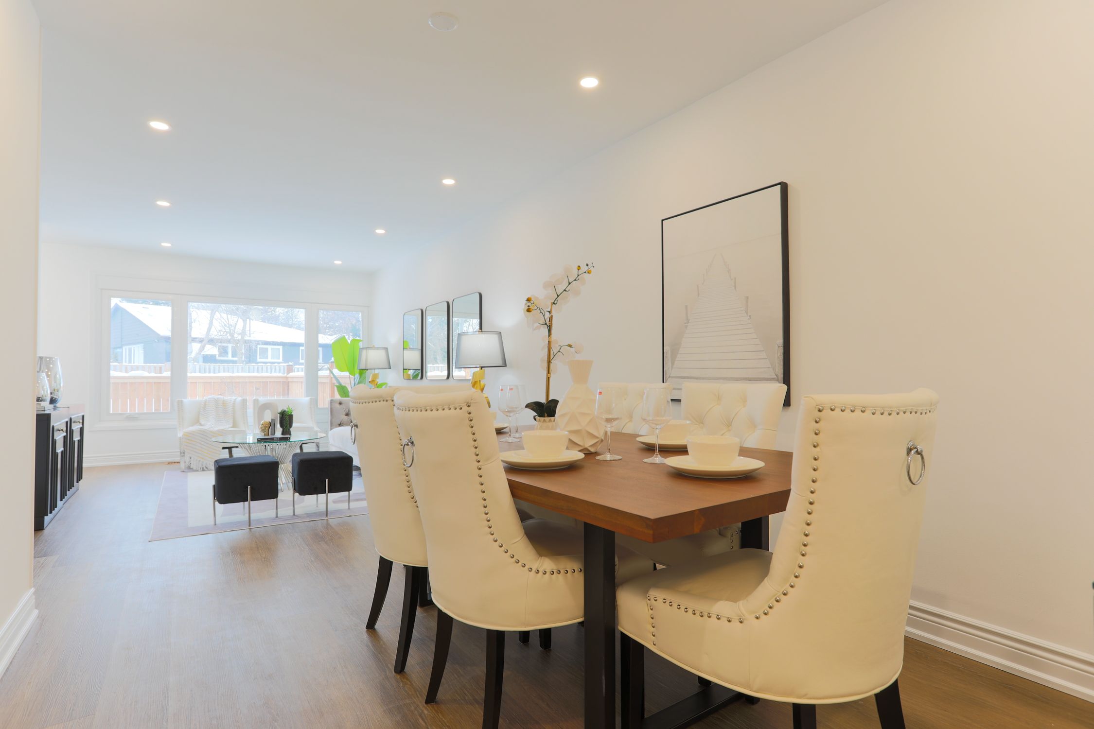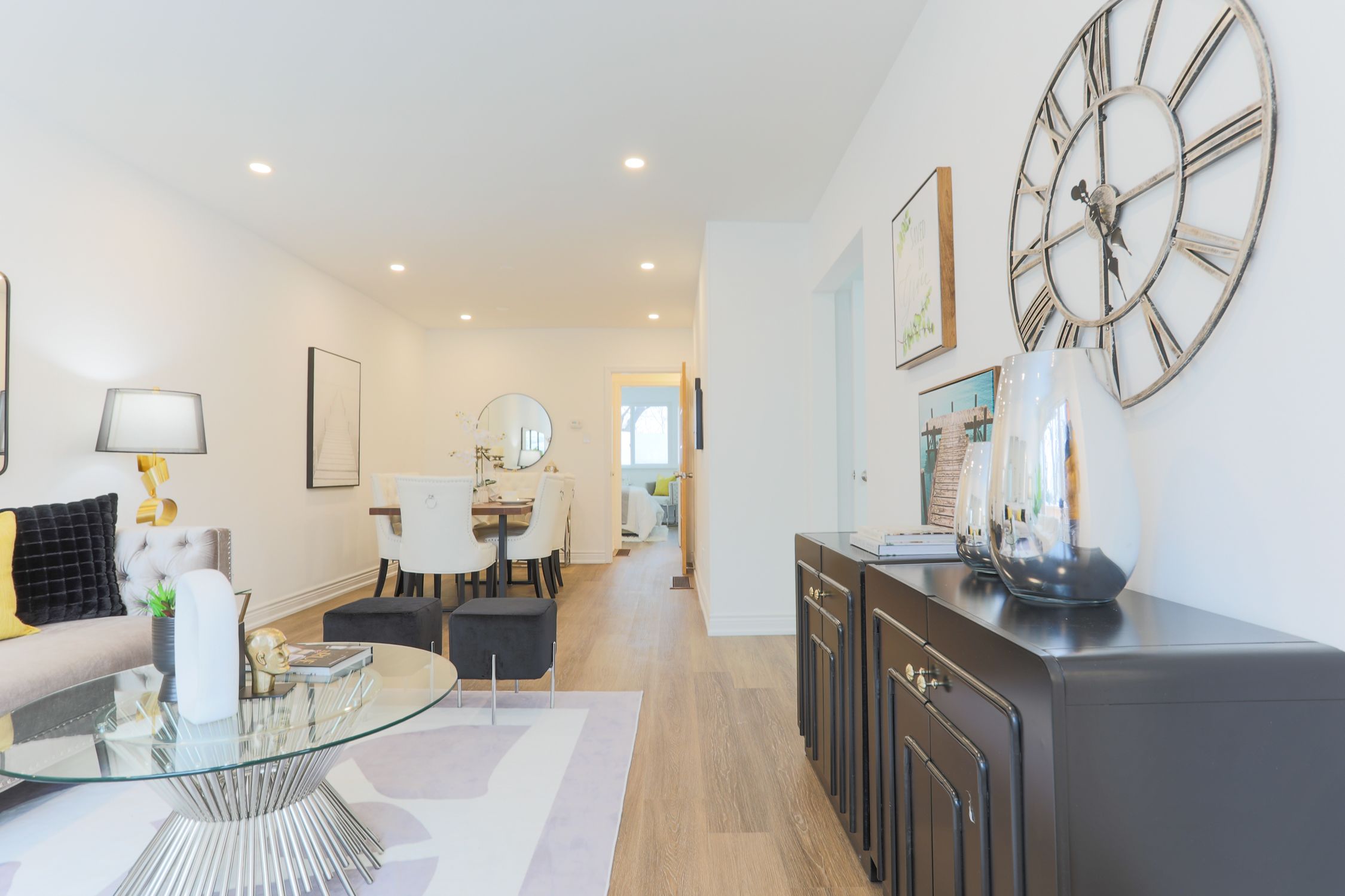 • Open-concept living and dining area brightened by large windows and pot lights.