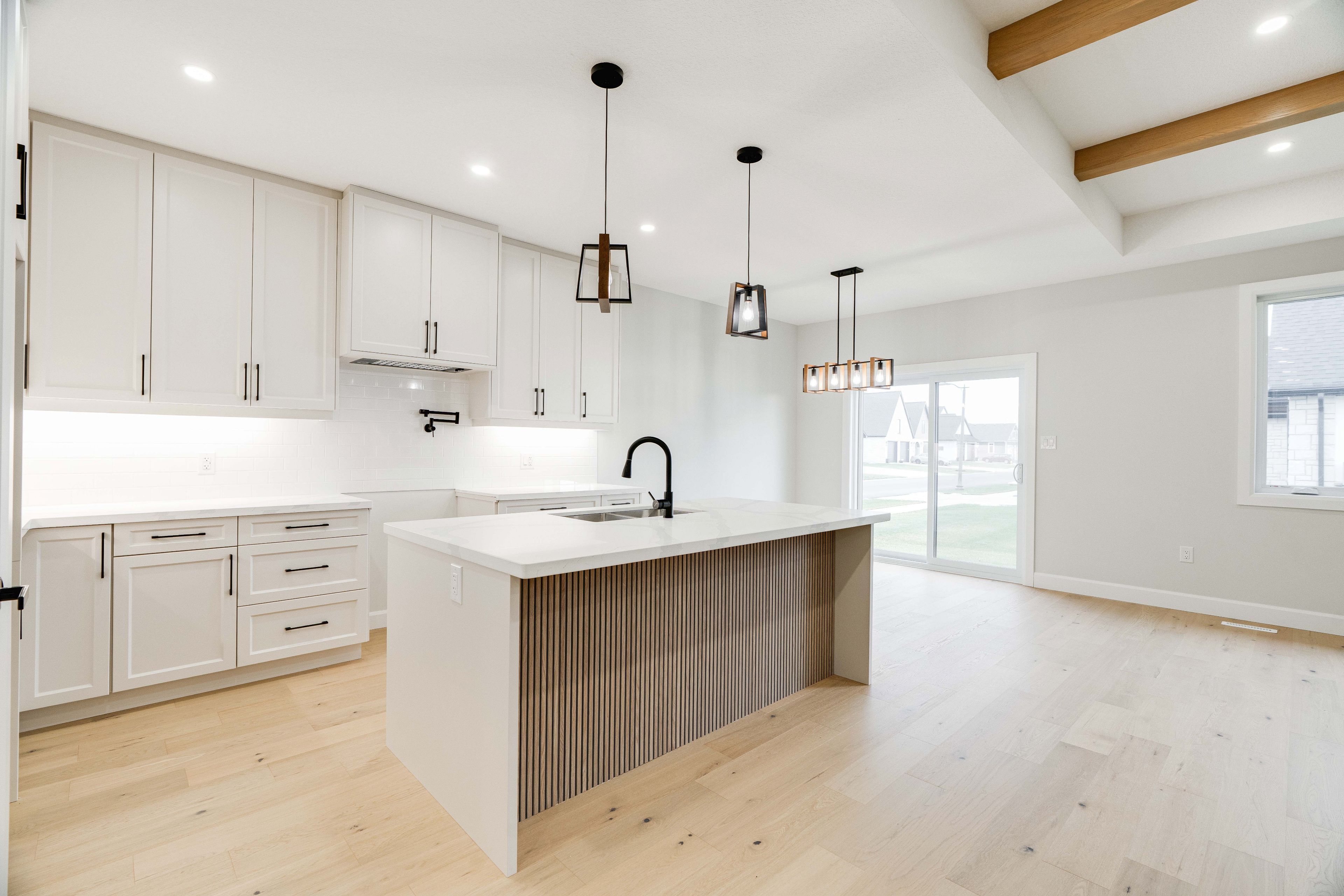 • Gourmet kitchen featuring quartz countertops and island seating for four.