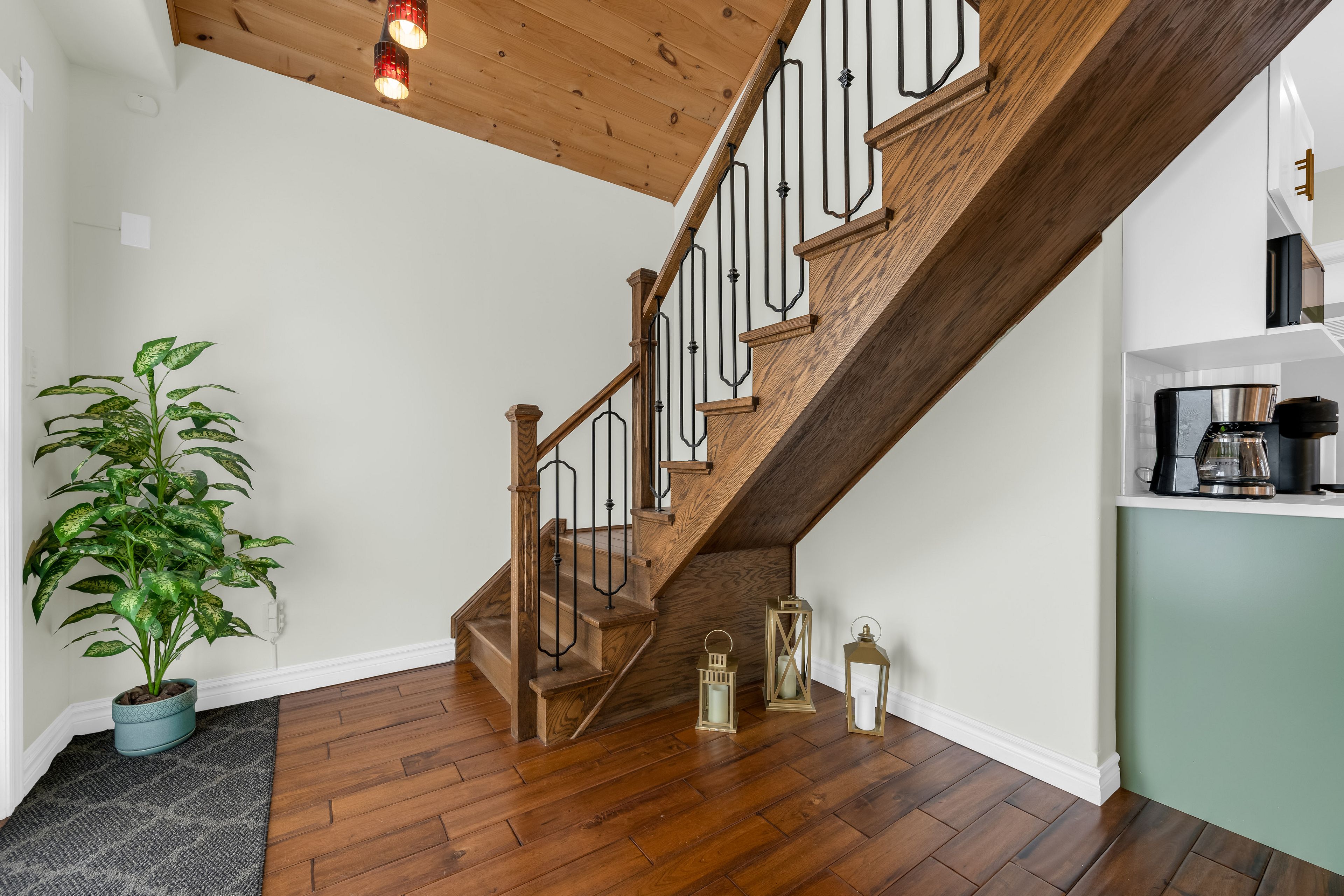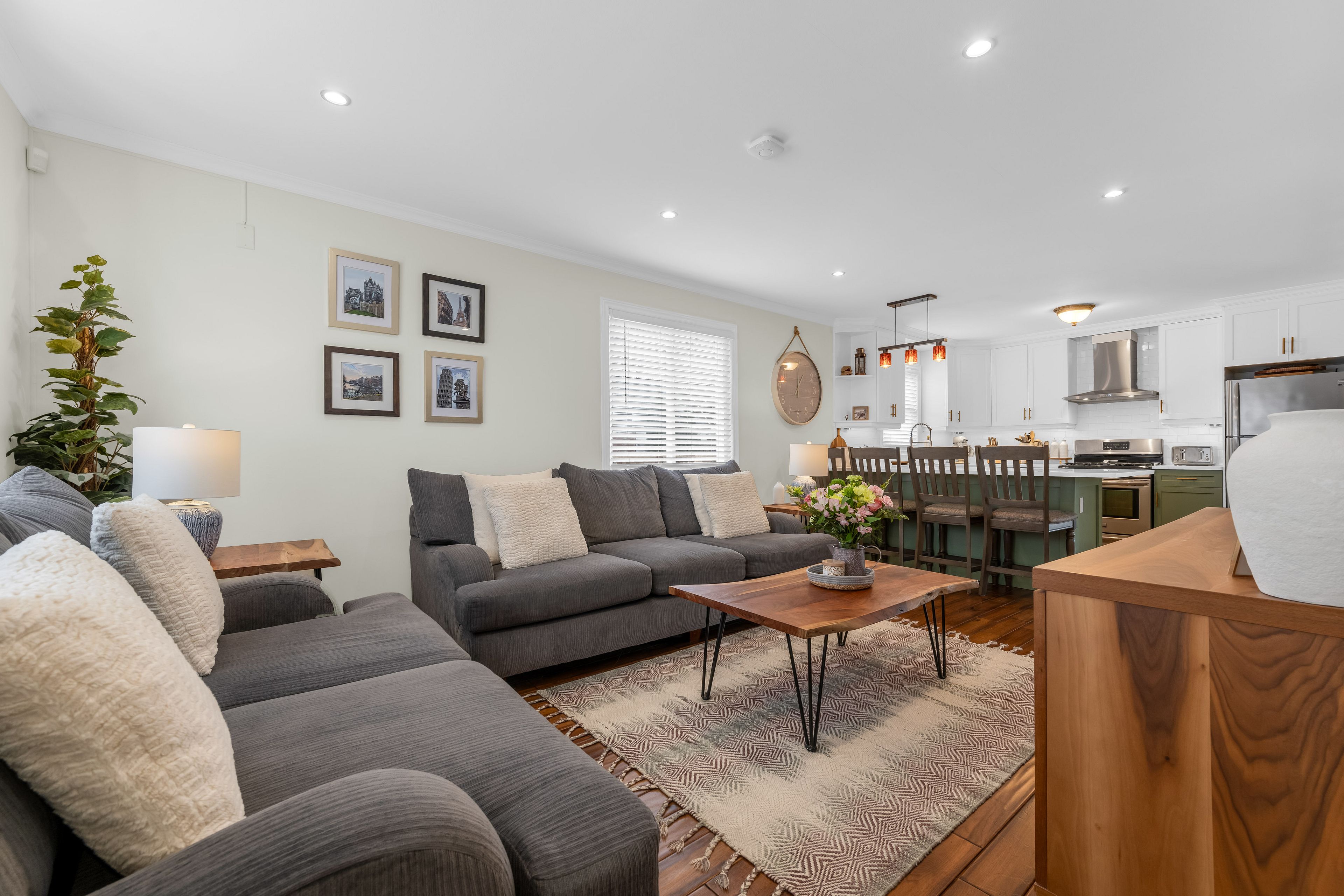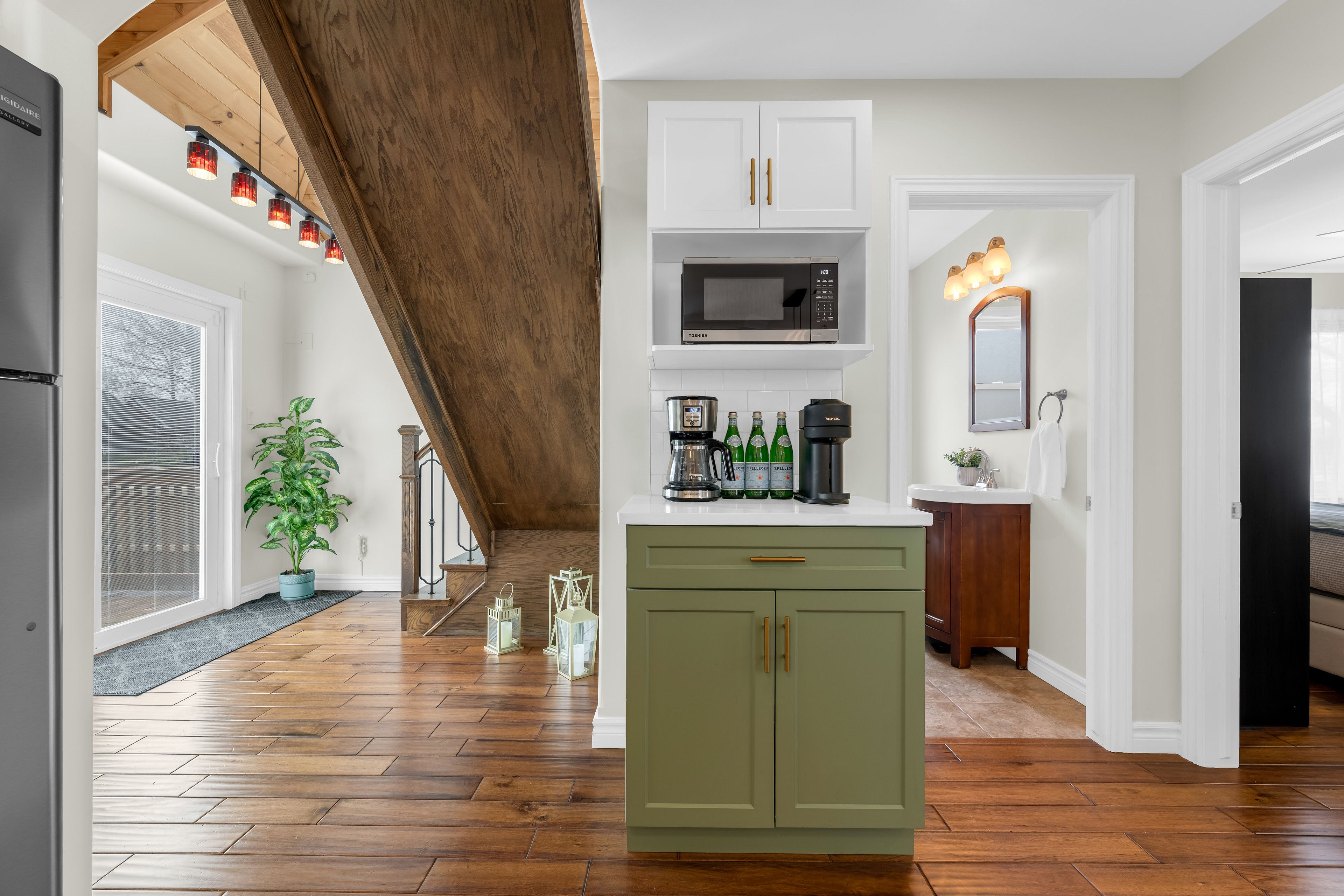 • Updated kitchen features quartz countertops and a convenient coffee station.