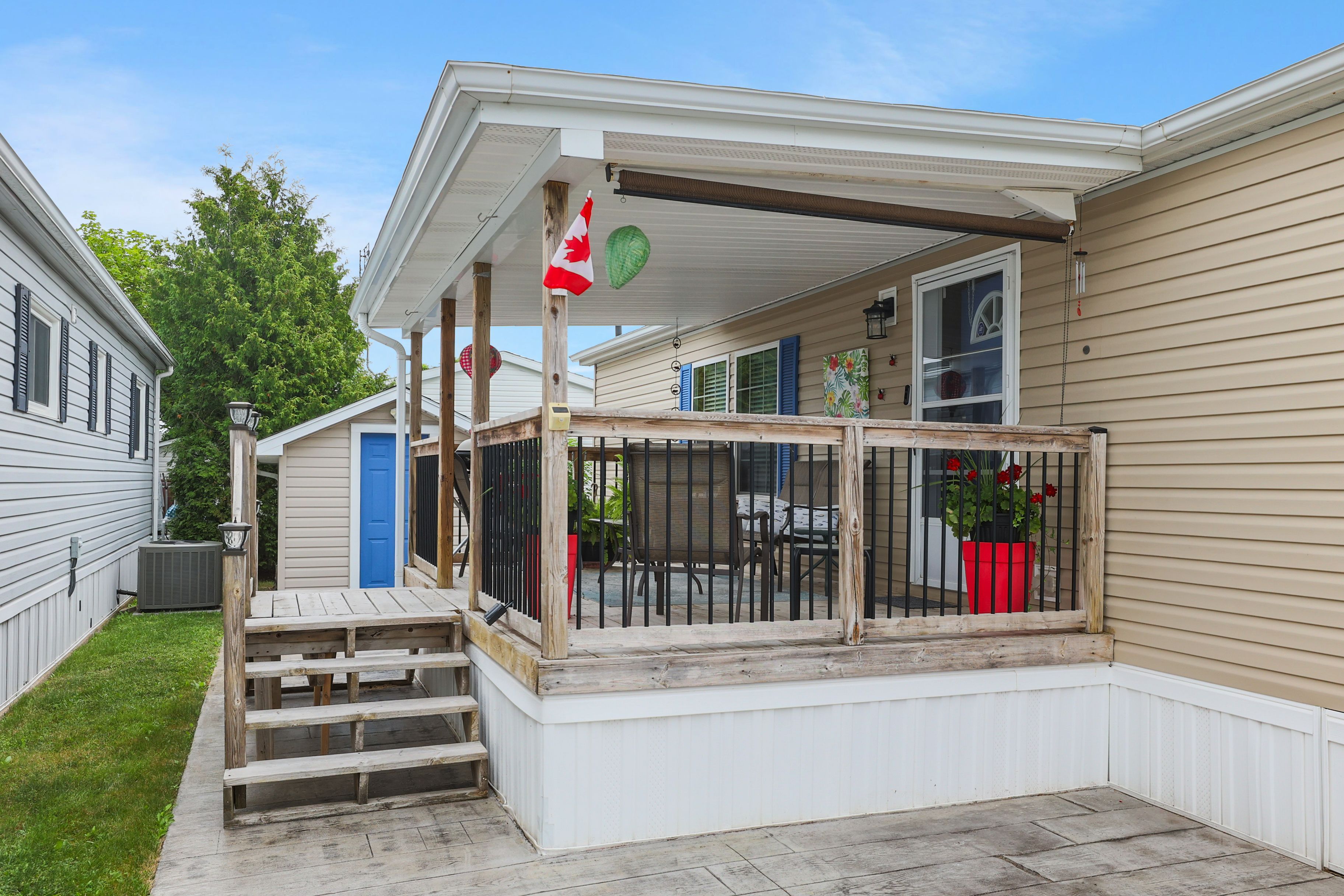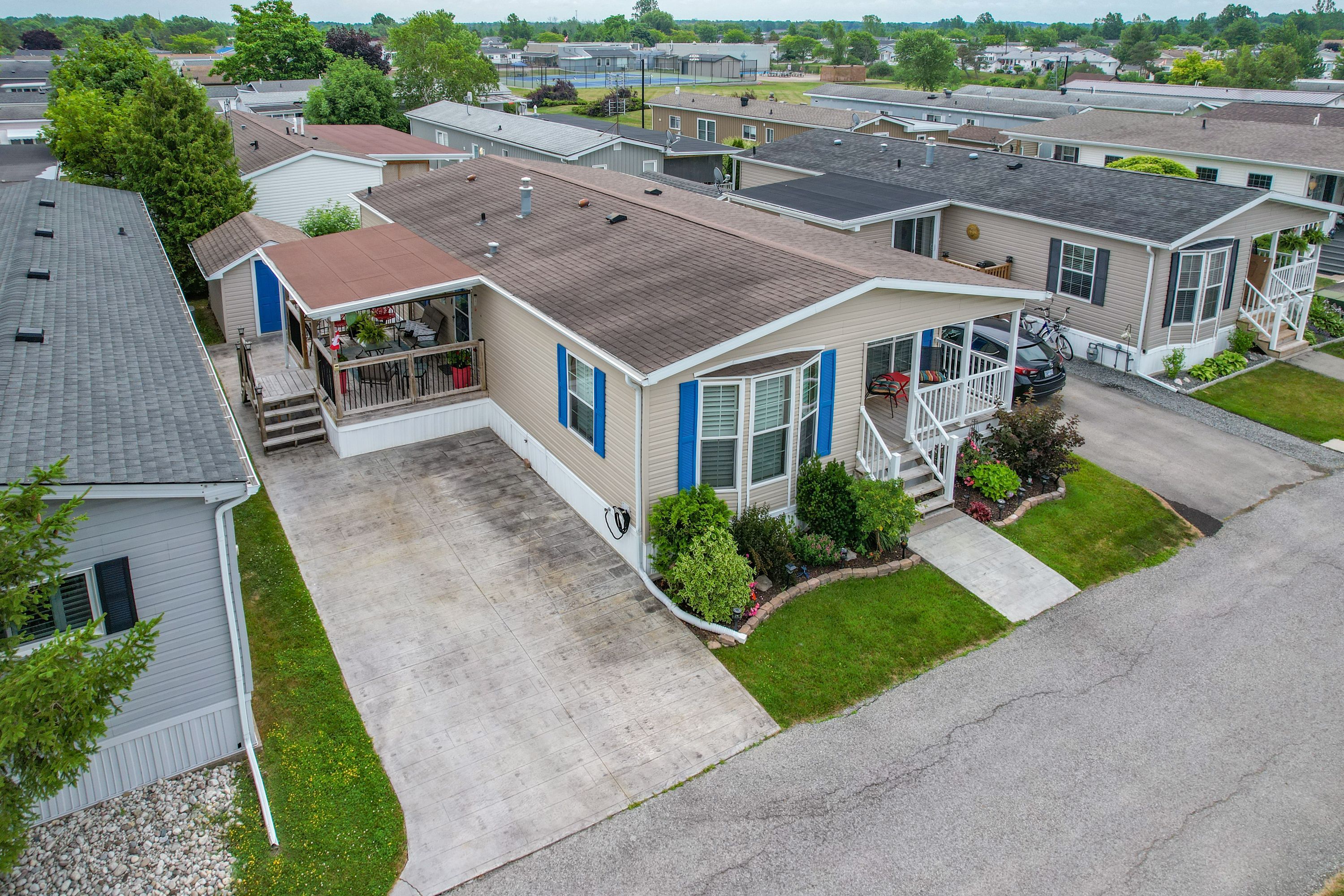 Bright & spacious bungalow ... Welcome to 107-3033 townline road (107 tamarack ave), nestled in the heart of stevensville's vibrant and welcoming adult lifestyle community - a perfect blend of comfort, convenience, and carefree living. This beautifully maintained 3-bedroom, 2-bathroom home offers 1284 sq ft of thoughtfully designed space that's ideal for those seeking a relaxed and active lifestyle. Step inside to find a bright, open concept layout featuring vaulted ceilings and california shutters throughout, a spacious living room with lovely accent wall, and flows seamlessly into the dining area and well-equipped kitchen - complete with a breakfast bar island, gas stove, and built-in microwave. The spacious primary suite is a private retreat with a walk-in closet and ensuite bath featuring a walk-in shower. Two additional bedrooms, a second full 4-pc bath, and a large linen closet offer plenty of room for guests or hobbies. Outside, enjoy your morning coffee on the covered front deck or unwind on the covered side deck with direct access from the laundry room. A walkway leads to a charming stamped concrete patio beside the garden shed, perfect for enjoying the outdoors, and continues all the way out front to the double wide stamped concrete driveway (2022). Additional features include leaf filter gutter protection (2021) and a welcoming low-maintenance exterior. Living here means more than just a beautiful home; it's a lifestyle. Enjoy full access to the community's incredible amenities: indoor/outdoor pools, sauna, clubhouse, shuffleboard, tennis/pickleball courts, fitness classes, and an active calendar of social events. If you're ready for low-maintenance living in a close-knit community that offers both peace and activity, this is your opportunity. Monthly fees $1113. 36 ($850. 00 land lease + $263. 36 estimated taxes). Click on multimedia for virtual tour, drone photos & more.