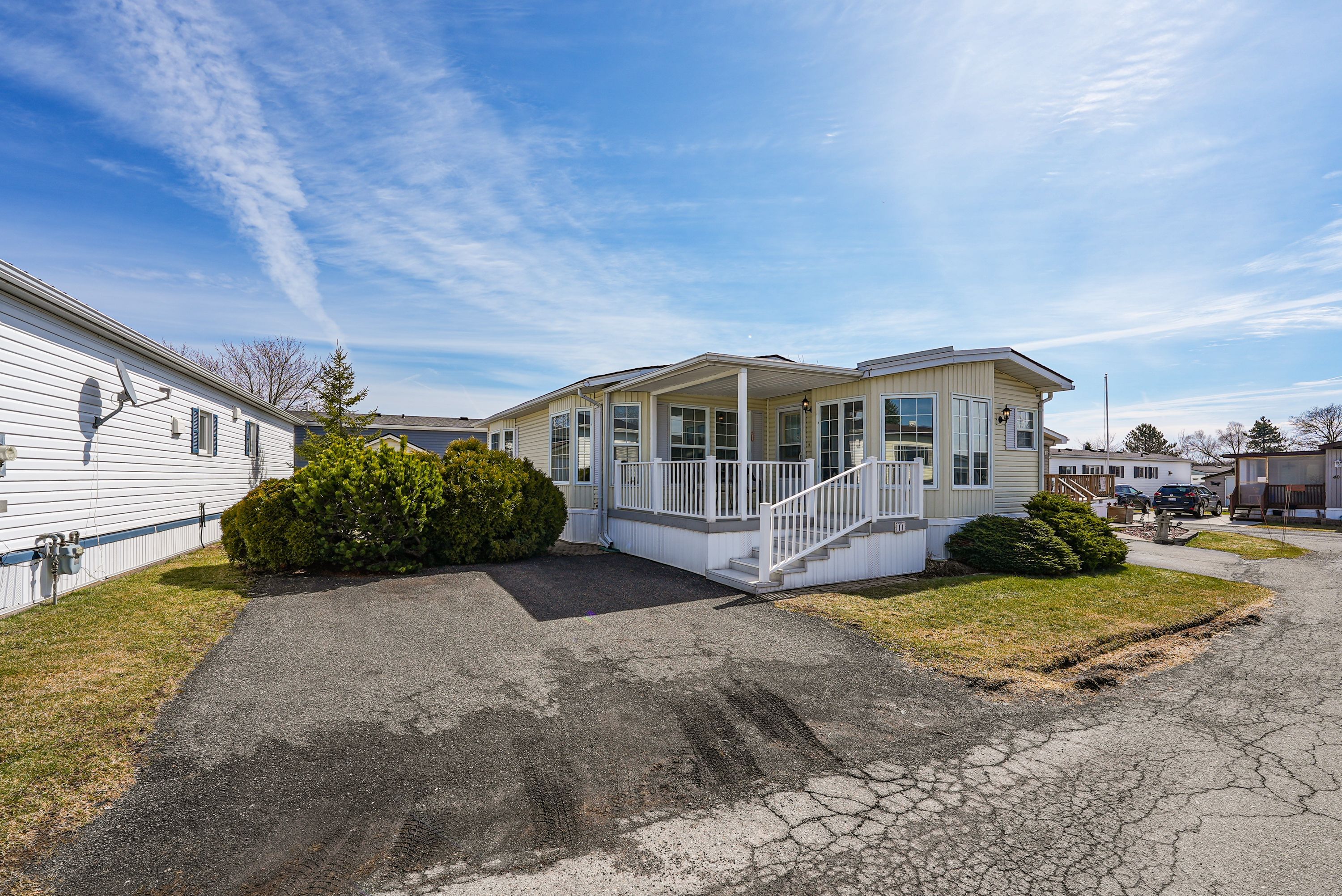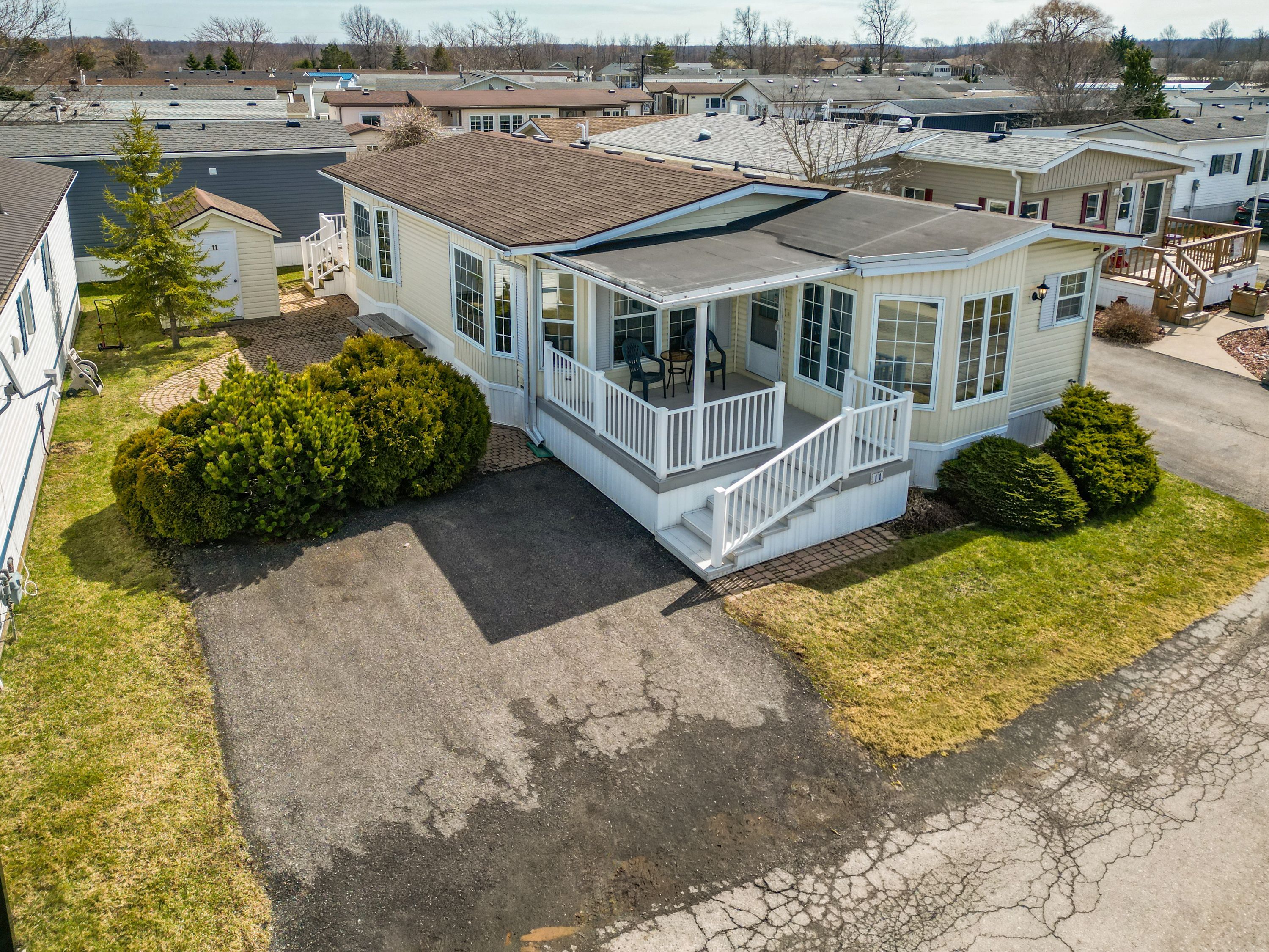 Easy living ... Comfort, simplicity & lifestyle come together at 11-3033 townline road (11 elmtree hollow), set within the sought-after black creek adult lifestyle community in stevensville. This well-maintained 1325 sq ft northlander modular home offers a functional, easy-flow layout designed for everyday living. Entry from the covered porch leads directly into a bright, eat-in kitchen that naturally anchors the home. From here, the layout opens into two generous living areas, currently configured as a formal dining room and living room, offering flexibility to tailor the space to your needs. This home features 2 bedrooms and a full 4-pc bathroom with a large linen closet plus convenient ensuite privilege from the primary bedroom. The hallway in the primary is thoughtfully designed with additional storage, including a double closet and vanity area, while the second bedroom offers its own double closet, as well. Laundry is located within the hallway for everyday ease. Step outside to enjoy a nicely sized yard with patio space - perfect for quiet mornings or casual outdoor living - along with a well-sized shed for added storage or hobbies. Mechanical updates include a furnace (2025) and hot water heater (2012), adding confidence to your investment. Living here means more than just a home - it's a lifestyle. Residents enjoy access to an impressive lineup of community amenities, including indoor & outdoor pools, sauna, clubhouse, shuffleboard, tennis/pickleball courts, fitness classes, and a vibrant calendar of social events. It's a welcoming, close-knit community that offers the perfect balance of activity and tranquility. With monthly fees of $982. 69 ($850. 00 land lease + $132. 69 estimated taxes), this is an ideal opportunity for those seeking low-maintenance living in a well-established adult community - where comfort, convenience, and connection come together. Click on multimedia for virtual tour, drone photos & more.
