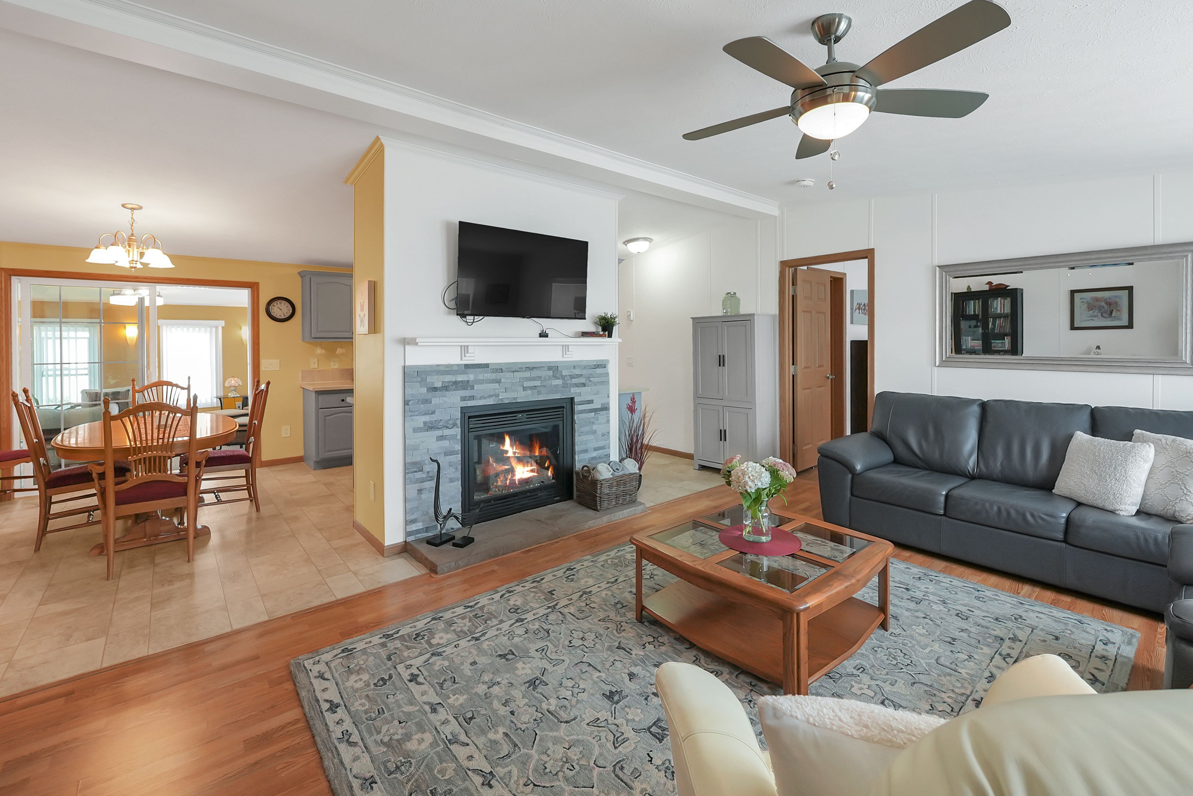 • Spacious home featuring a cozy living room with a refaced fireplace.