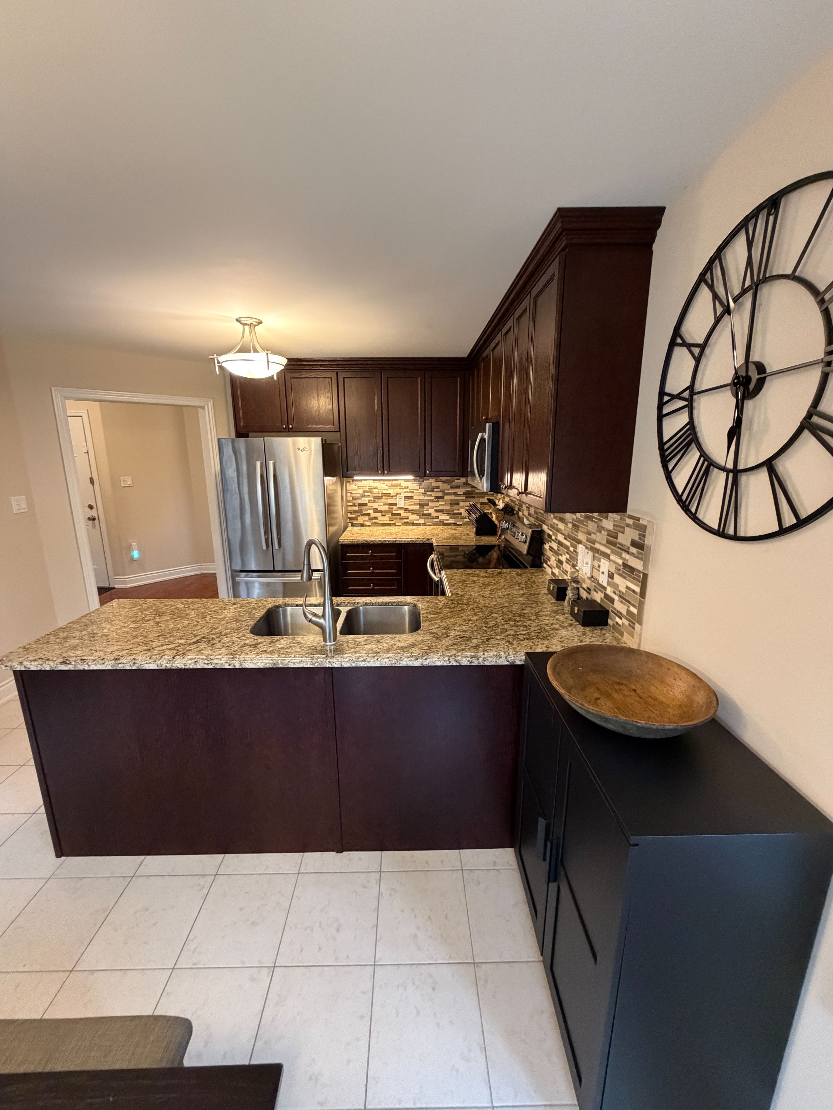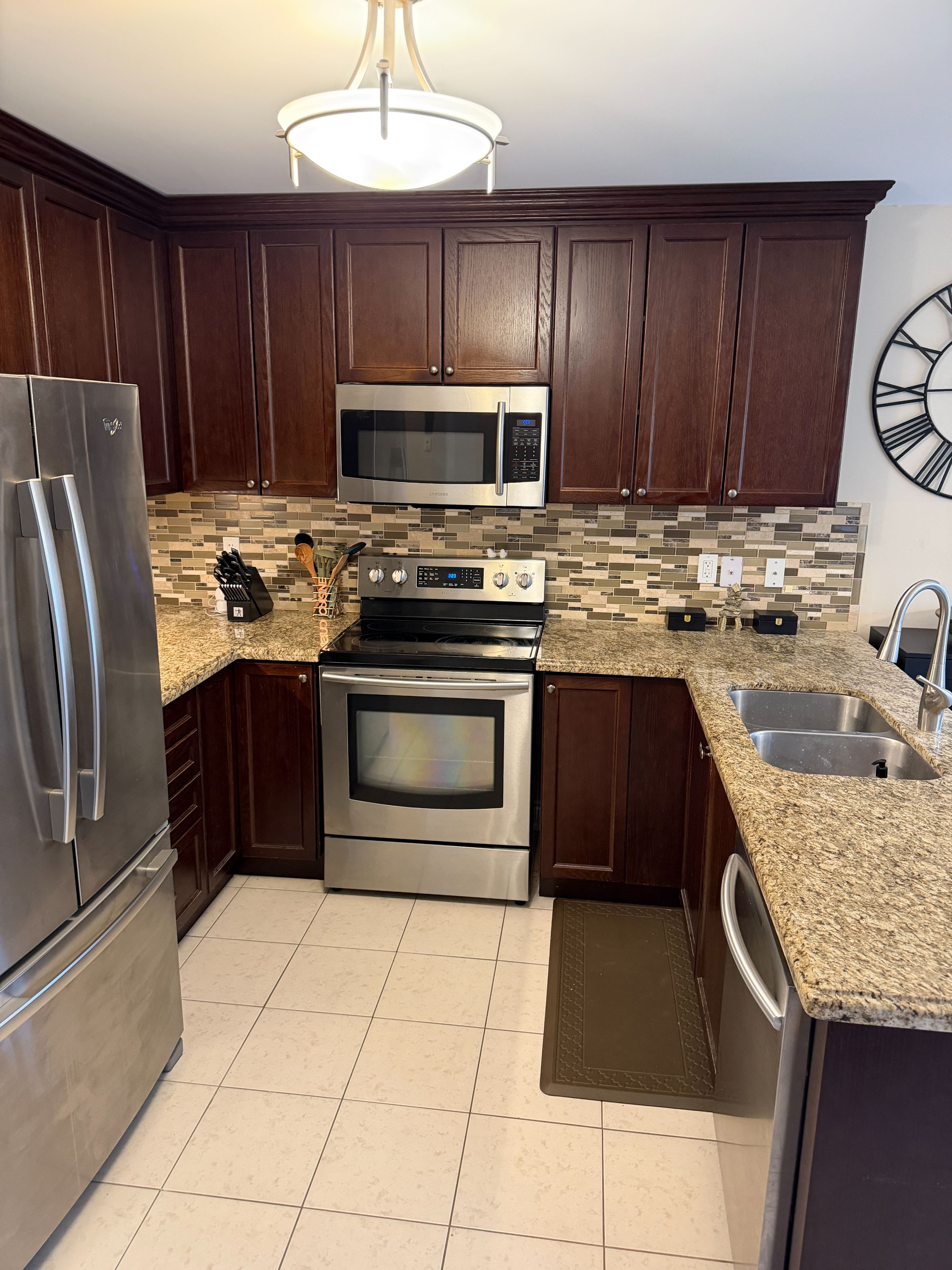 • Bright kitchen with granite counters and stainless steel appliances.