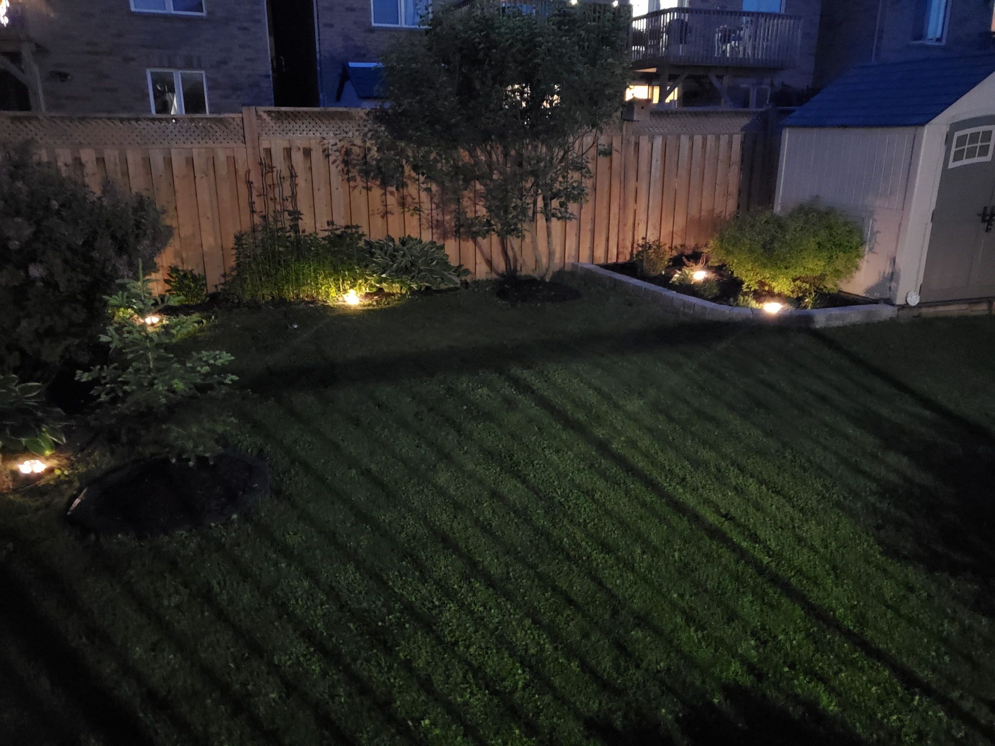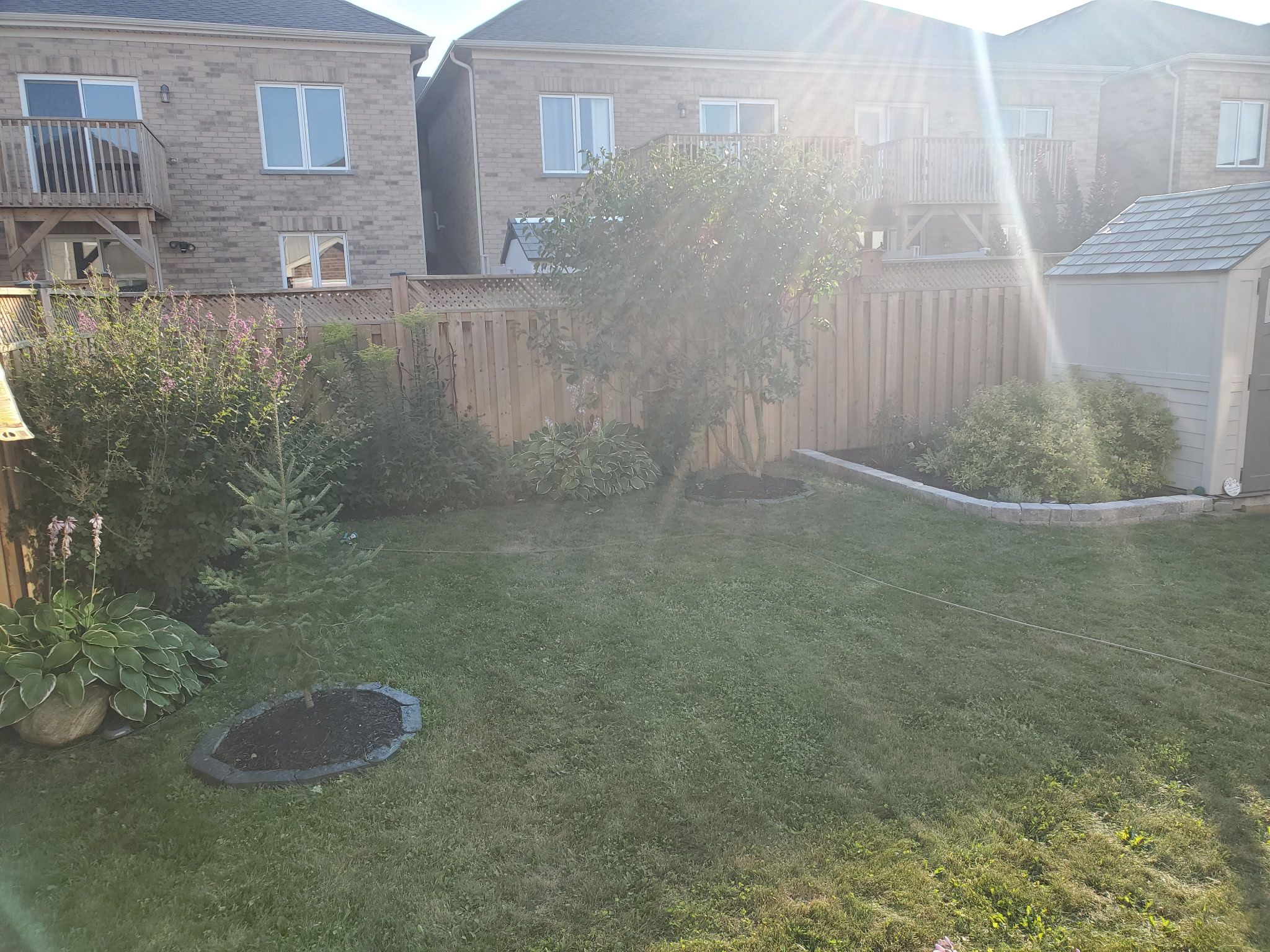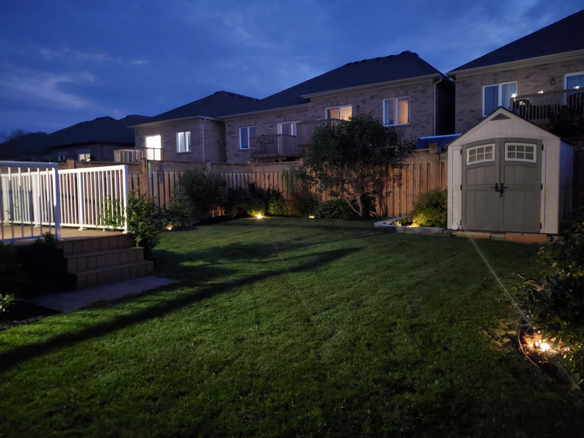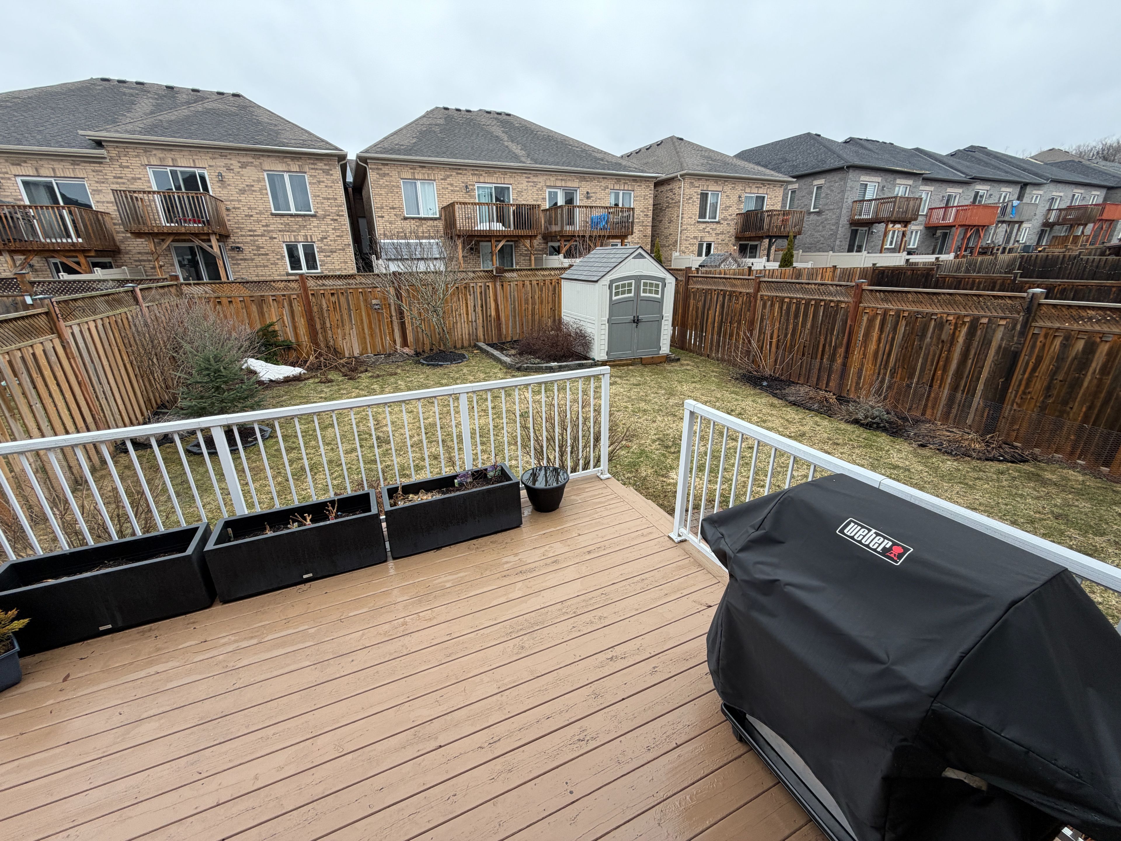 • Professionally landscaped backyard with a wooden deck and gardens.
