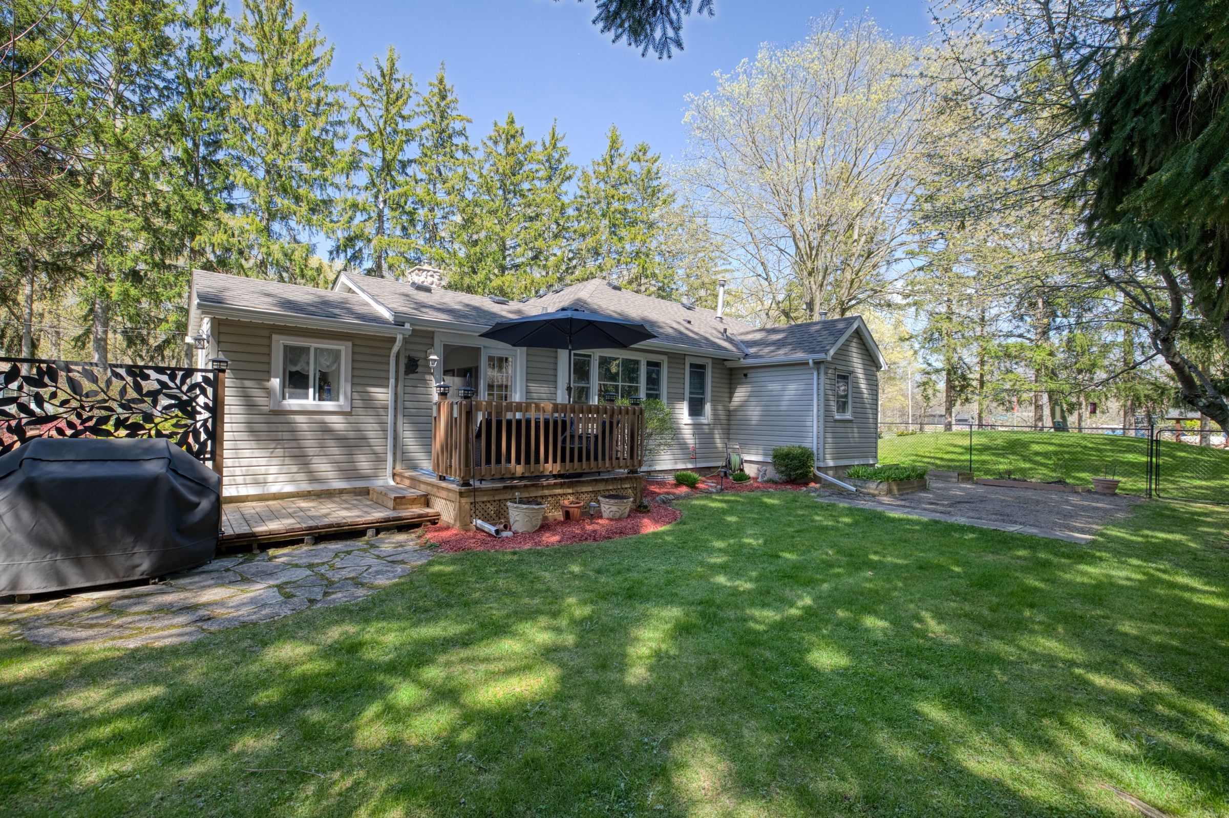 Tucked away in a quiet, secluded setting in ridgeway, this expansive 200ft x 120ft property offers exceptional privacy surrounded by mature trees, nature, and abundant wildlife - a peaceful retreat that feels like cottage living year-round. With nearly 1,500 sq ft of living space, this well-maintained bungalow features a bright, inviting layout enhanced by vaulted ceilings, hardwood floors, and large windows that bring the outdoors in. The living room is anchored by a beautiful wood-burning fireplace with a stone surround, creating a warm and welcoming focal point. The updated kitchen includes a breakfast nook, while the dining area offers a walk-out to the back deck, perfect for indoor-outdoor living. The main floor includes three bedrooms, one of which has a bonus office space; as well as a 4-piece bathroom (2022), a convenient 2-piece bathroom, and main-floor laundry. Step outside to enjoy a thoughtfully designed outdoor space featuring a rear deck, garden shed, and a stunning firepit area lined with evergreen shrubs-ideal for relaxing evenings under the stars. The detached 1. 5-car garage (built 2020) includes its own 30-amp hydro panel, offering excellent versatility for hobbies or storage. Recent updates provide added peace of mind, including roof shingles, eavestroughs, and downspouts (2022), paved driveway (2020), fridge and stove (2020), washer and dryer (2023), dishwasher (2024), and a firman tri-fuel generator with 100-amp neutral connector (2024). Enjoy regular sightings of deer, birds, and other wildlife from your deck, around the firepit, or through the home's expansive windows. Located just minutes from bernard beach, the friendship trail, and the lake erie shoreline, with easy access to downtown ridgeway, crystal beach, and fort erie's amenities, this property offers the perfect blend of nature and convenience.