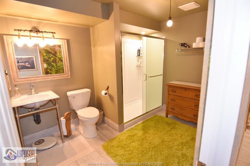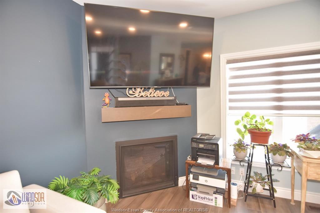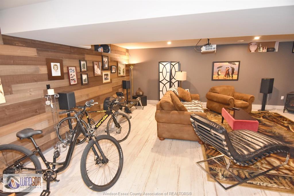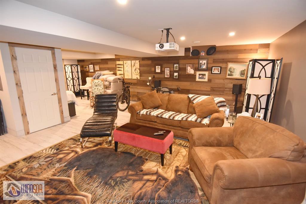 • Finished basement with a cozy fireplace and movie screen.