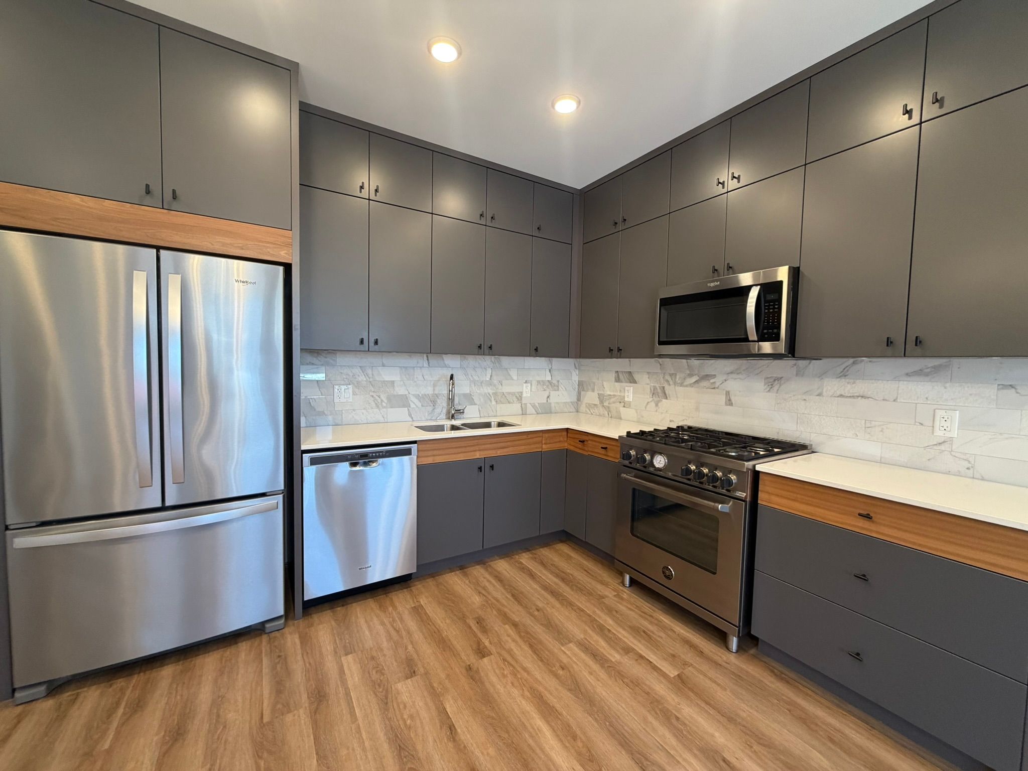 • Stylish kitchen with stainless steel appliances and quartz countertops.