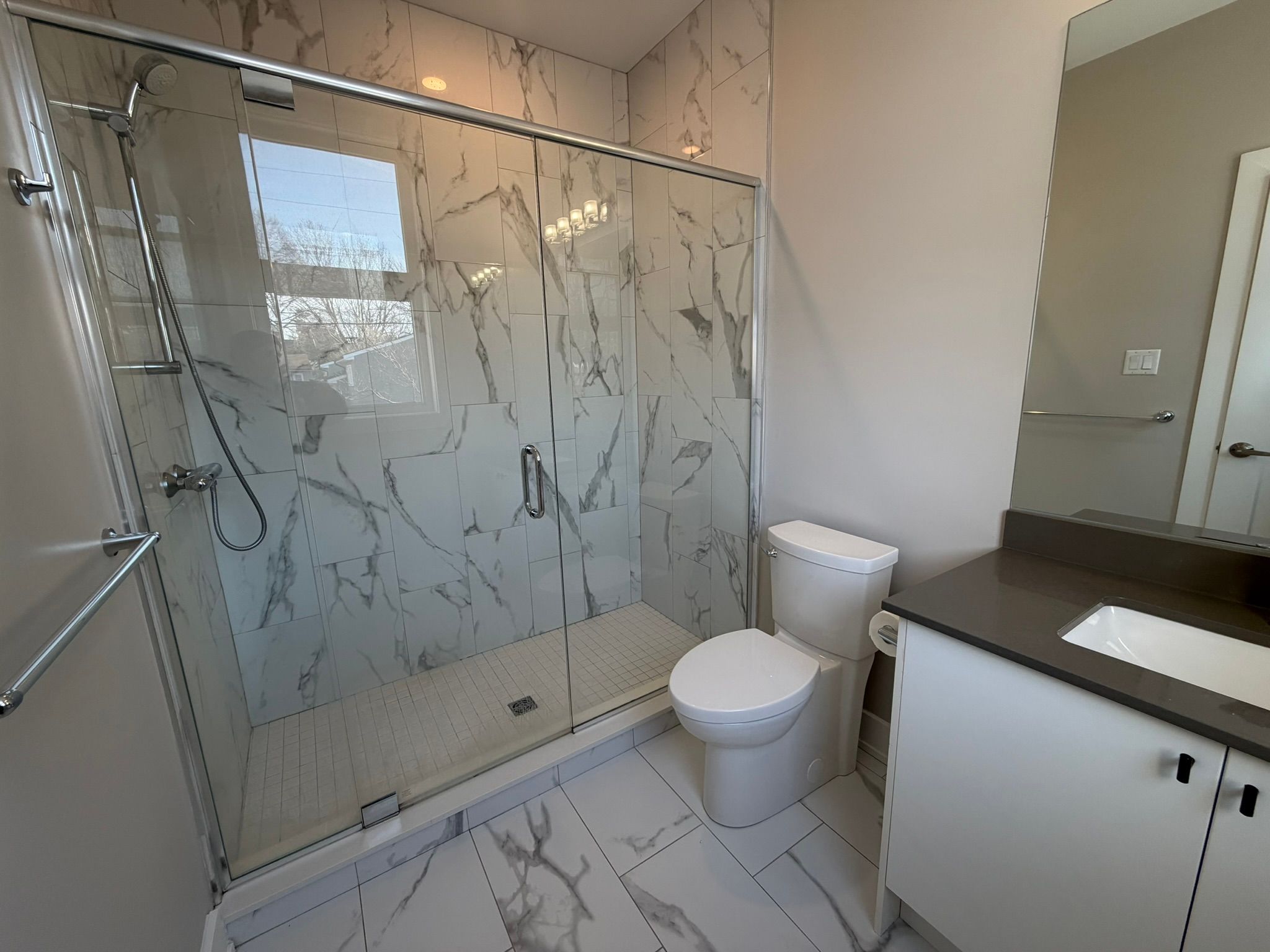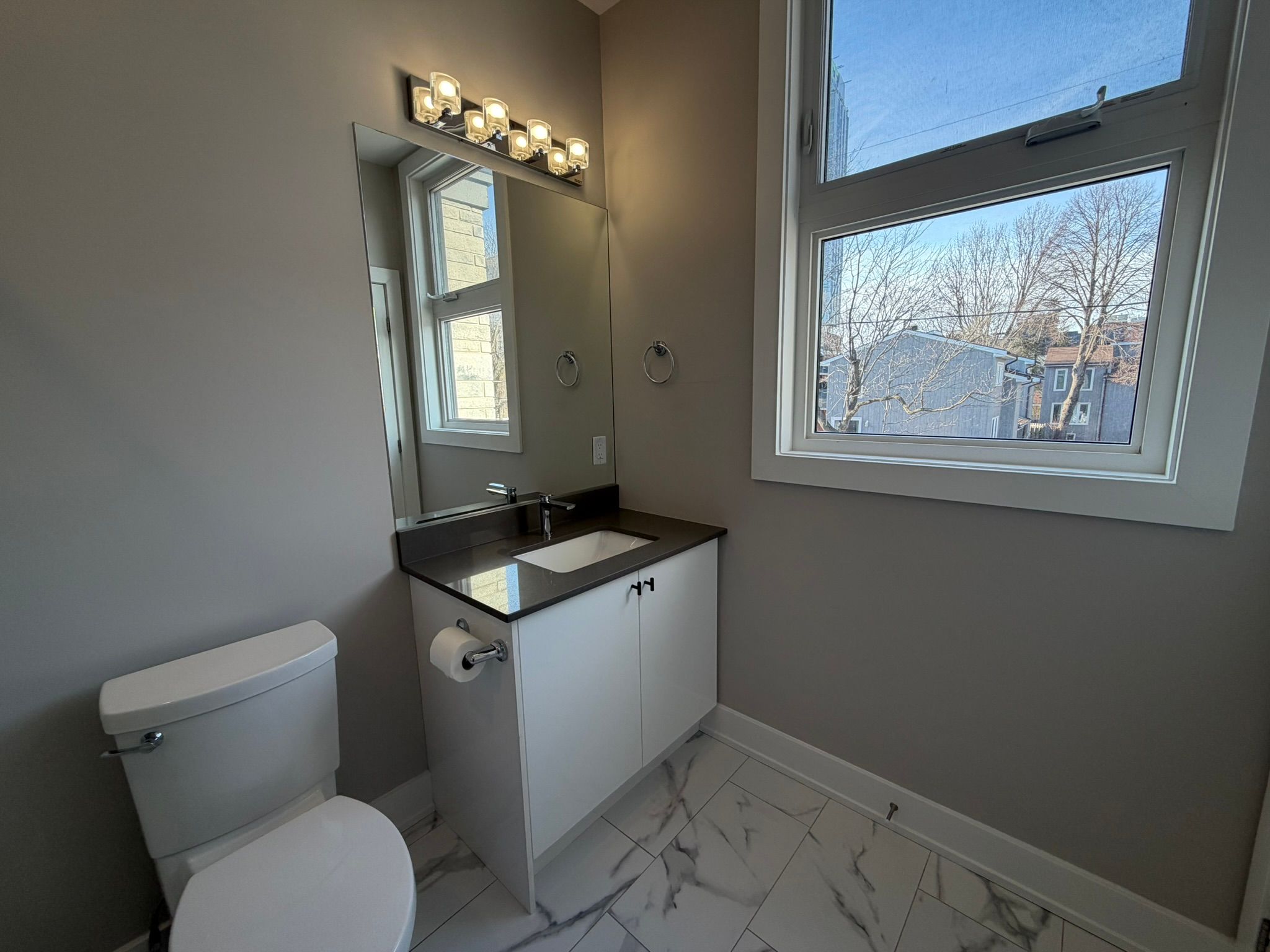 • Spacious primary bedroom with big windows and an ensuite bathroom.